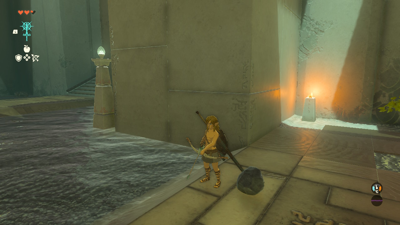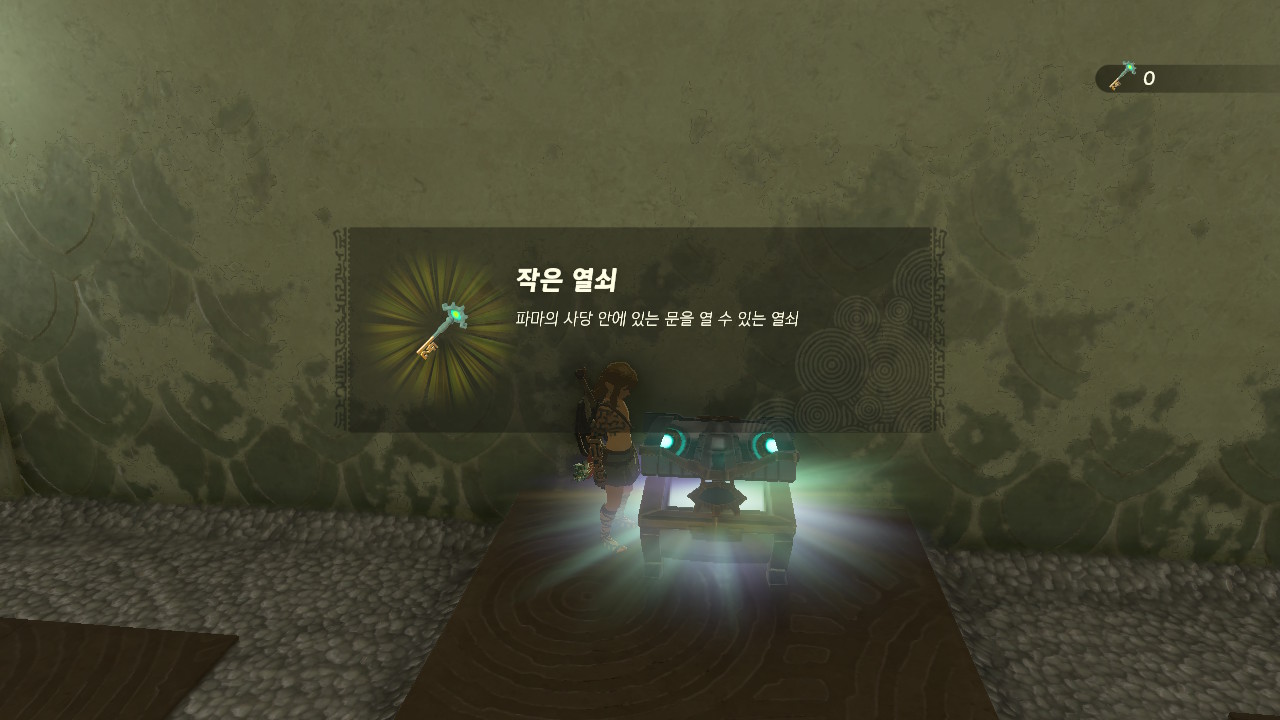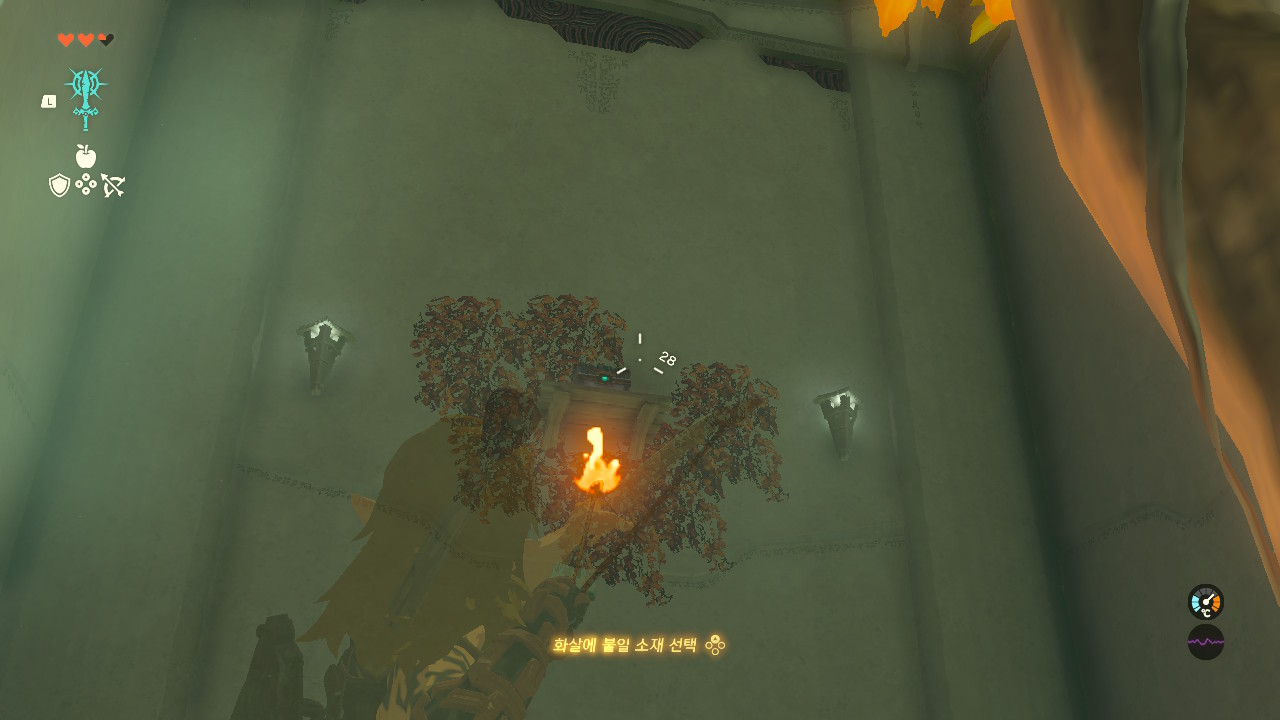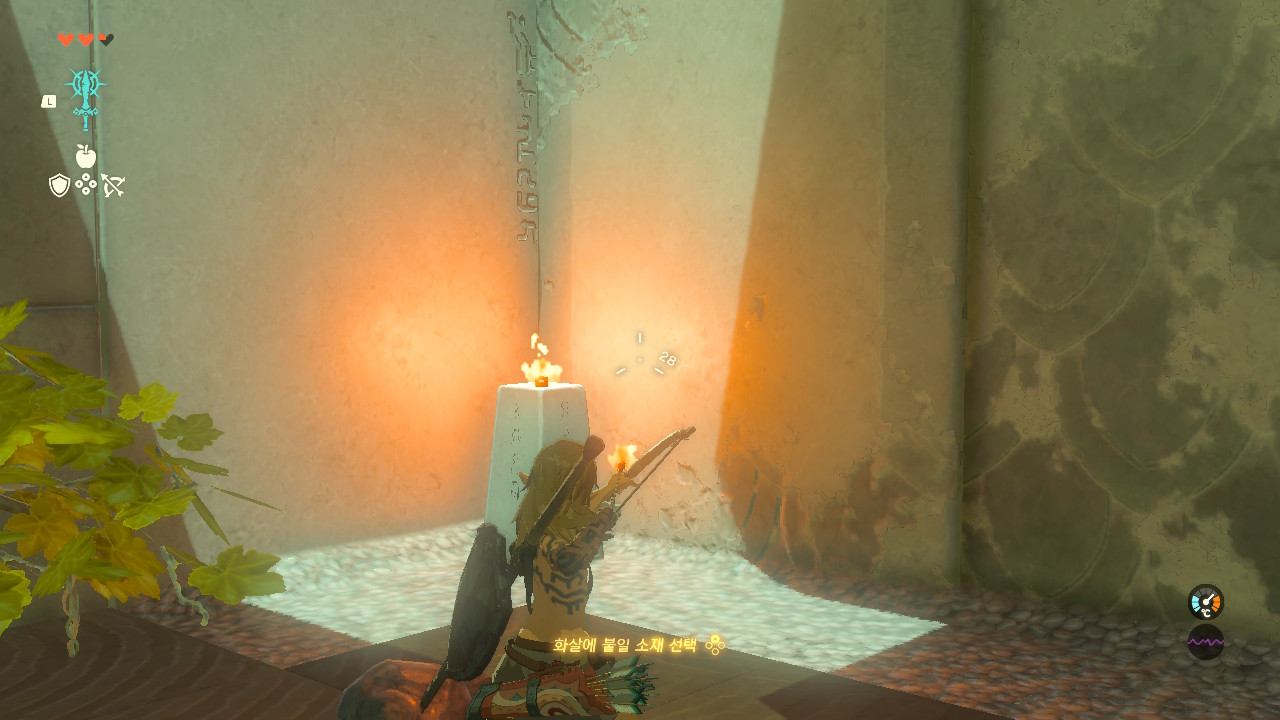 중간 부분에서 활과 화살이 파밍되면 화살에 불을 붙여 저 멀리 있는 벽 넝쿨을 맞추어 불을 질러 보물 상자를 떨어트리면 열쇠를 얻을 수 있다!