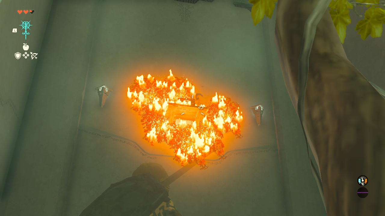 중간 부분에서 활과 화살이 파밍되면 화살에 불을 붙여 저 멀리 있는 벽 넝쿨을 맞추어 불을 질러 보물 상자를 떨어트리면 열쇠를 얻을 수 있다!