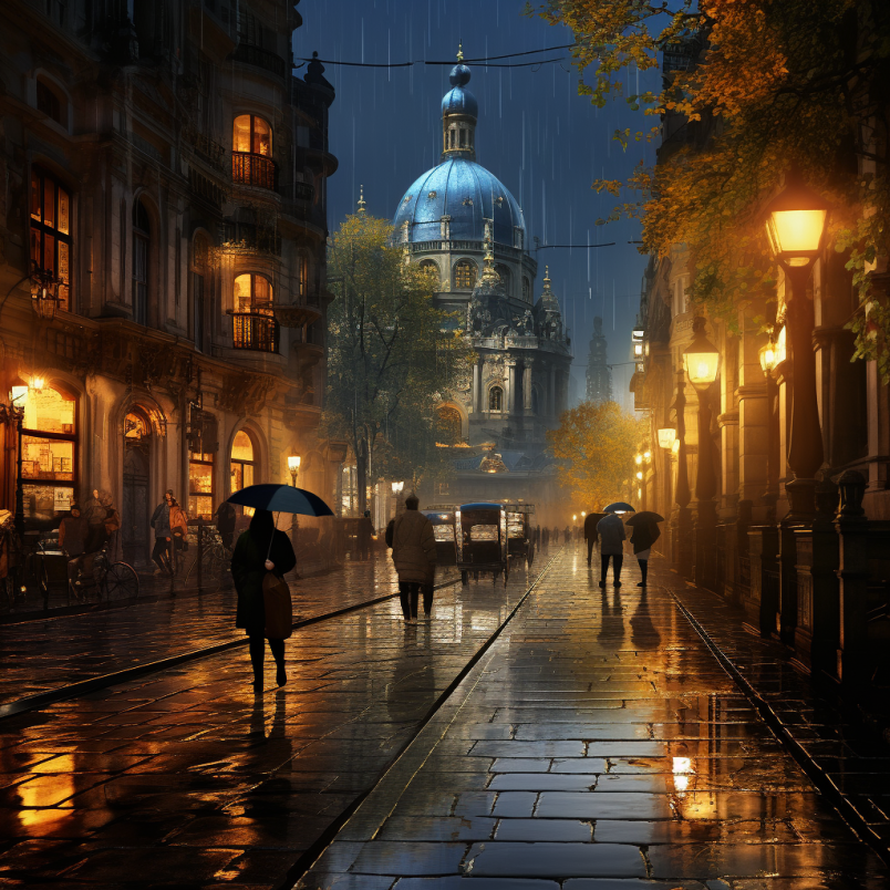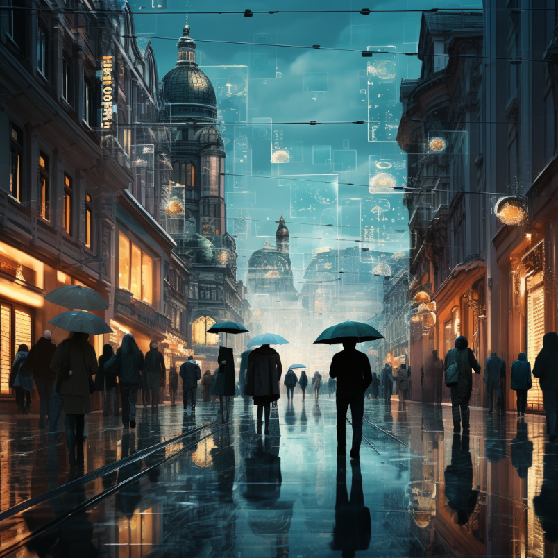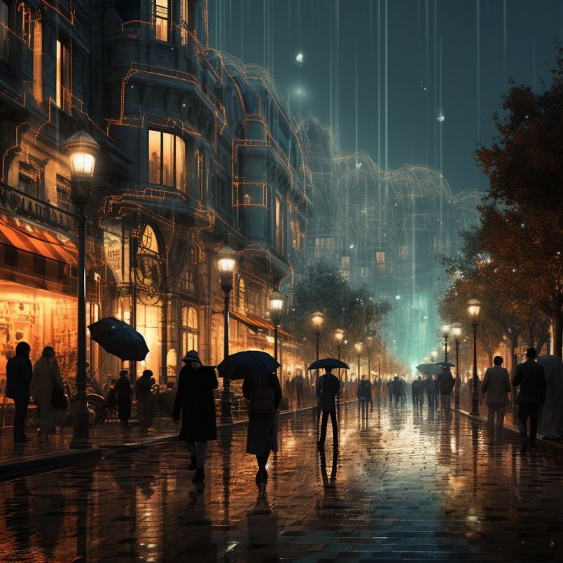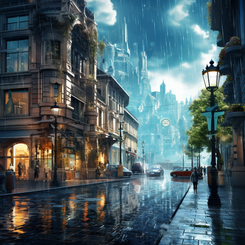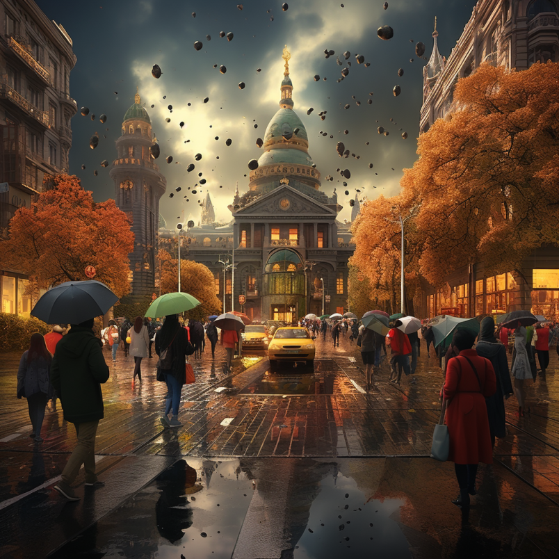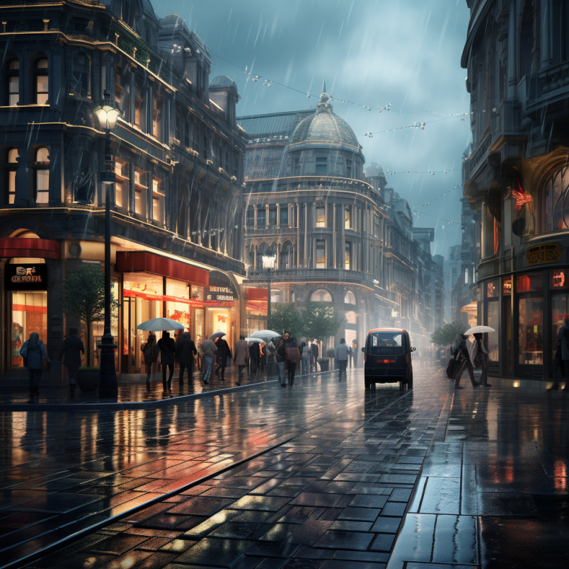 비 오는 장면 거리와 건물에 있는 사람들 이미지