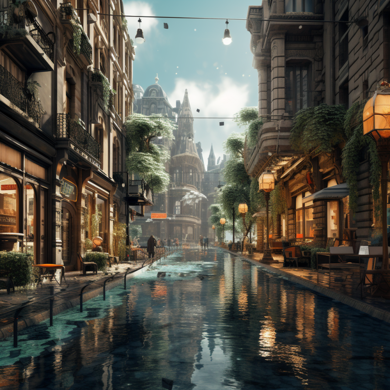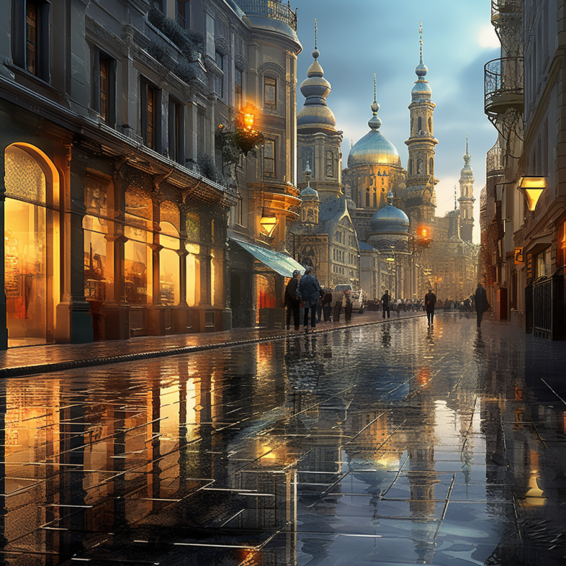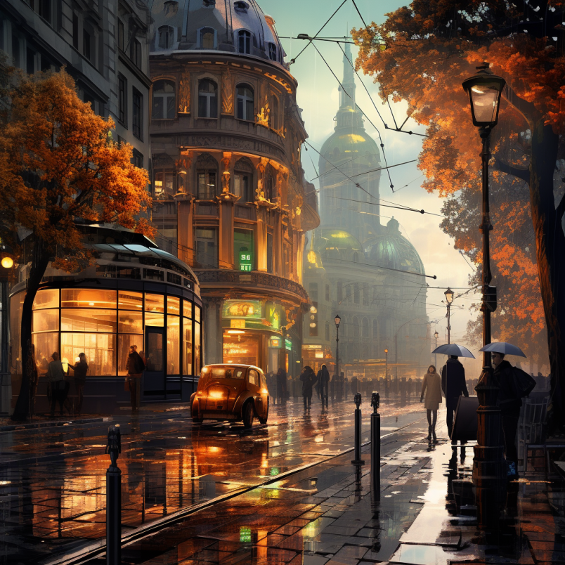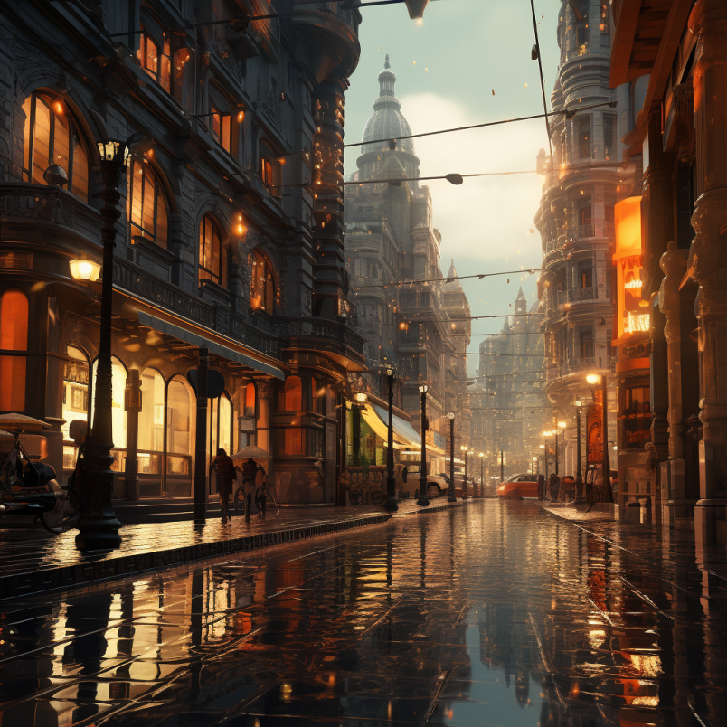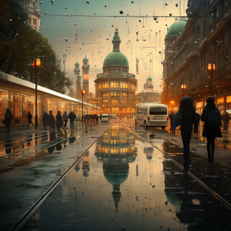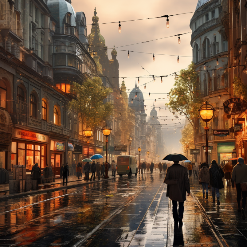 비 오는 장면 거리와 건물에 있는 사람들 이미지