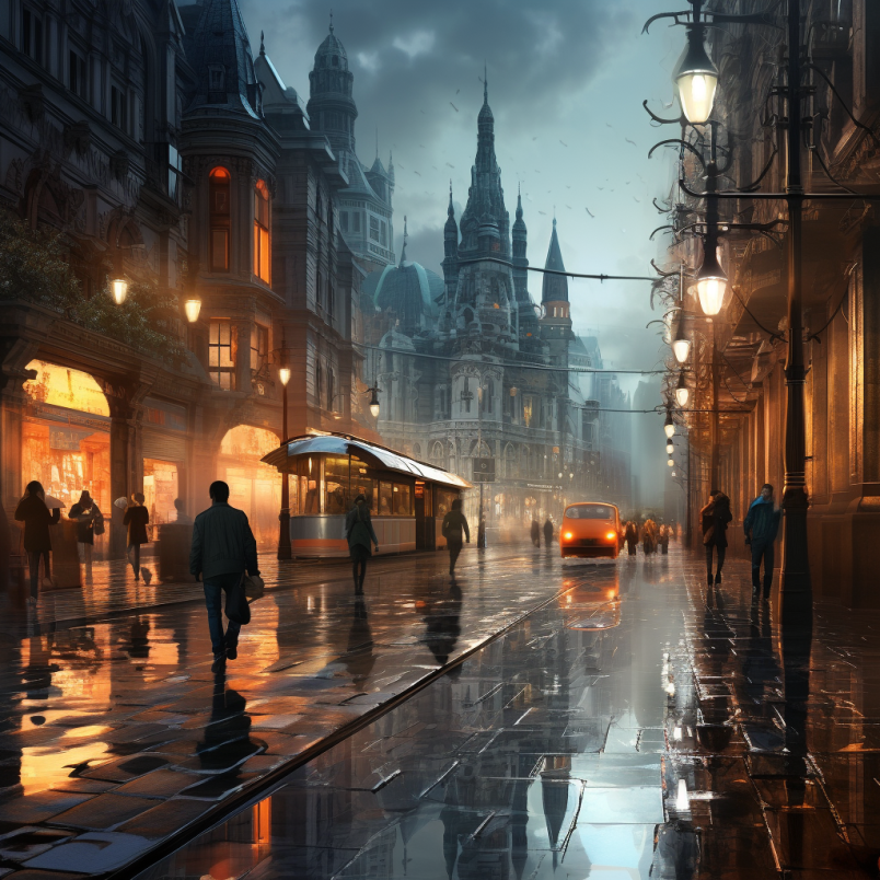 비 오는 장면 거리와 건물에 있는 사람들 이미지