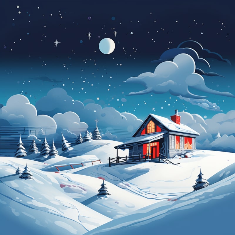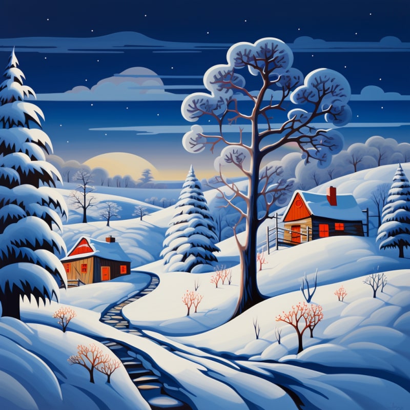 the day before christmas, in the style of graphic illustrations, cabincore, realistic blue skies, anti-clutter, minimalist designs, xmaspunk, martiros saryan, storybook-esque