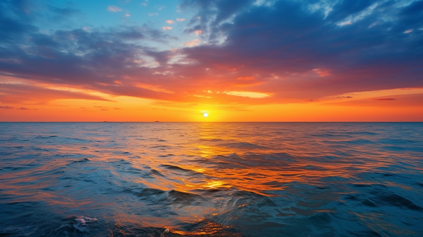 A majestic view of the first sunrise of the New Year, with the sun appearing larger and more prominent over a blue ocean. The sun, brilliant and radiant, takes center stage in the sky, casting a golden glow across the water. The sky around the sun is a mix of fiery oranges and soft yellows, creating a dramatic contrast with the calm blue ocean. Gentle waves softly ripple, reflecting the sun's light. The atmosphere is peaceful yet awe-inspiring, emphasizing the grandeur of the sunrise. --ar 16:9