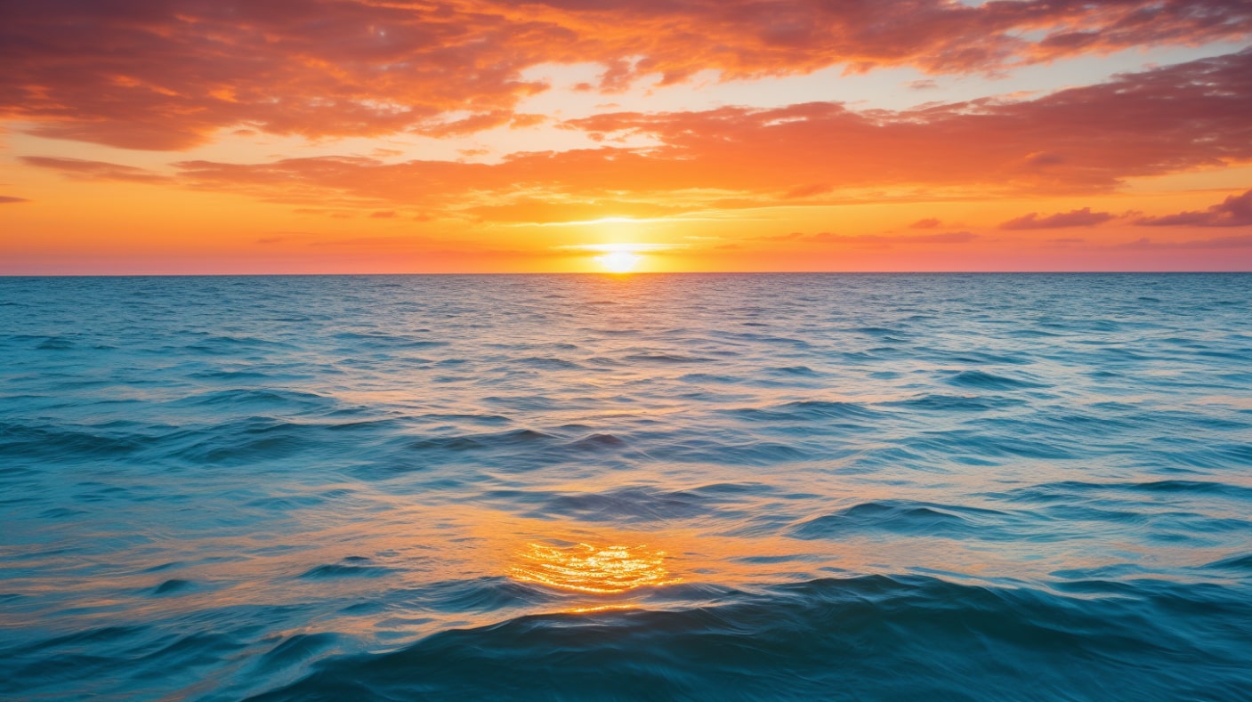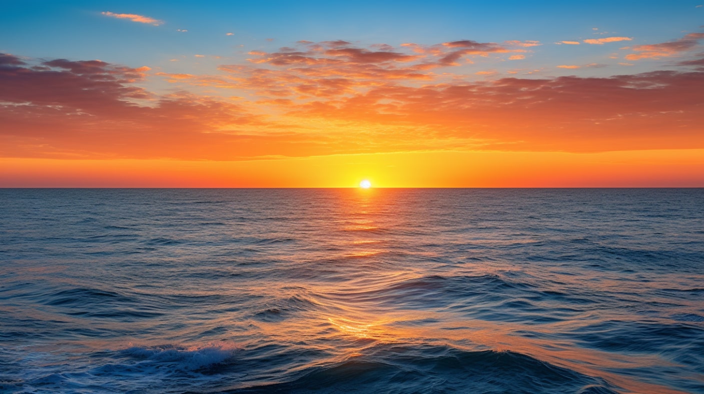 A majestic view of the first sunrise of the New Year, with the sun appearing larger and more prominent over a blue ocean. The sun, brilliant and radiant, takes center stage in the sky, casting a golden glow across the water. The sky around the sun is a mix of fiery oranges and soft yellows, creating a dramatic contrast with the calm blue ocean. Gentle waves softly ripple, reflecting the sun's light. The atmosphere is peaceful yet awe-inspiring, emphasizing the grandeur of the sunrise. --ar 16:9