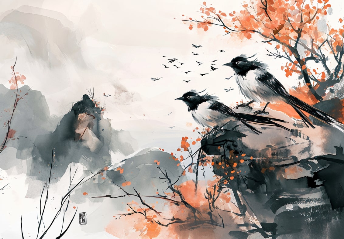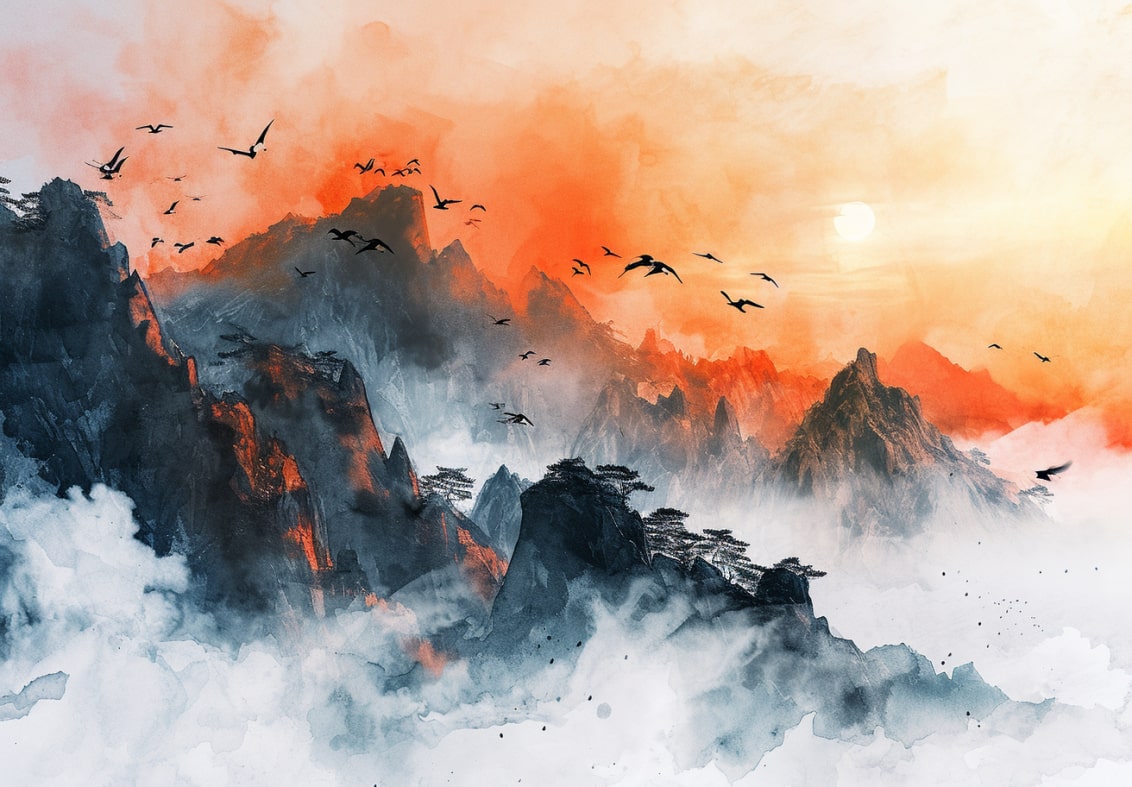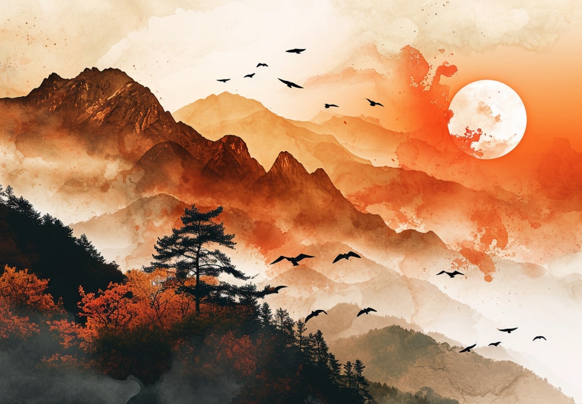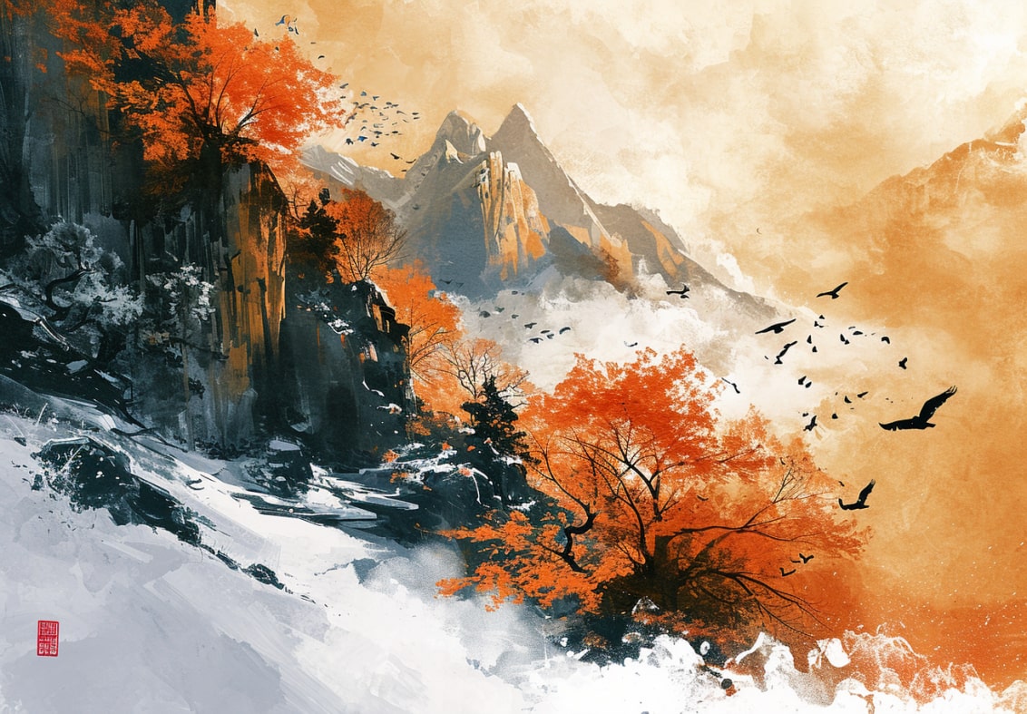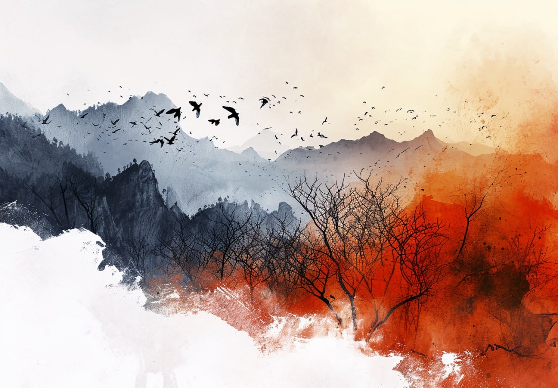 korean new year / auspicious birds, in the style of abstract landscape, dark white and dark orange, photo-realistic landscapes, aquarellist, mountainous vistas, 3840x2160, poster --ar 125:87 --v 6.0
