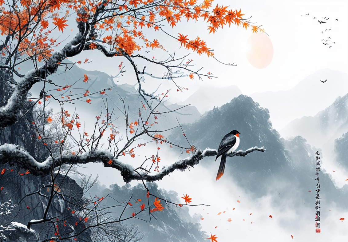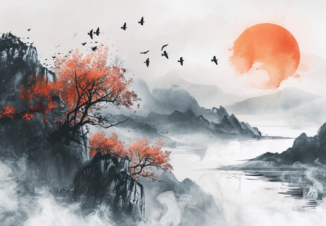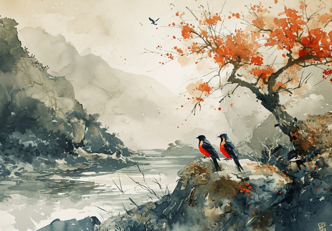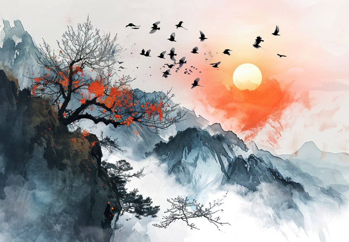 korean new year / auspicious birds, in the style of abstract landscape, dark white and dark orange, photo-realistic landscapes, aquarellist, mountainous vistas, 3840x2160, poster --ar 125:87 --v 6.0