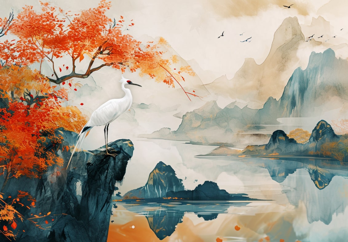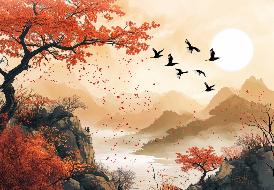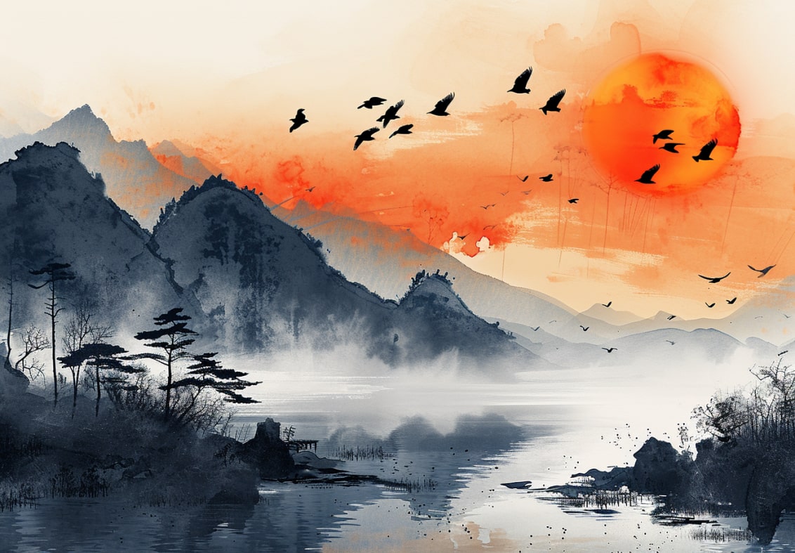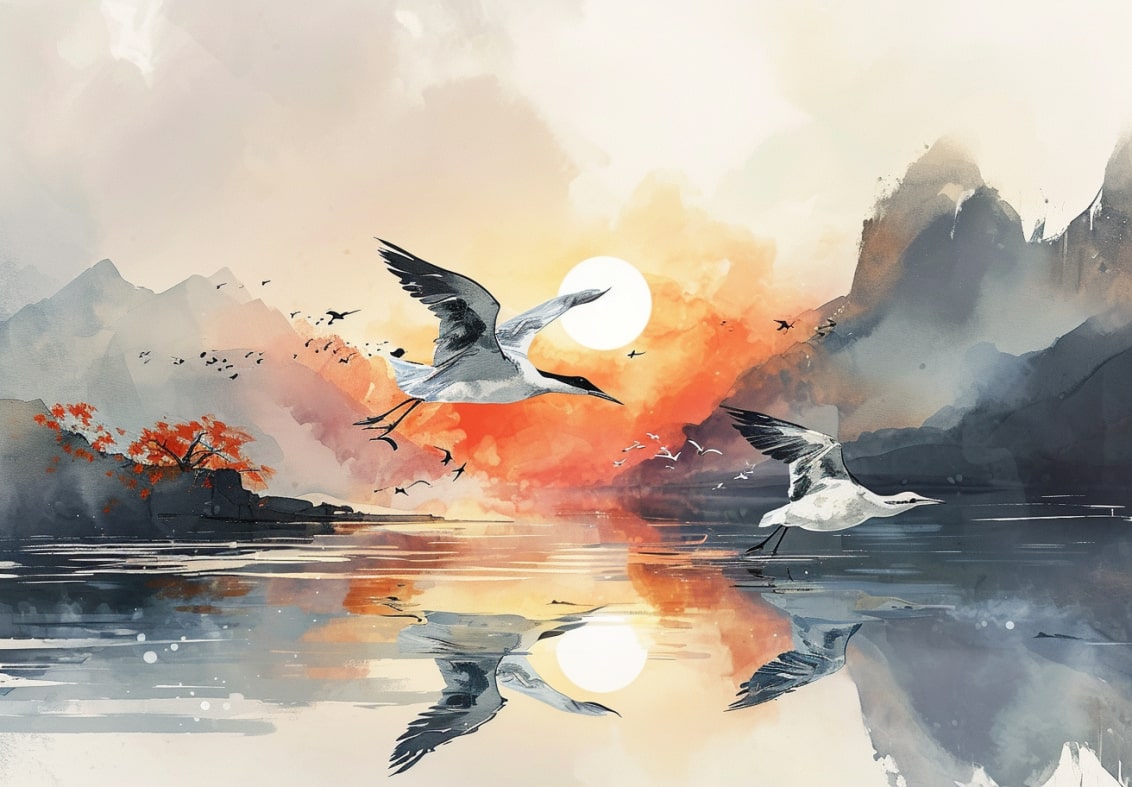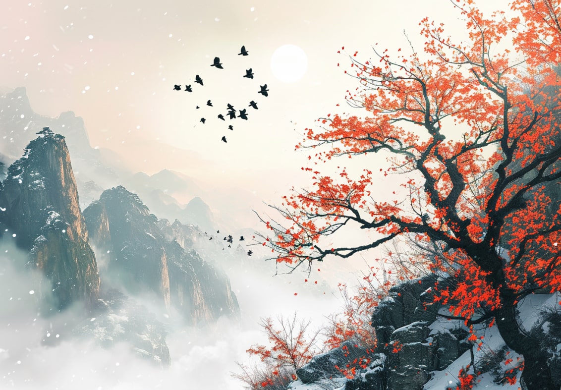 korean new year / auspicious birds, in the style of abstract landscape, dark white and dark orange, photo-realistic landscapes, aquarellist, mountainous vistas, 3840x2160, poster --ar 125:87 --v 6.0