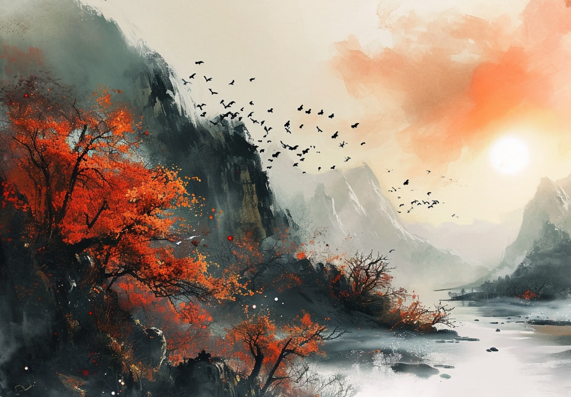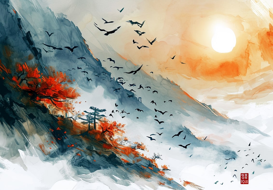 korean new year / auspicious birds, in the style of abstract landscape, dark white and dark orange, photo-realistic landscapes, aquarellist, mountainous vistas, 3840x2160, poster --ar 125:87 --v 6.0