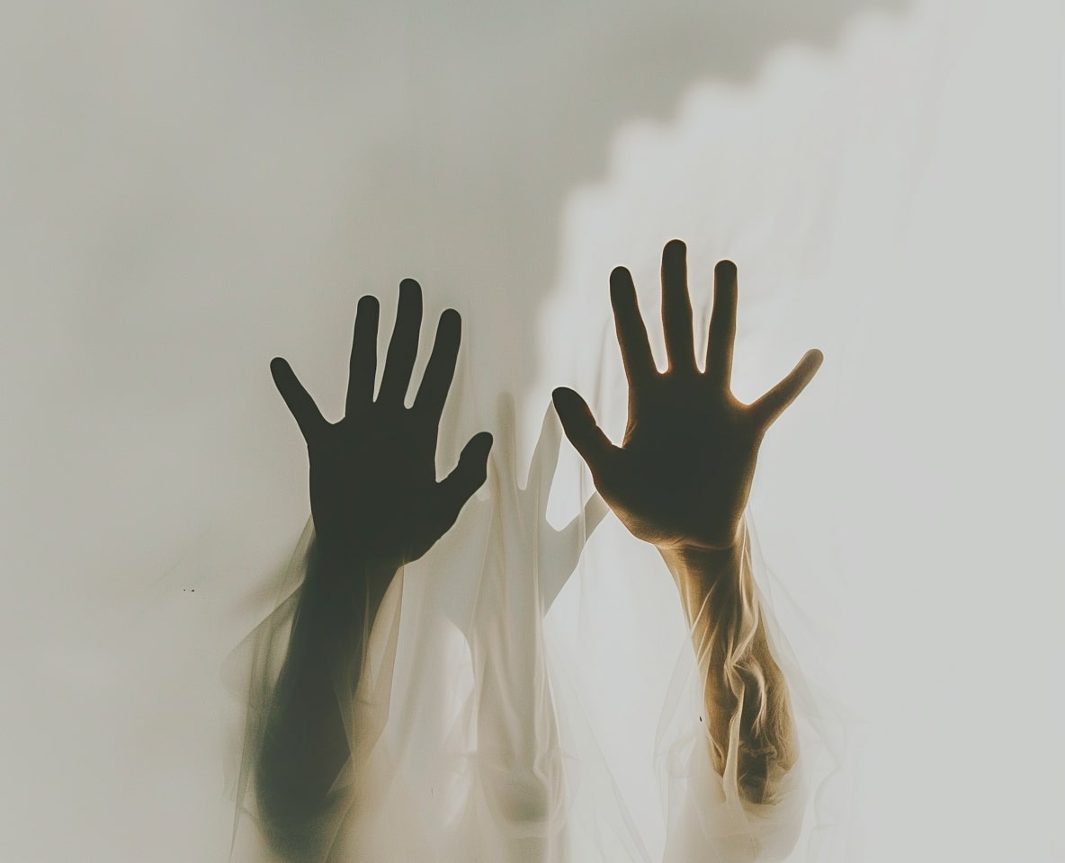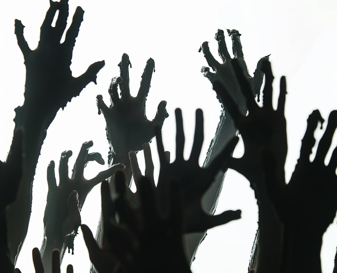 some hands in silhouette with white background, in the style of vibrant nightmares, random ravels, haunting images, contained chaos, sudersan pattnaik, horror academia, translucent immersion --ar 16:13 --v 6.0