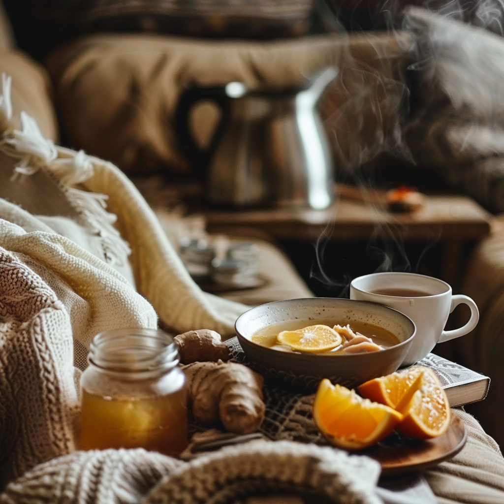 닭고기 수프는 염증을 감소시키고, 증상을 완화하는 데 도움을 줄 수 있습니다. 또한, 체온을 높여 바이러스와 싸우는 데 필요한 에너지를 제공합니다. - 생강차: