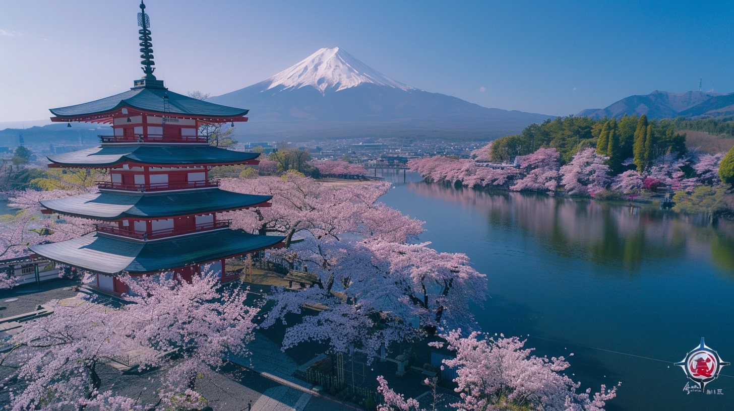 이미지는 일본의 자연과 건축의 영원한 아름다움을 담아내고 있습니다. 전통적인 랜드마크가 되는 고대 사원이 만개한 벚꽃으로 둘러싸여 있으며, 웅장한 후지산이 배경으로 자리 잡고 있습니다.