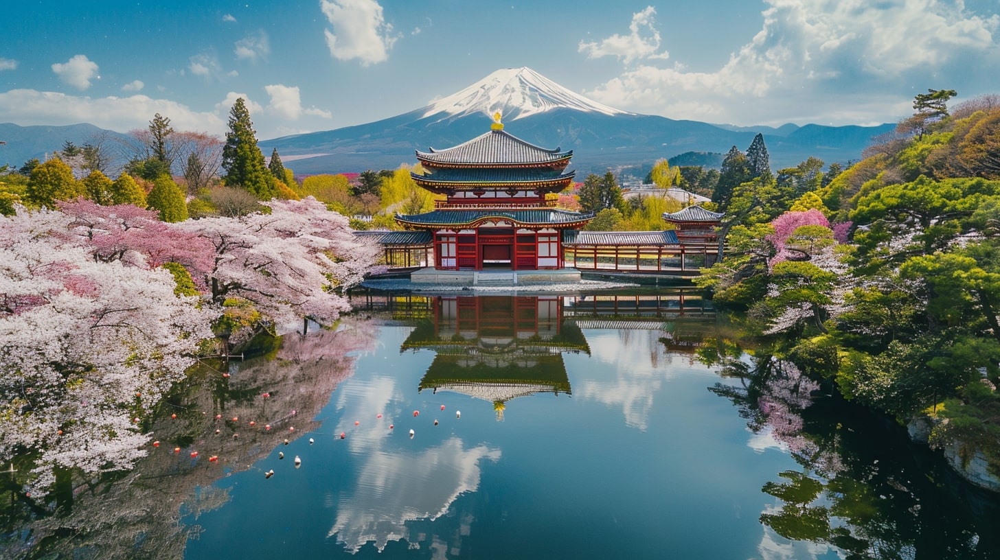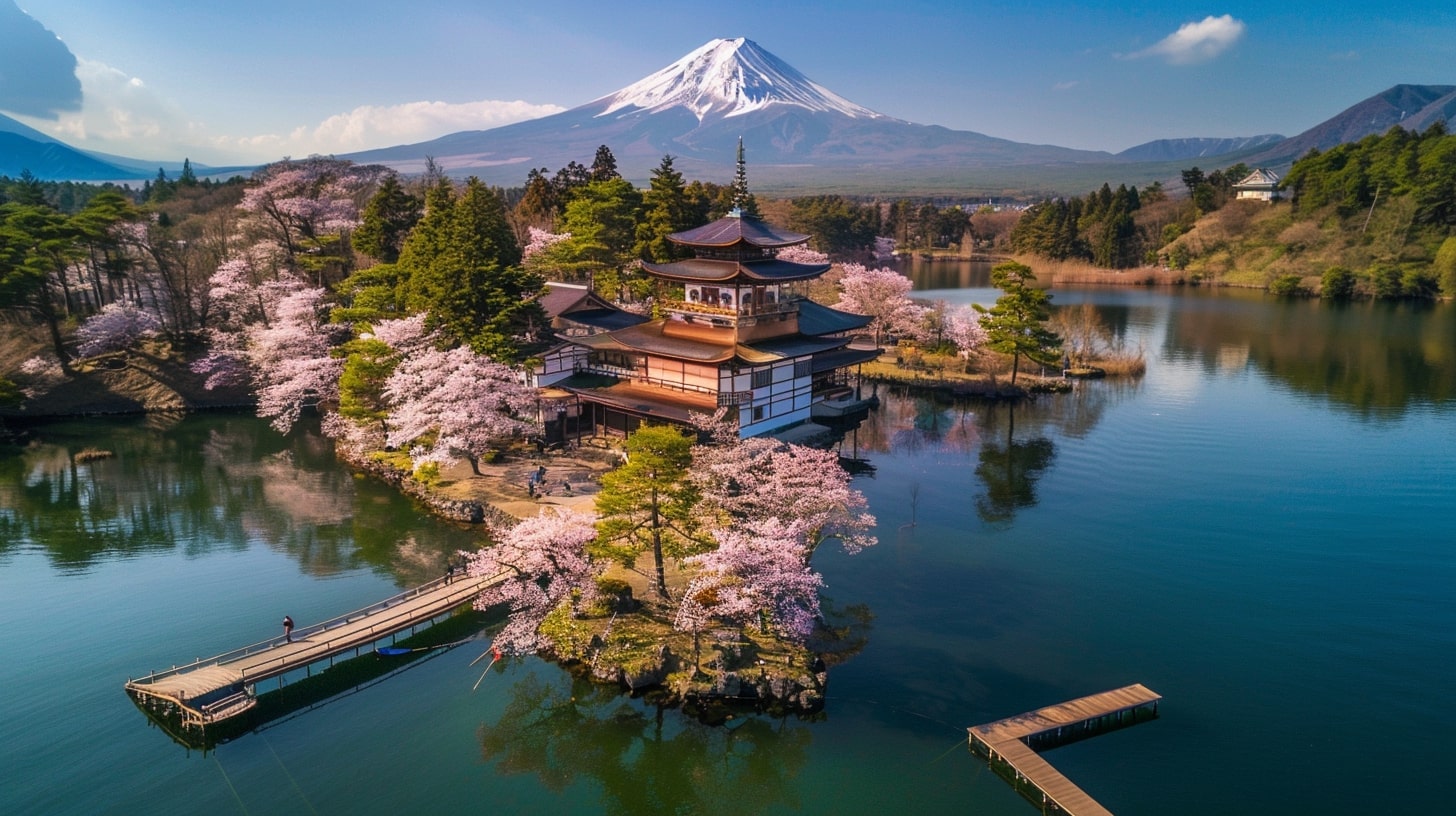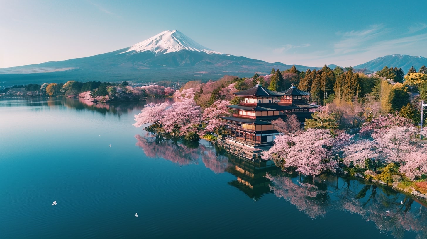 Traditional Japanese landmarks, Ancient temples surrounded by cherry blossoms in full bloom, A serene lake reflecting the majestic Mount Fuji in the background, The image conveys a sense of peace, tranquility, and the timeless beauty of Japanese nature and architecture, Photography, Aerial shot with a drone equipped with a high-resolution camera, --ar 16:9