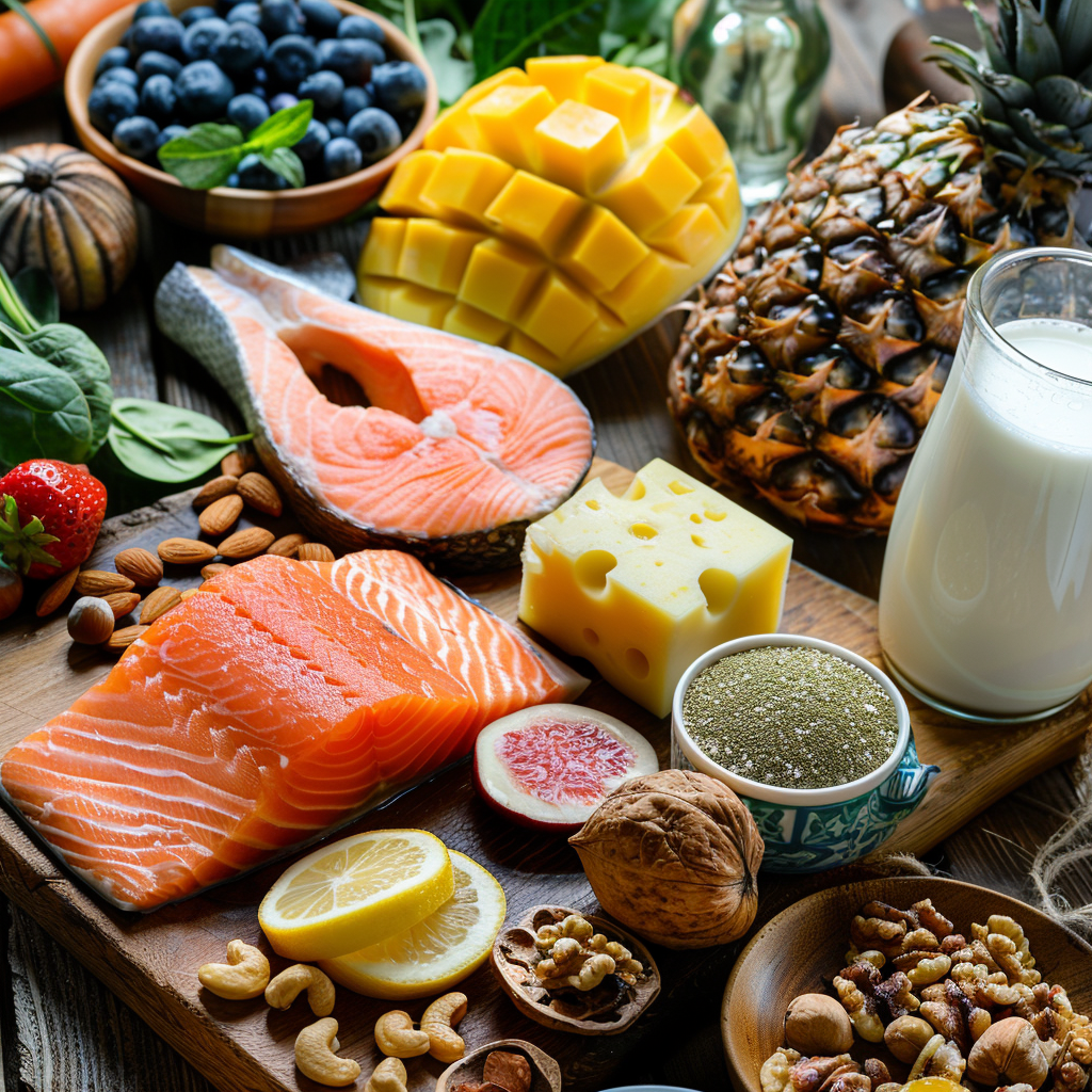 연어, 고등어와 같은 지방이 많은 생선, 아마씨, 호두 등에 풍부하며, 염증을 줄이고 연골의 건강을 지키는 데 도움을 줍니다. - 비타민 D와 칼슘: