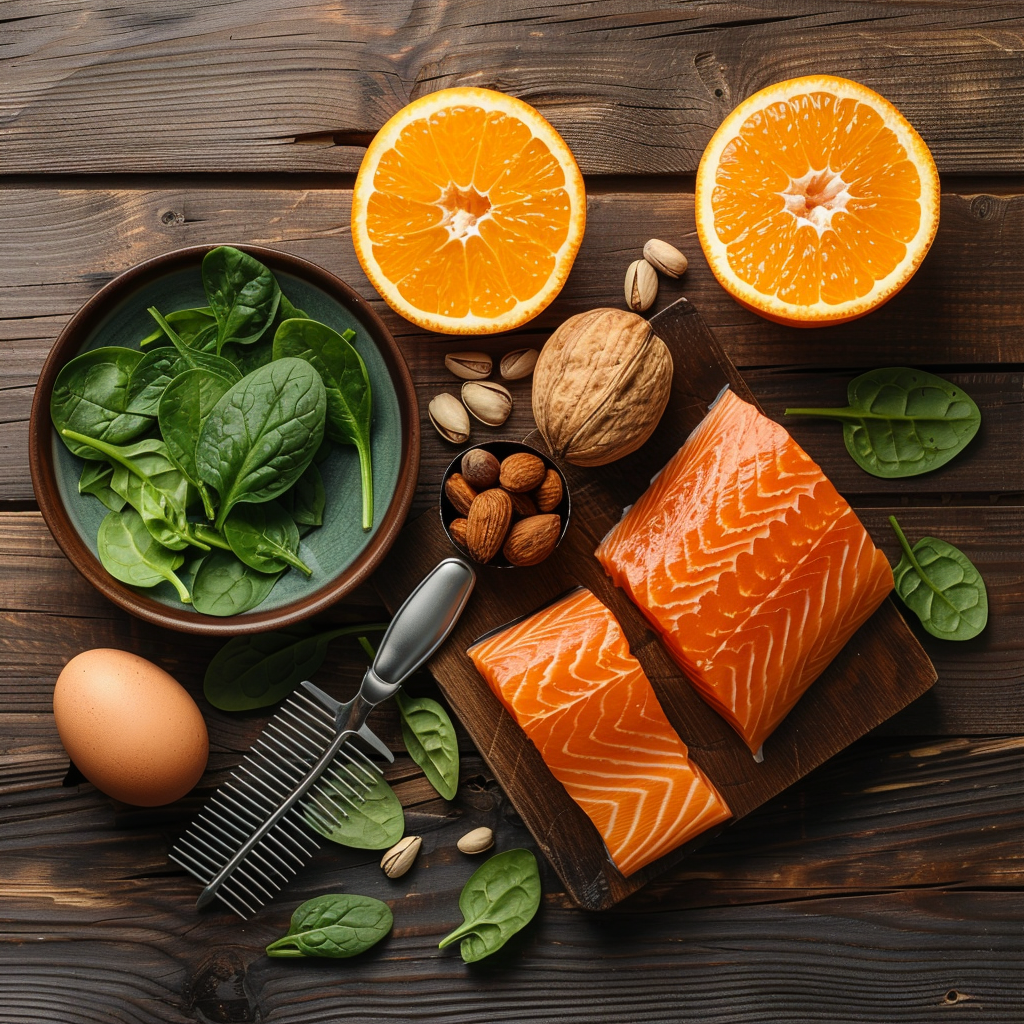 연어, 참치, 호두, 치아씨드 등 오메가-3 지방산이 풍부한 음식은 두피 건강을 개선하고 모발 성장을 촉진합니다. - 단백질이 풍부한 음식: