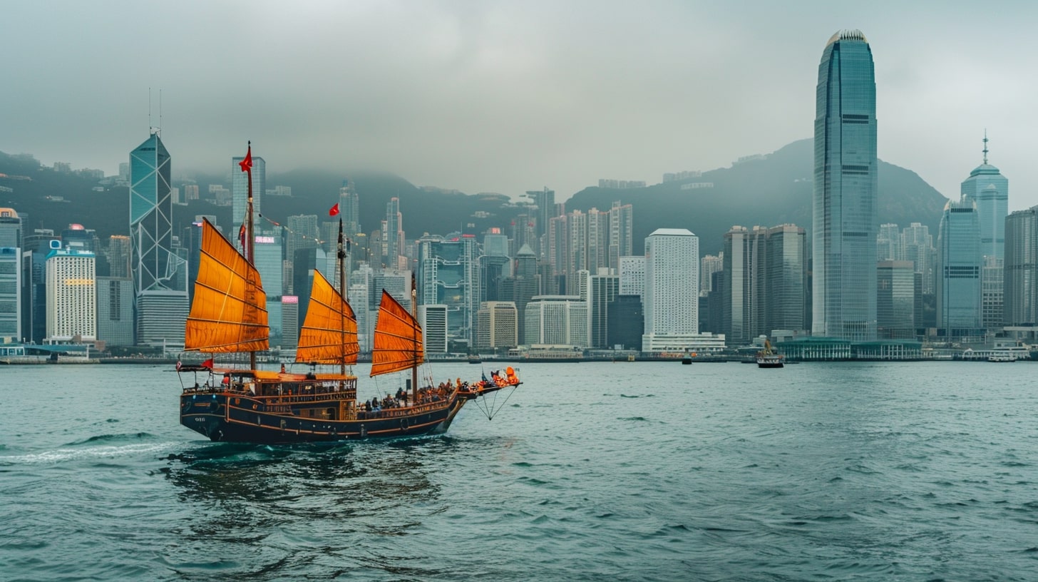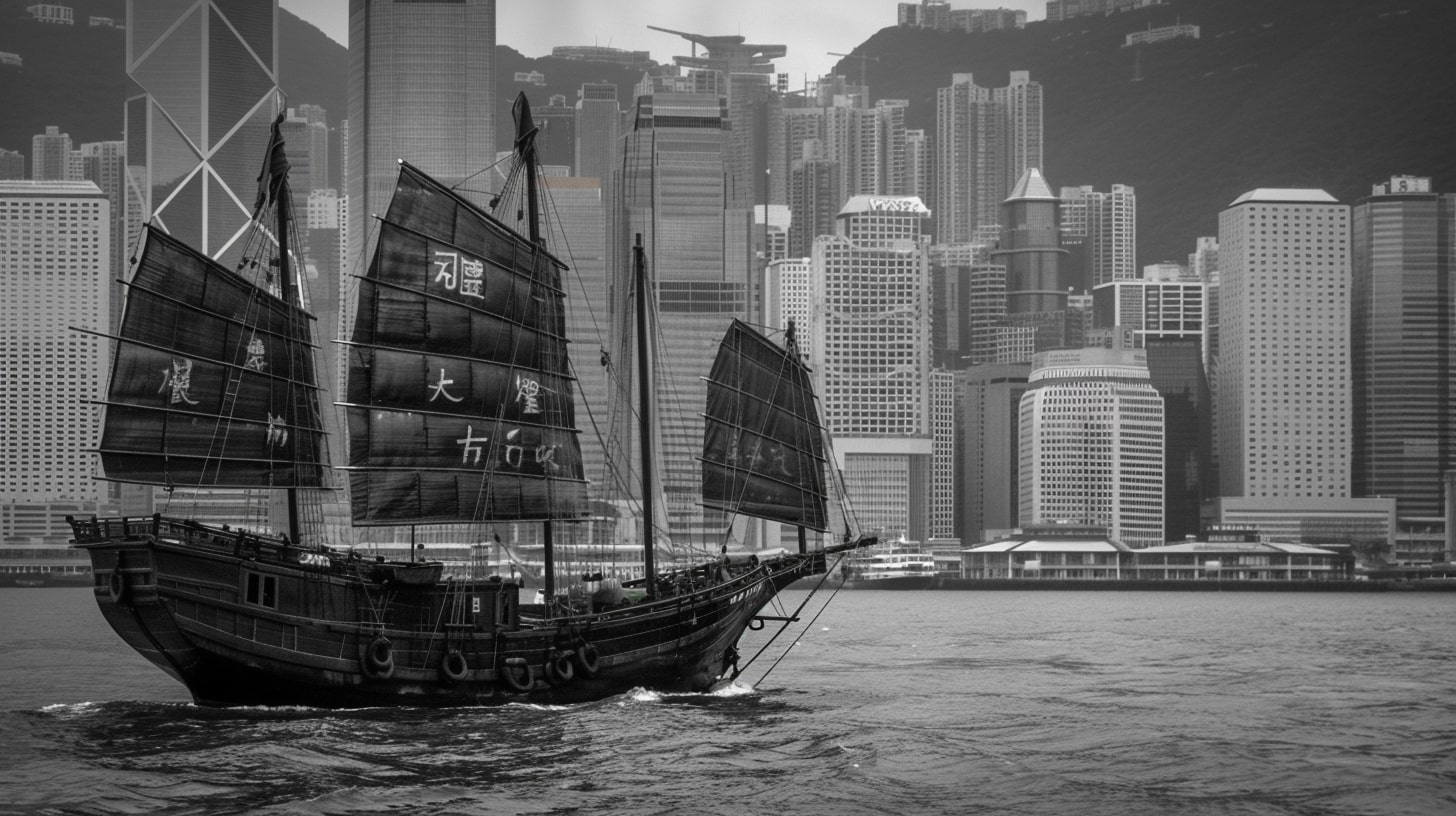 전통적인 중국 정크 보트가 빅토리아 항구를 우아하게 항해하며, 현대적이고 번화한 홍콩의 스카이라인과 대비를 이루는 장면입니다. 이는 홍콩의 과거와 현대가 조화를 이루며 도시의 독특한 정체성을 상징하는 강력한 이미지를 제공합니다. 사진은 DSLR 카메라와 프라임 렌즈(50mm)를 사용한 풍경 사진가가 정크 보트의 세밀한 디테일과 도시 풍경의 광활함을 균형 있게 포착하여, 전통과 현대성의 공존을 강조하는 시각적 이야기를 담고 있습니다.