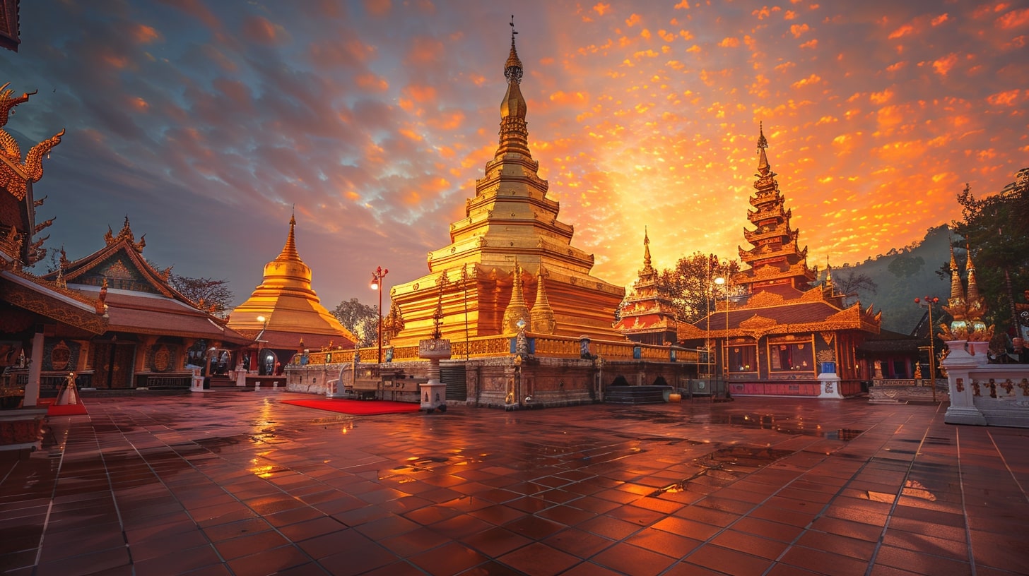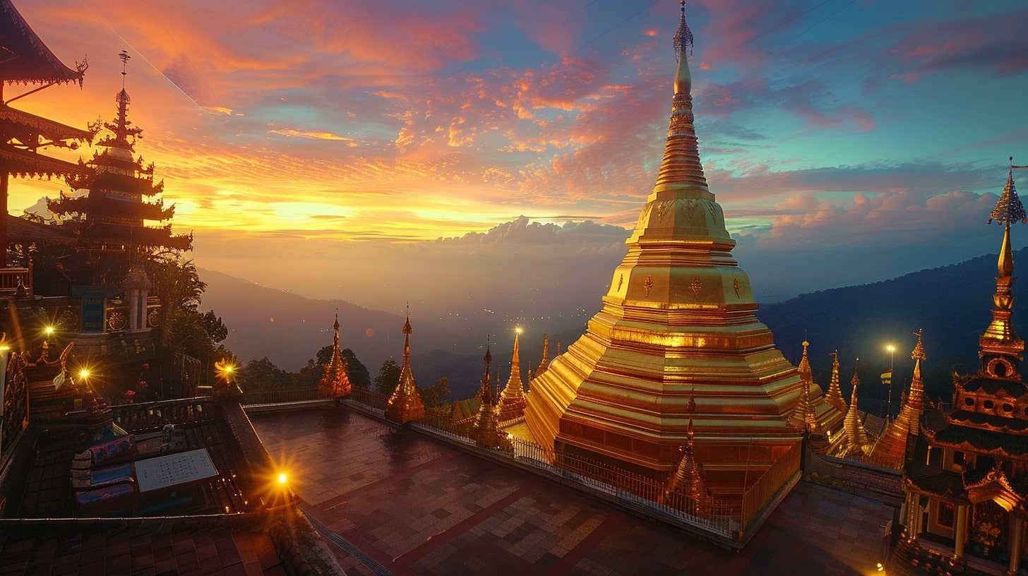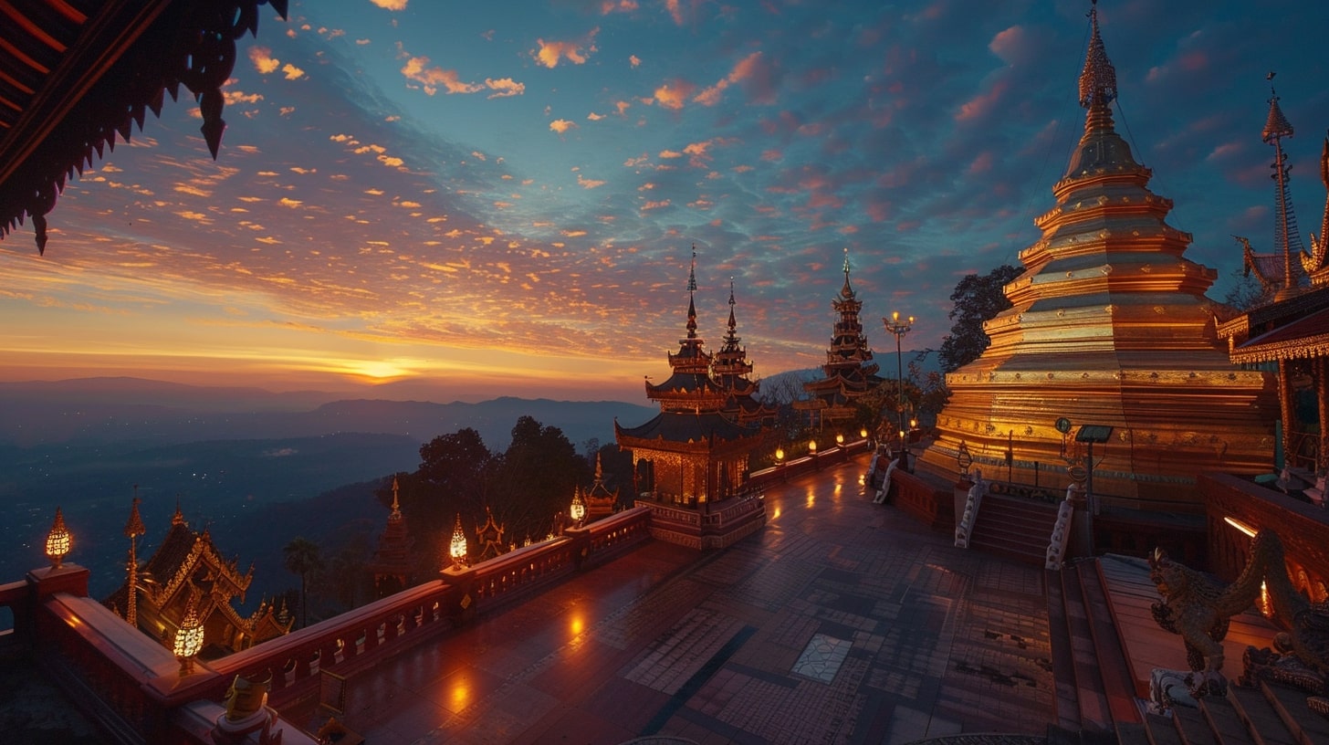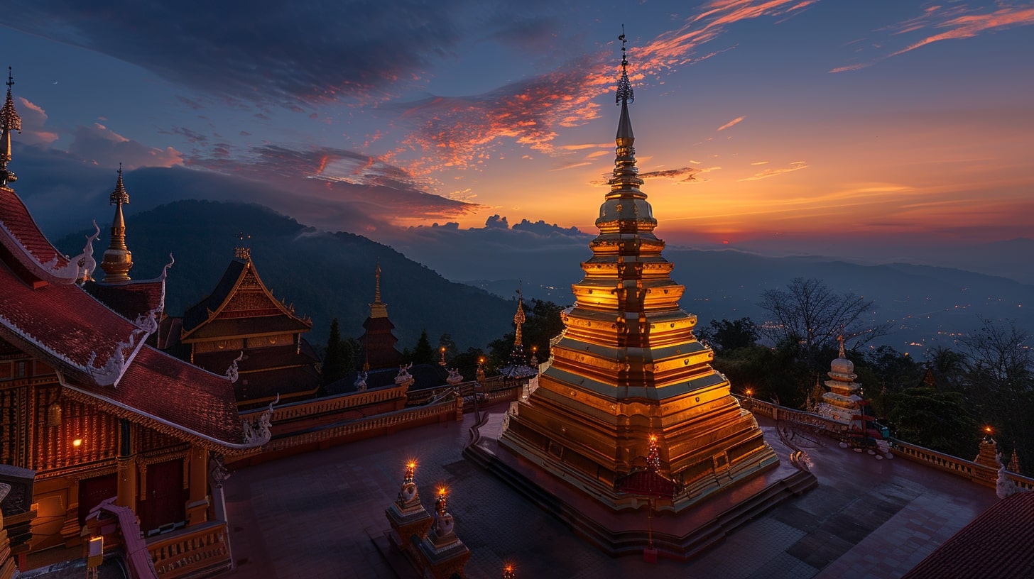 Wat Phra That Doi Suthep in Chiang Mai, The golden pagoda of Wat Phra That Doi Suthep illuminated by the first light of dawn, A tranquil and spiritual ambiance reflecting the serenity of Buddhist practices, DSLR photography, A DSLR camera with a portrait lens focusing on the intricate details of the temple against the early morning sky --ar 16:9 --v 6.0