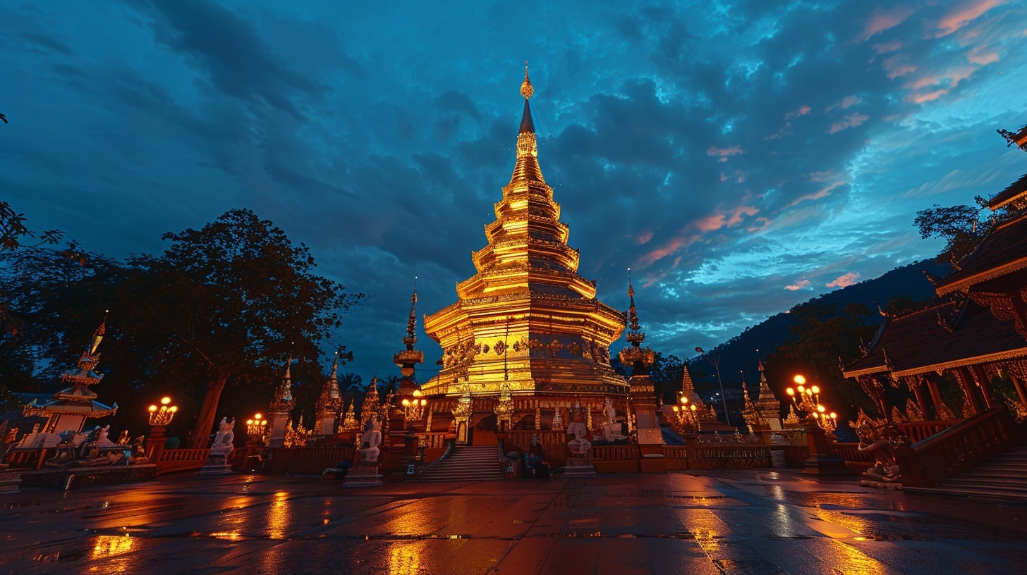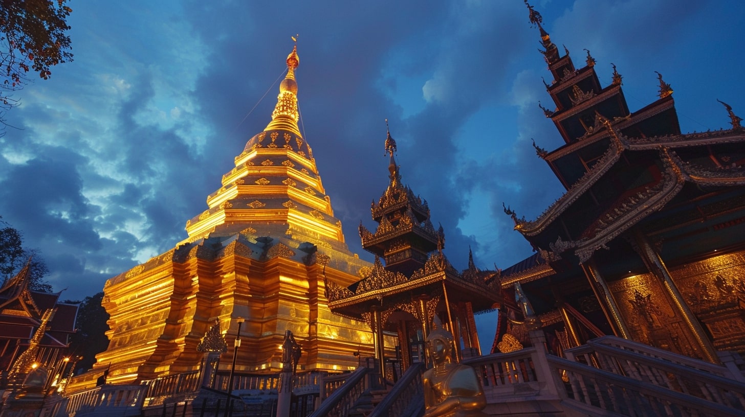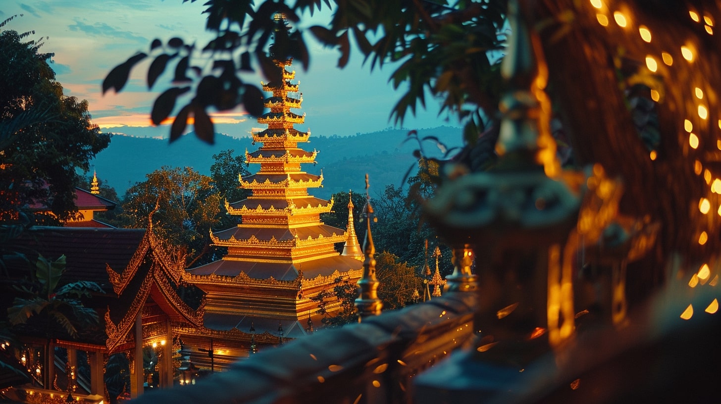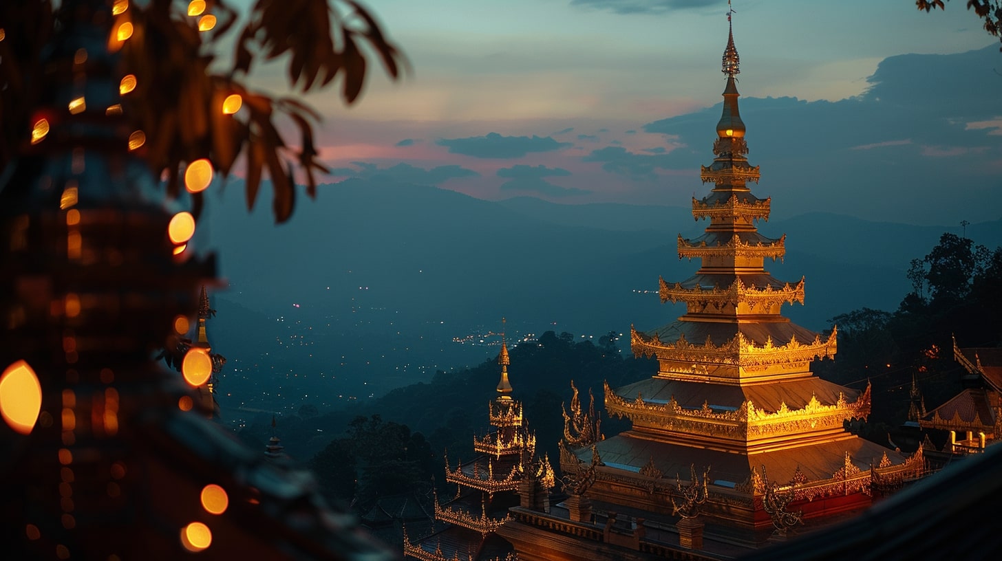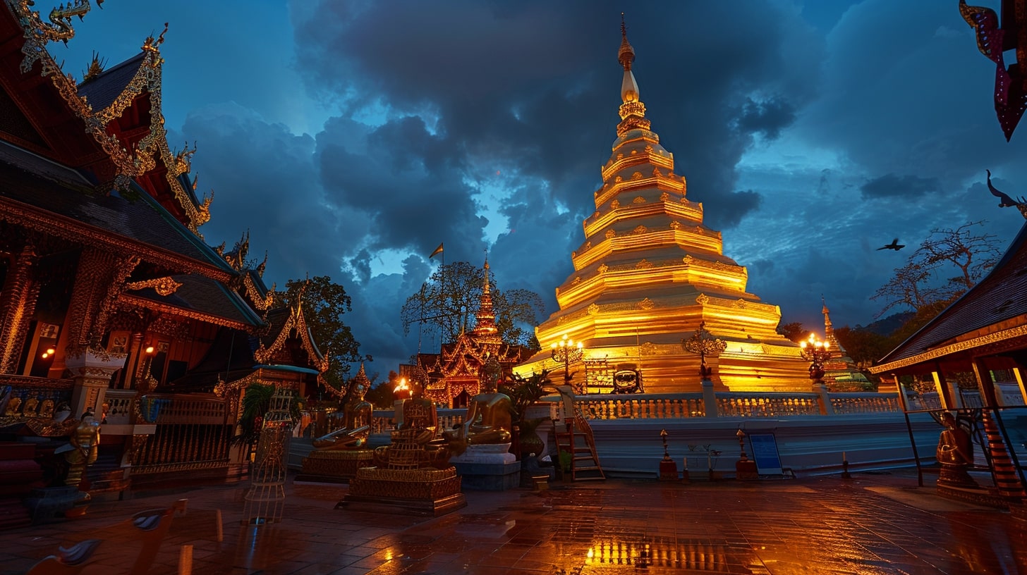Wat Phra That Doi Suthep in Chiang Mai, The golden pagoda of Wat Phra That Doi Suthep illuminated by the first light of dawn, A tranquil and spiritual ambiance reflecting the serenity of Buddhist practices, DSLR photography, A DSLR camera with a portrait lens focusing on the intricate details of the temple against the early morning sky --ar 16:9 --v 6.0