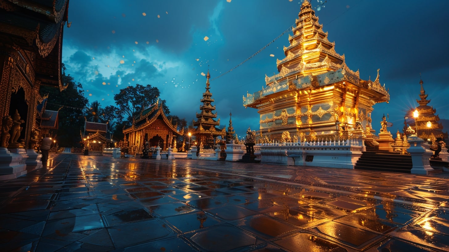 Wat Phra That Doi Suthep in Chiang Mai, The golden pagoda of Wat Phra That Doi Suthep illuminated by the first light of dawn, A tranquil and spiritual ambiance reflecting the serenity of Buddhist practices, DSLR photography, A DSLR camera with a portrait lens focusing on the intricate details of the temple against the early morning sky --ar 16:9 --v 6.0