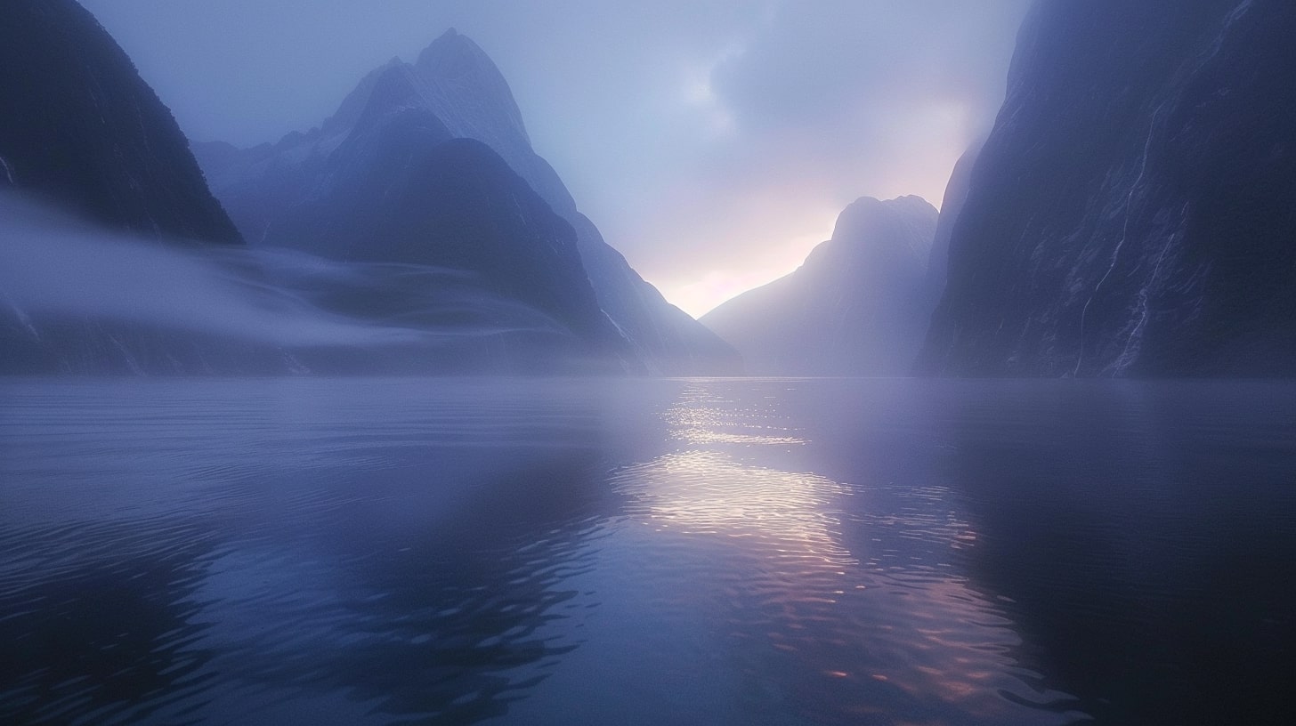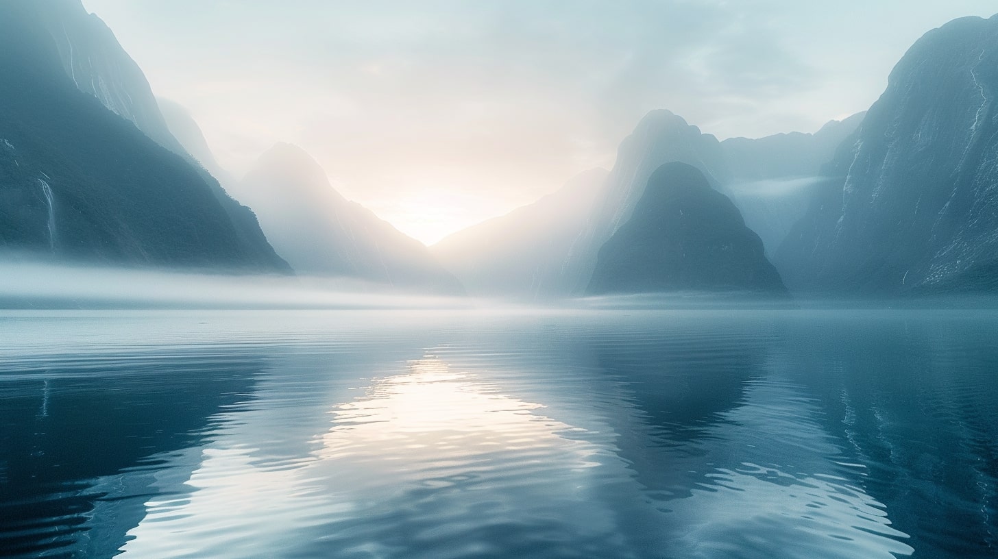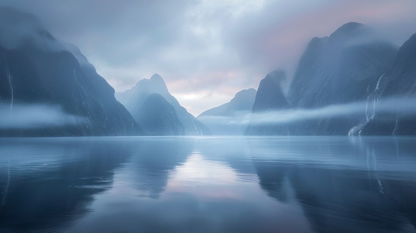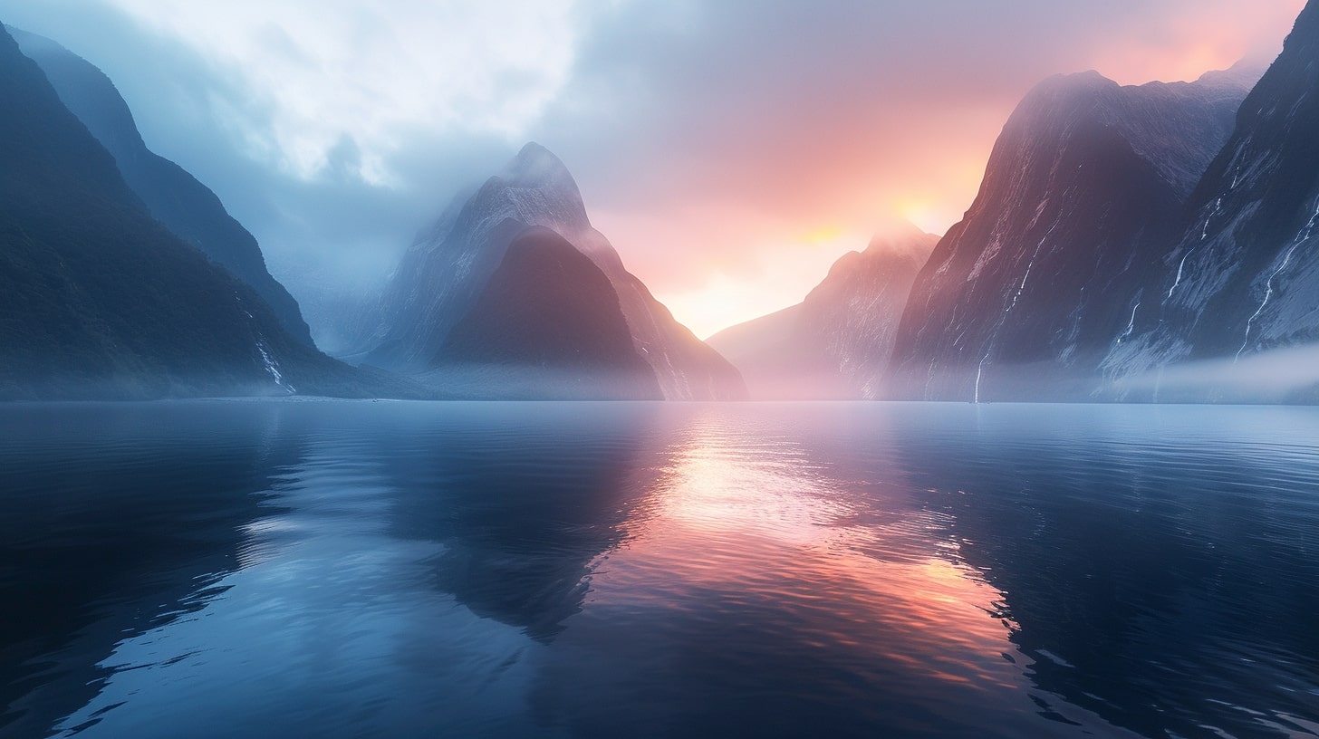 Milford Sound at dawn, The serene waters of Milford Sound reflecting the first light of dawn, mountains shrouded in mist, A tranquil and serene atmosphere, early morning light casting soft hues over the landscape, Realistic photography, DSLR with a wide-angle lens to capture the expansive beauty of the fjord --ar 16:9