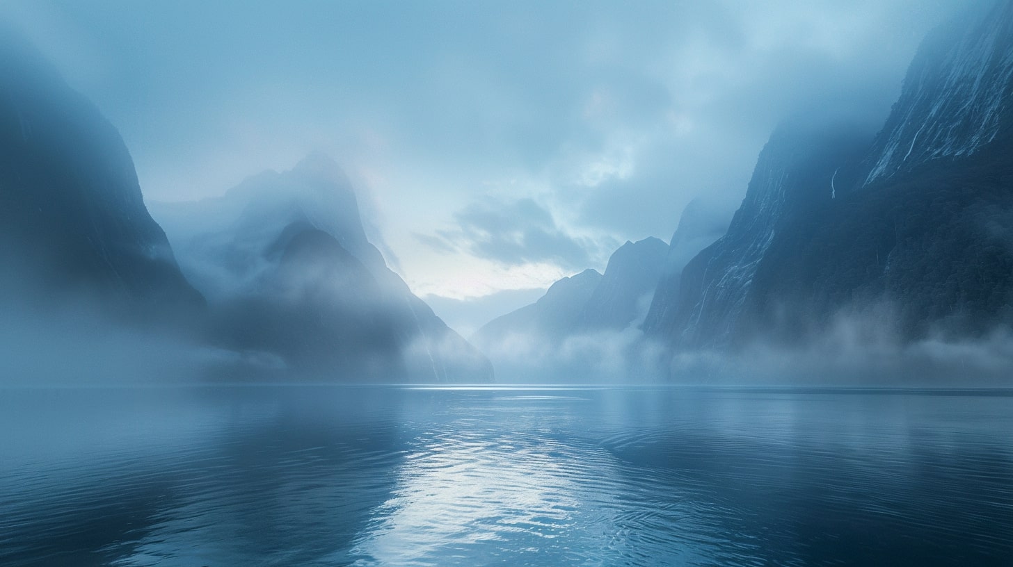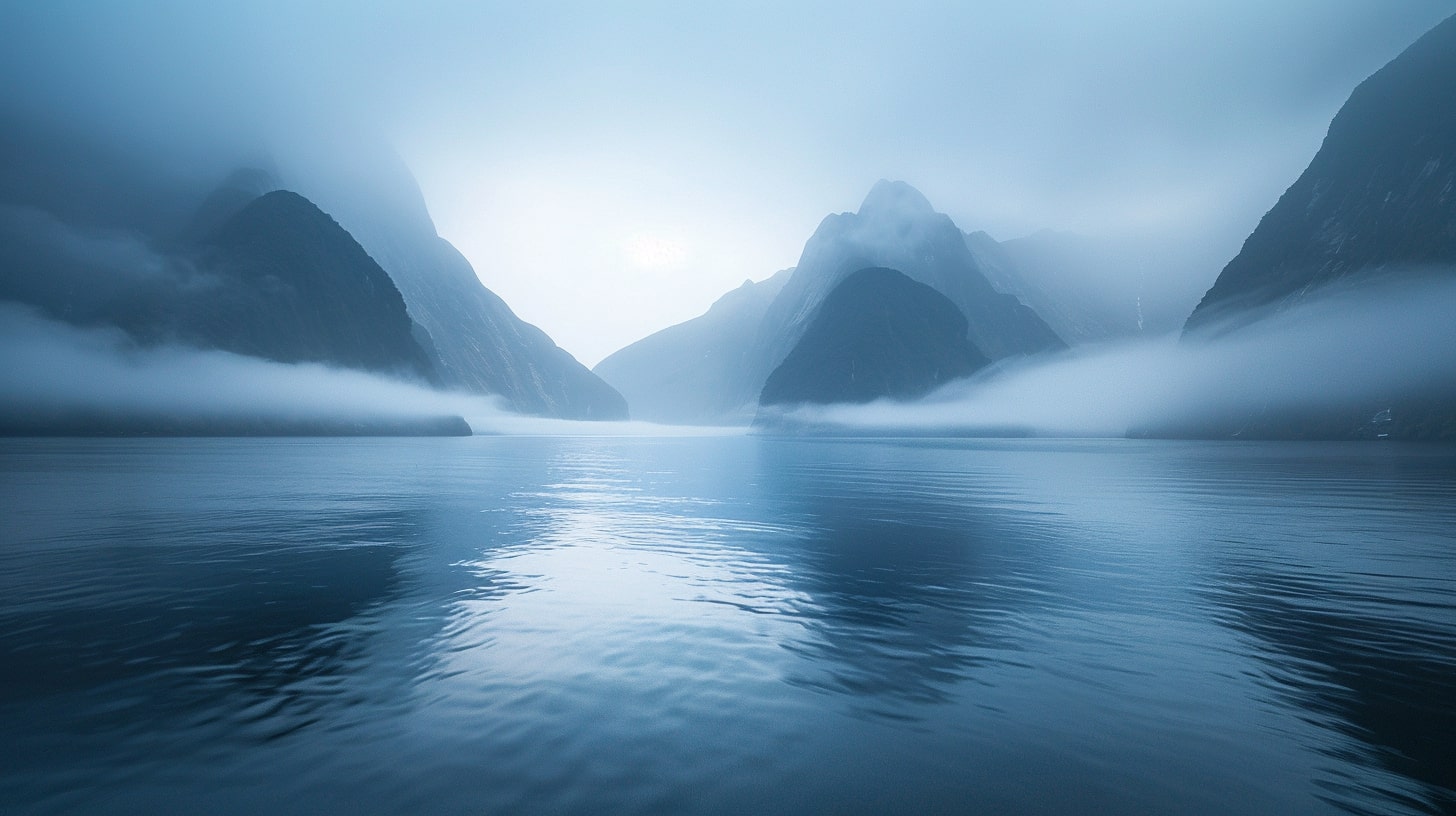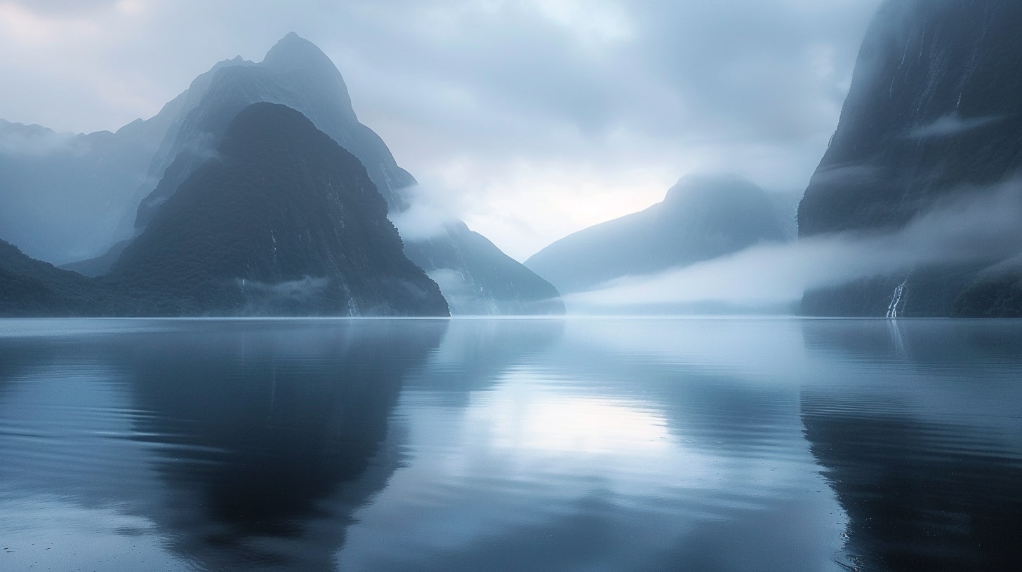 Milford Sound at dawn, The serene waters of Milford Sound reflecting the first light of dawn, mountains shrouded in mist, A tranquil and serene atmosphere, early morning light casting soft hues over the landscape, Realistic photography, DSLR with a wide-angle lens to capture the expansive beauty of the fjord --ar 16:9