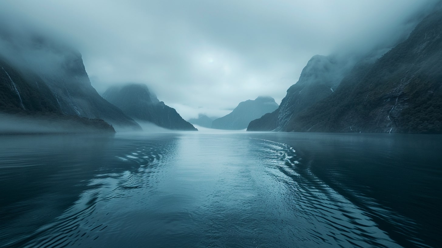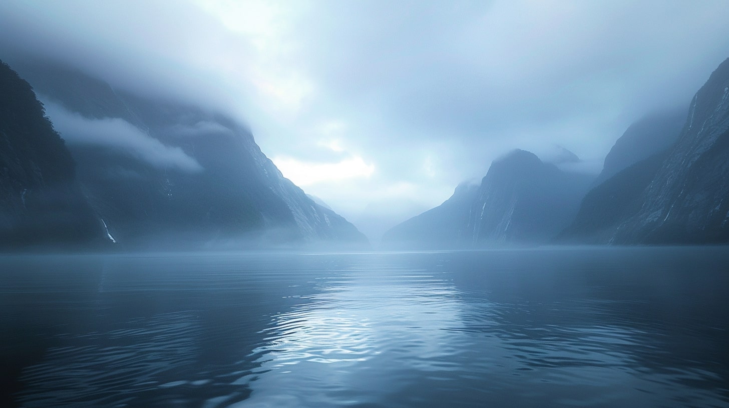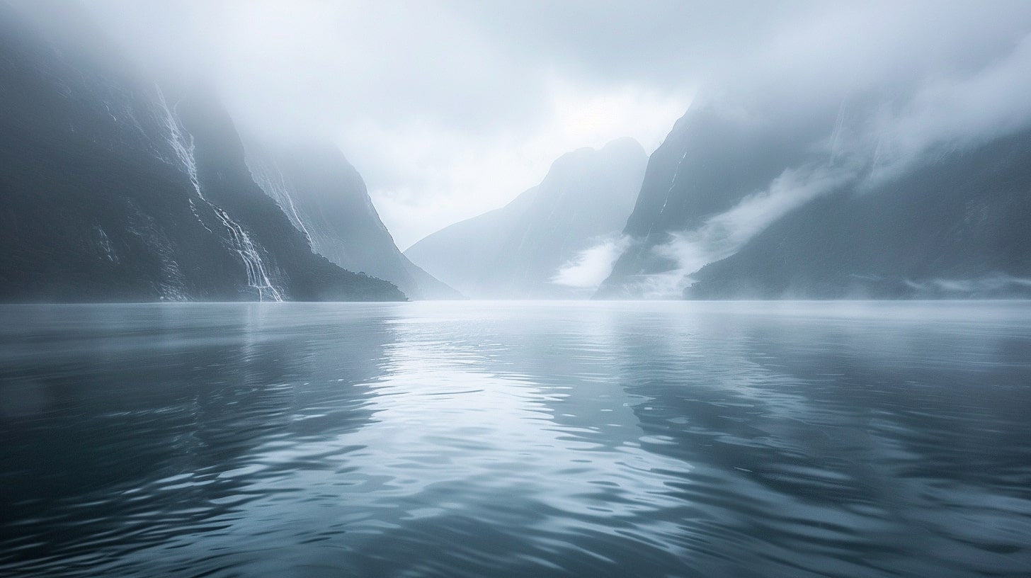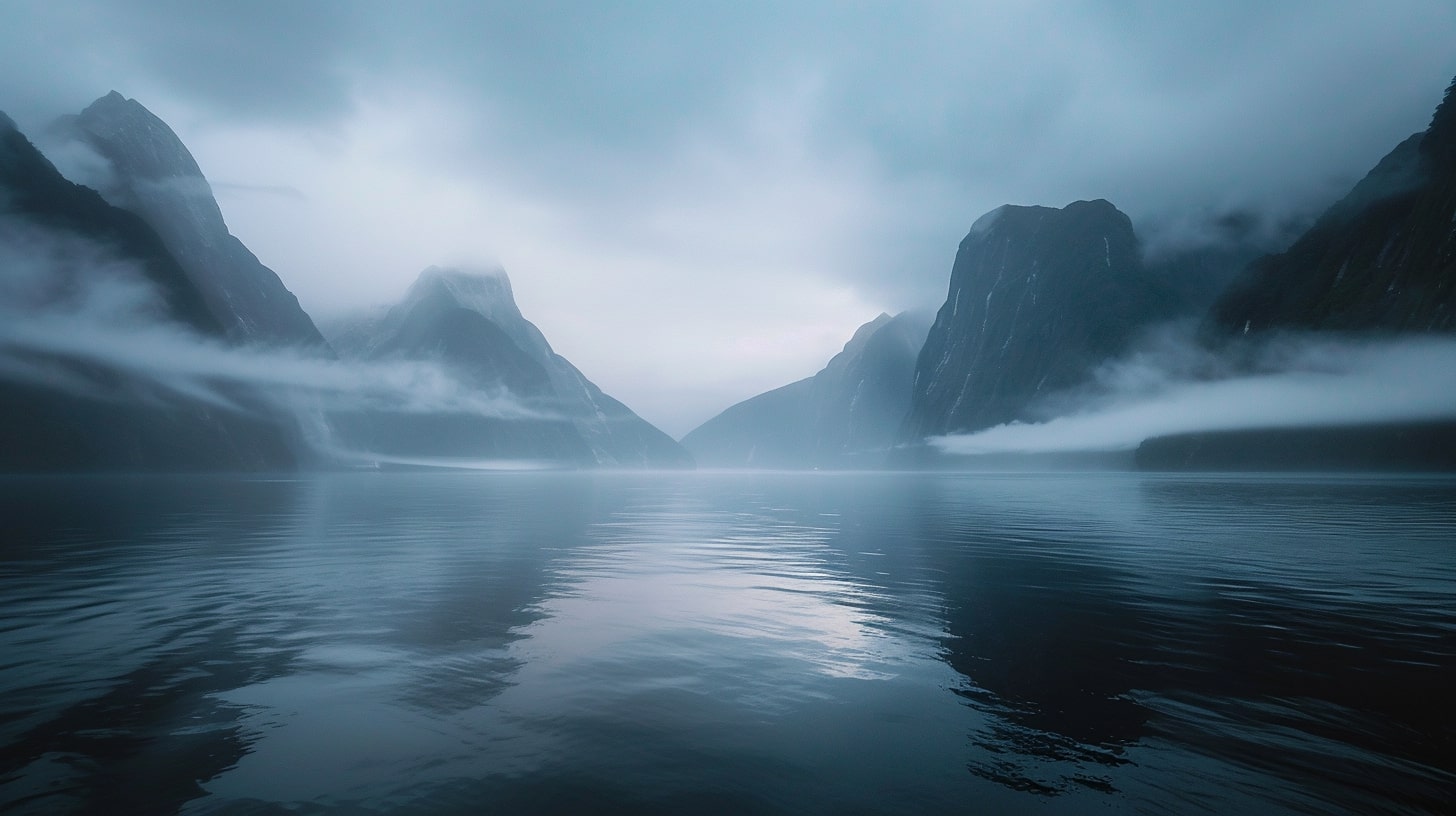 Milford Sound at dawn, The serene waters of Milford Sound reflecting the first light of dawn, mountains shrouded in mist, A tranquil and serene atmosphere, early morning light casting soft hues over the landscape, Realistic photography, DSLR with a wide-angle lens to capture the expansive beauty of the fjord --ar 16:9