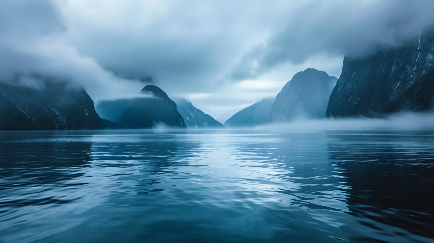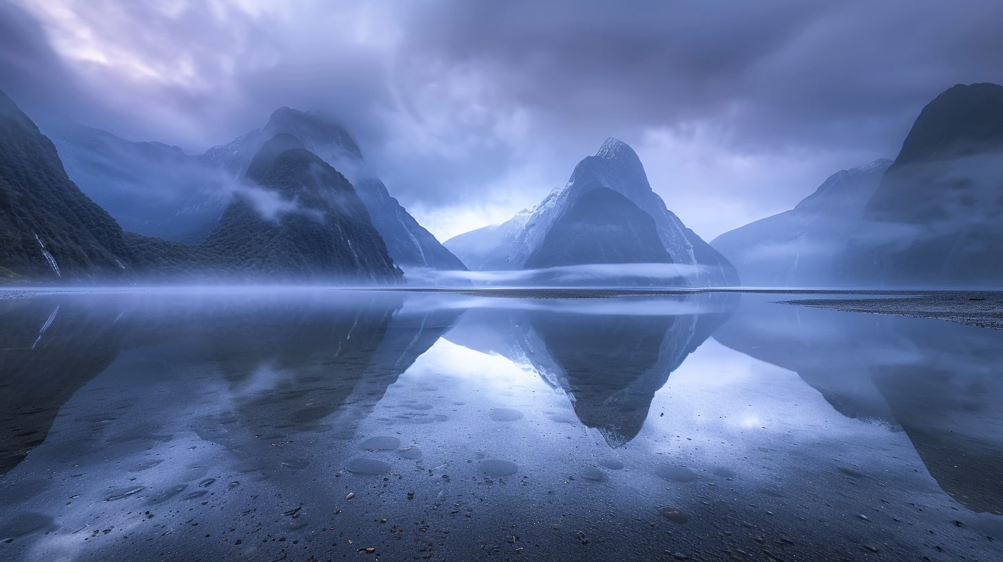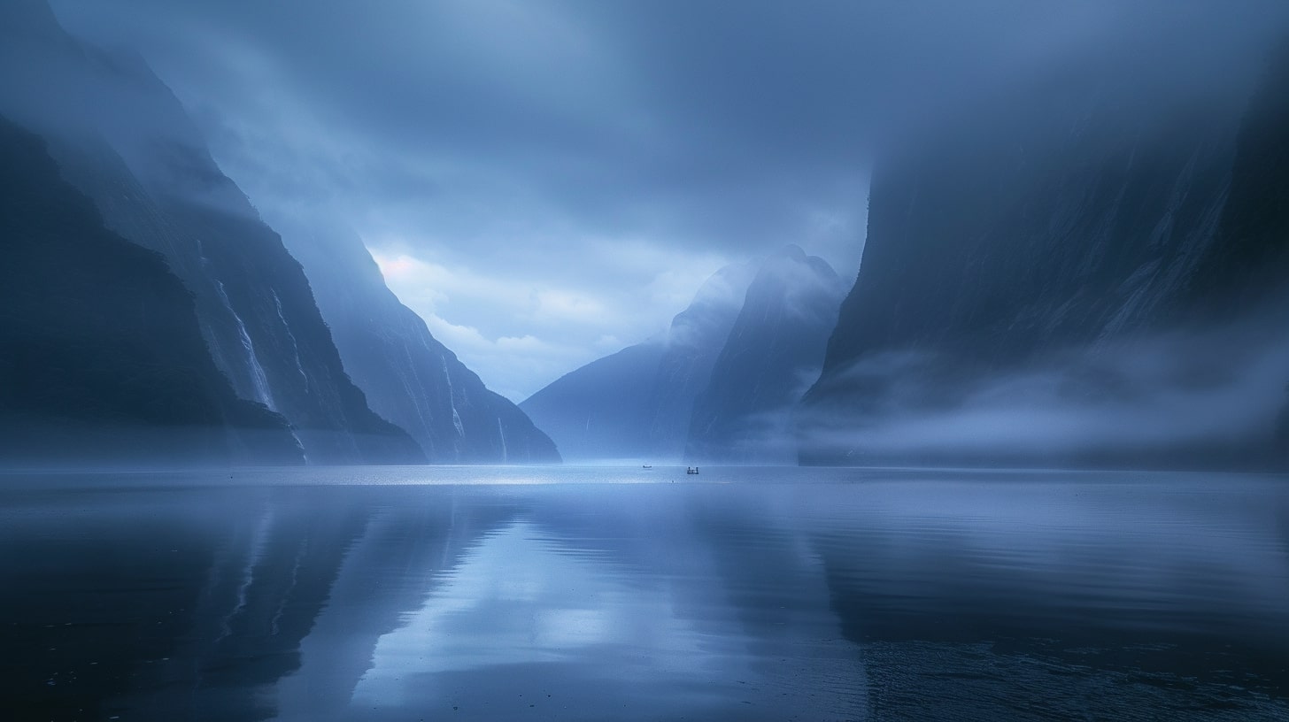 새벽녘, 밀포드 사운드의 고요한 바다가 첫 새벽 빛을 반사하며 평온한 장면을 연출합니다. 이른 아침의 햇살이 안개에 싸인 산들 위로 부드럽게 스며들며, 주변 풍경에 온화한 색조를 더합니다. 광활한 피오르드의 아름다움이 광각 렌즈를 통해 포착된 사실적인 이미지는 보는 이로 하여금 마치 그 현장에 있는 듯한 느낌을 줍니다. 고요하고 평온한 분위기 속에서, 이 풍경은 자연의 장엄함과 순수함을 고스란히 전달하며, 관람자의 마음에 깊은 인상을 남깁니다.