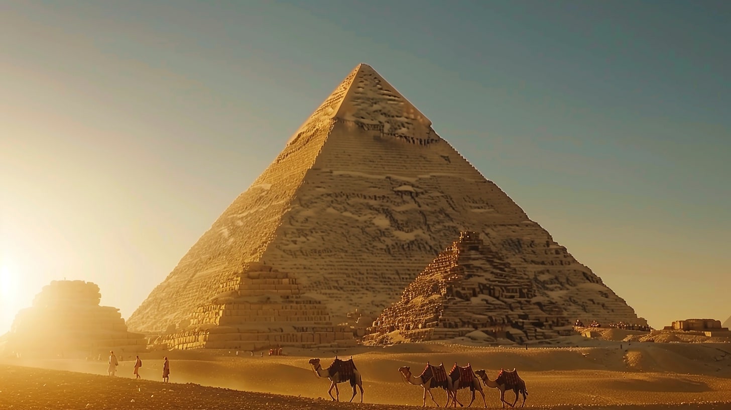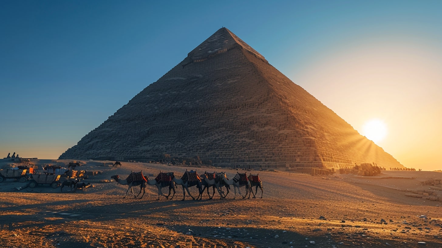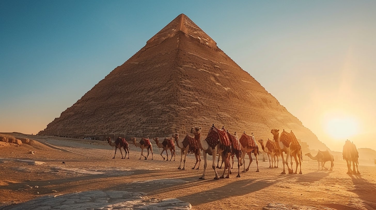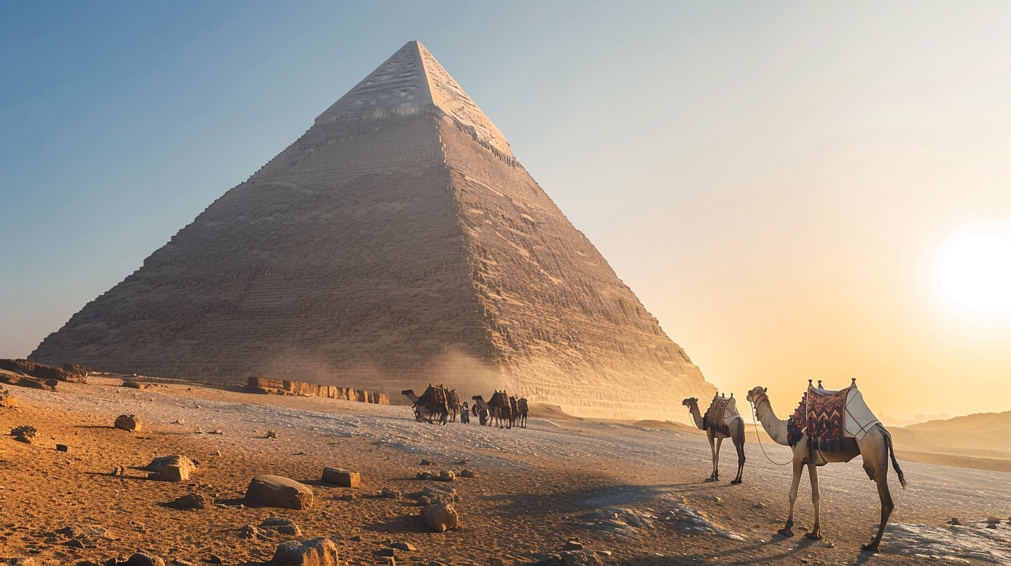 Great Pyramid of Giza, the largest pyramid towering under a clear blue sky, a camel caravan passing by in the foreground, golden sunset casting long shadows, realistic photography, captured with a Canon EOS 5D Mark IV, DSLR camera with a 24mm lens --ar 16:9