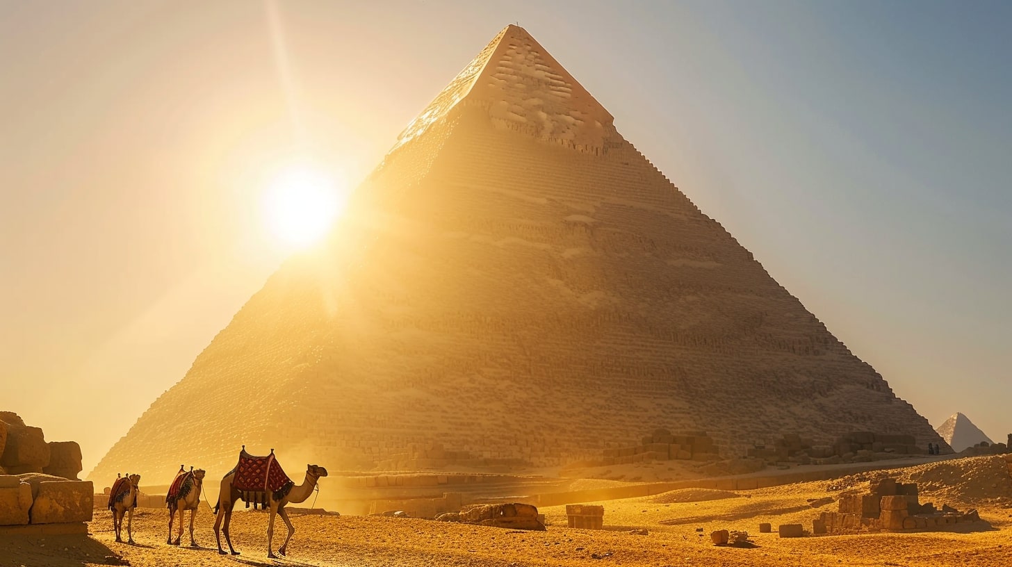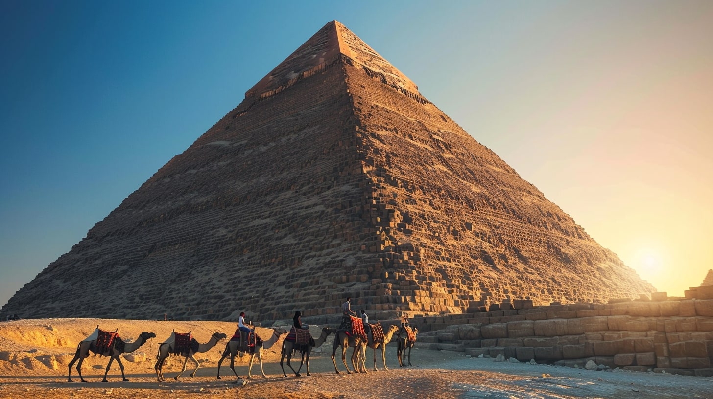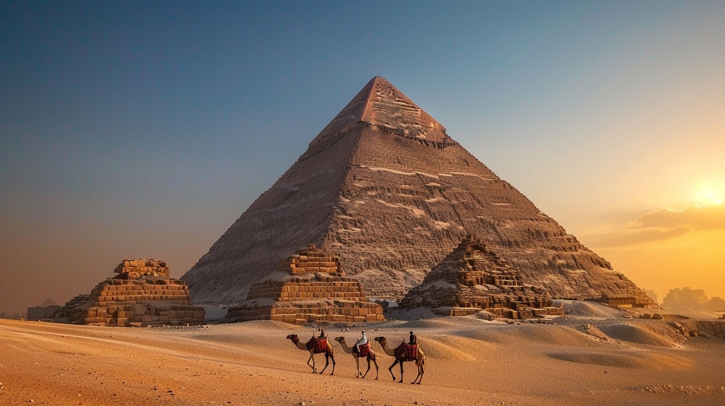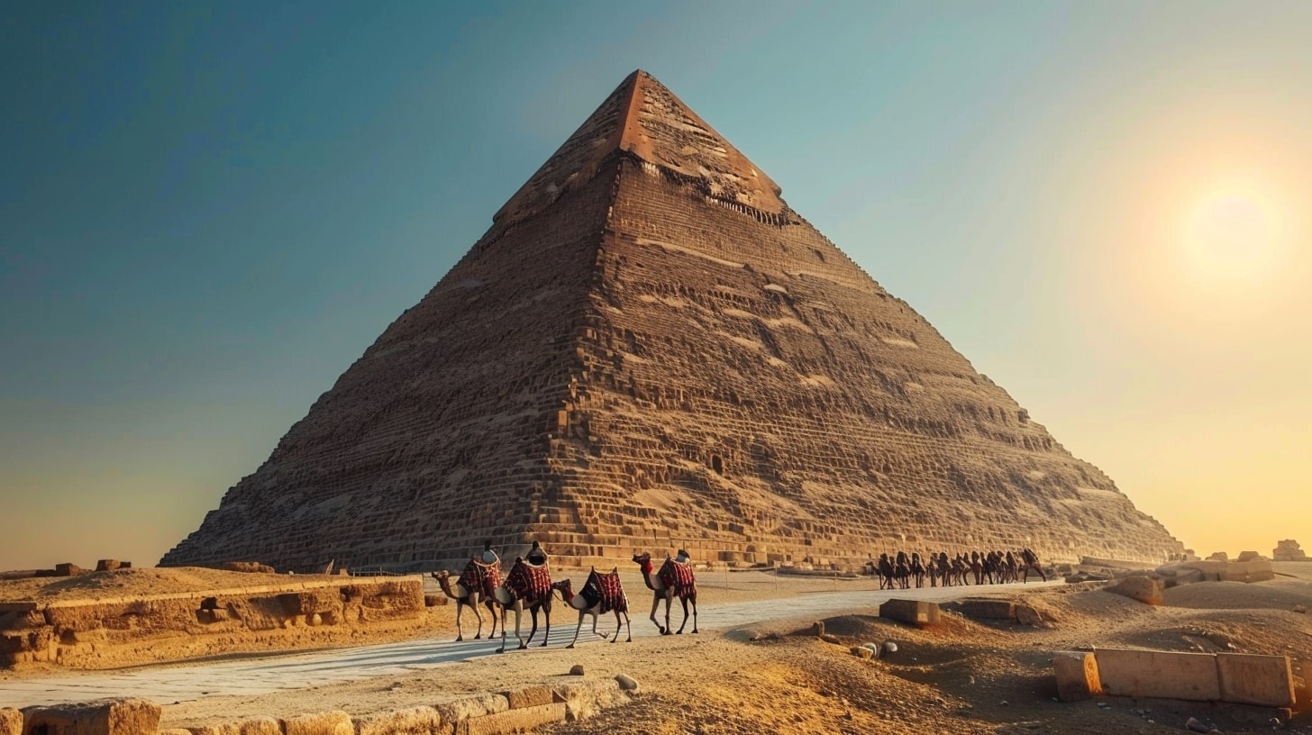 Great Pyramid of Giza, the largest pyramid towering under a clear blue sky, a camel caravan passing by in the foreground, golden sunset casting long shadows, realistic photography, captured with a Canon EOS 5D Mark IV, DSLR camera with a 24mm lens --ar 16:9