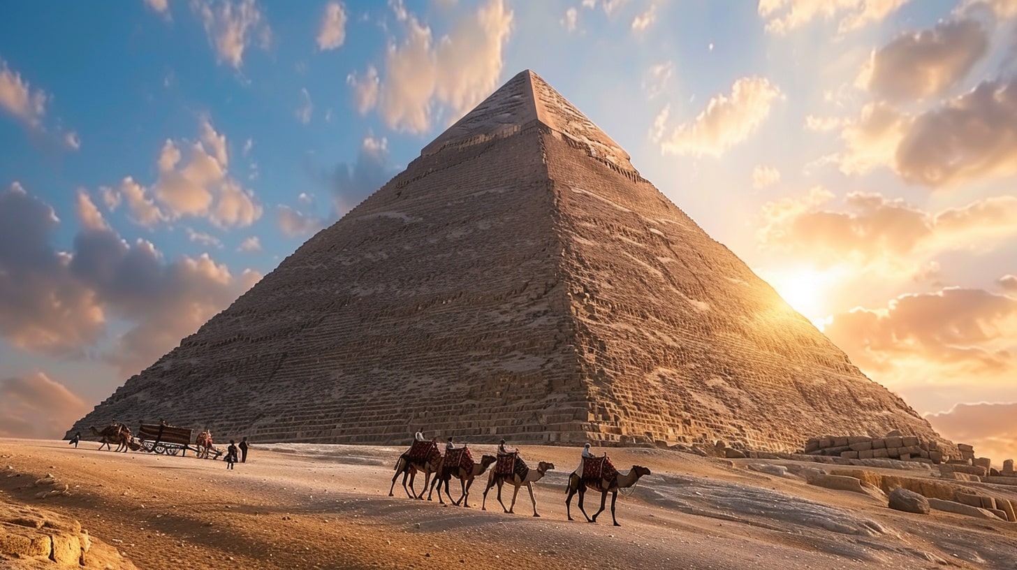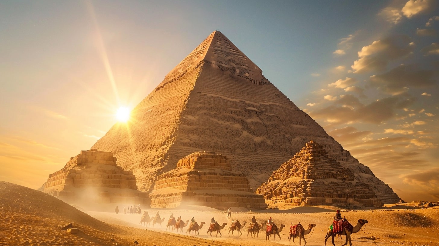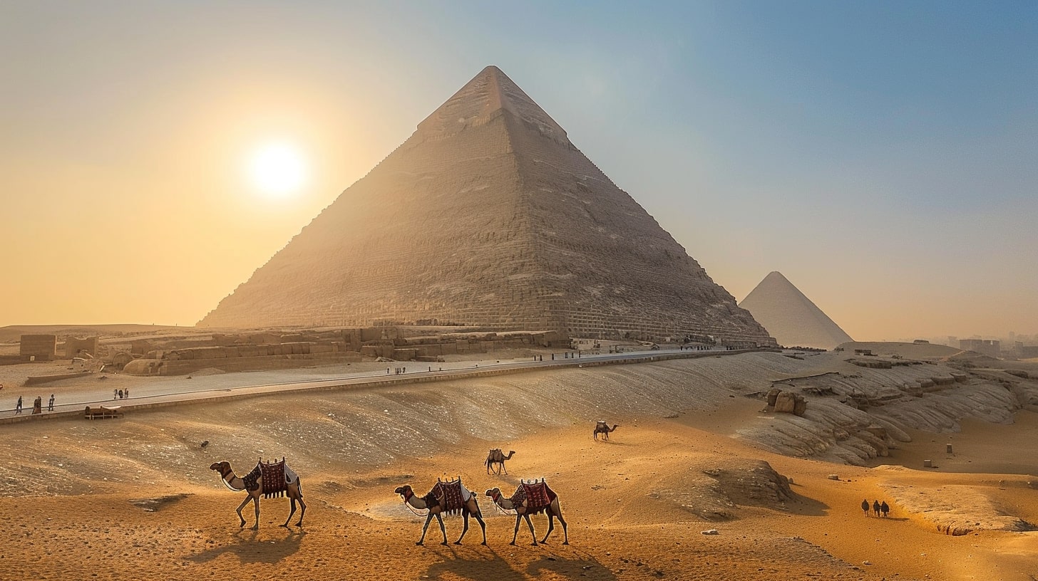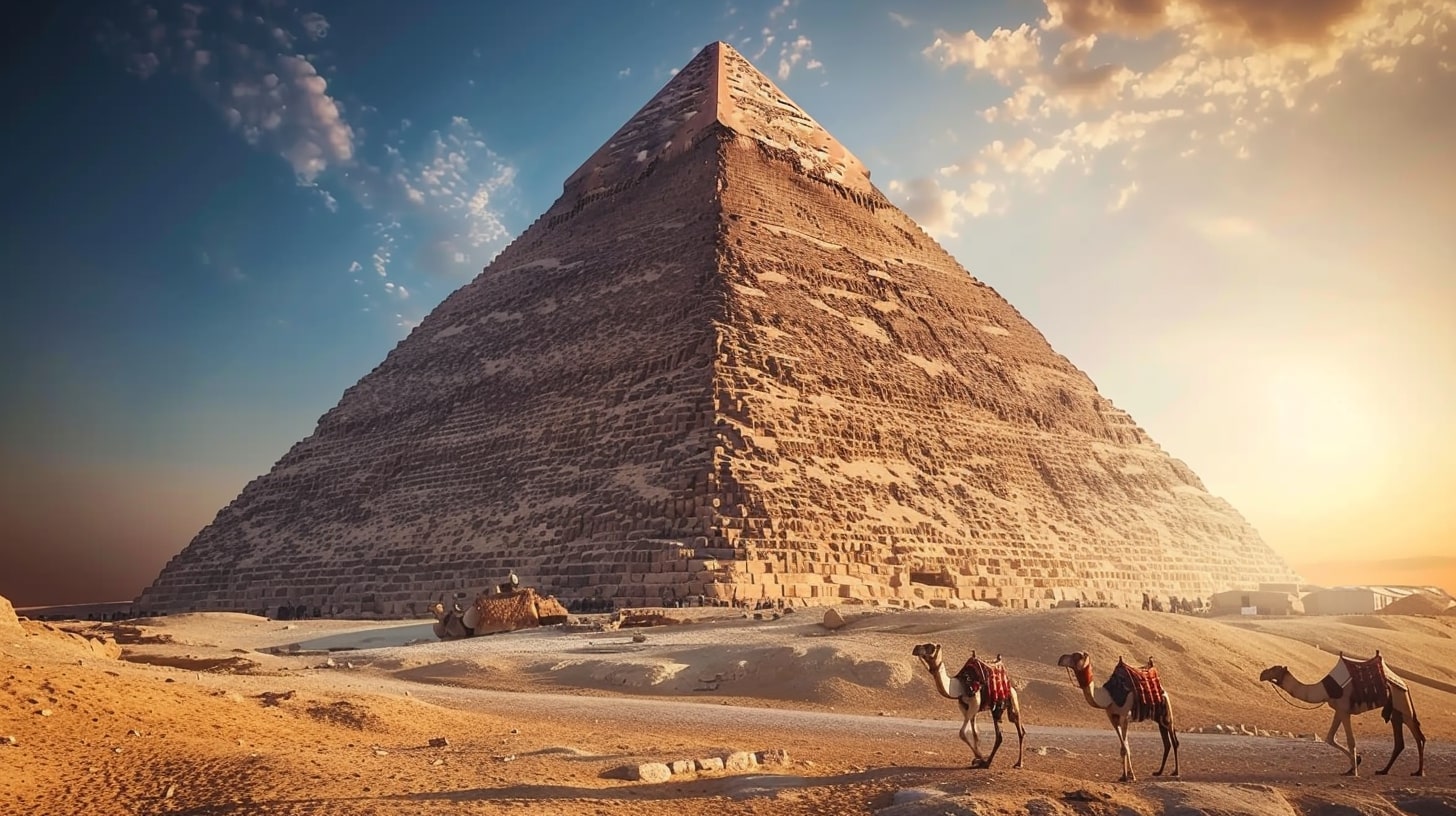 Great Pyramid of Giza, the largest pyramid towering under a clear blue sky, a camel caravan passing by in the foreground, golden sunset casting long shadows, realistic photography, captured with a Canon EOS 5D Mark IV, DSLR camera with a 24mm lens --ar 16:9
