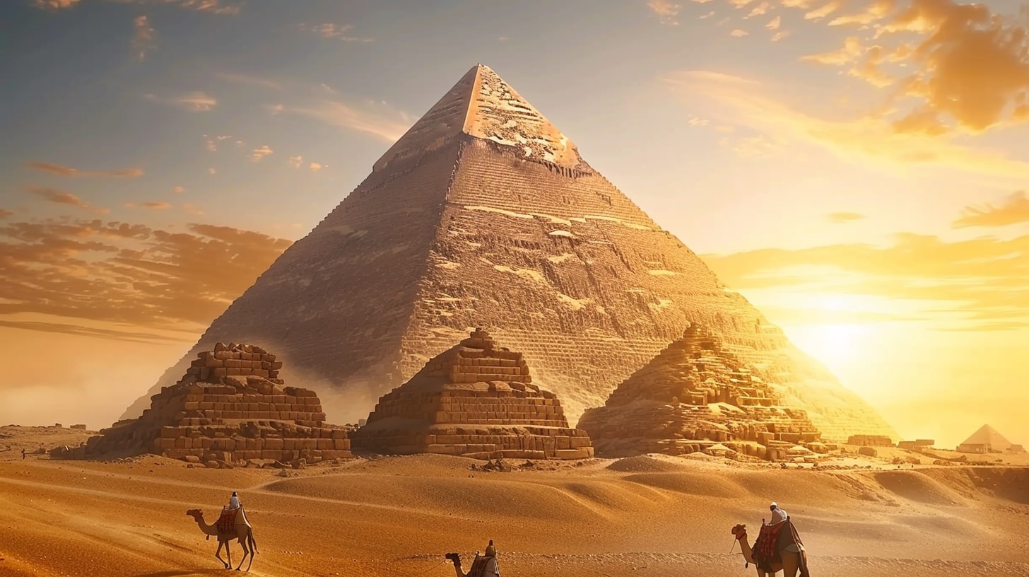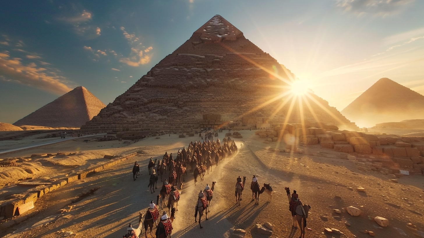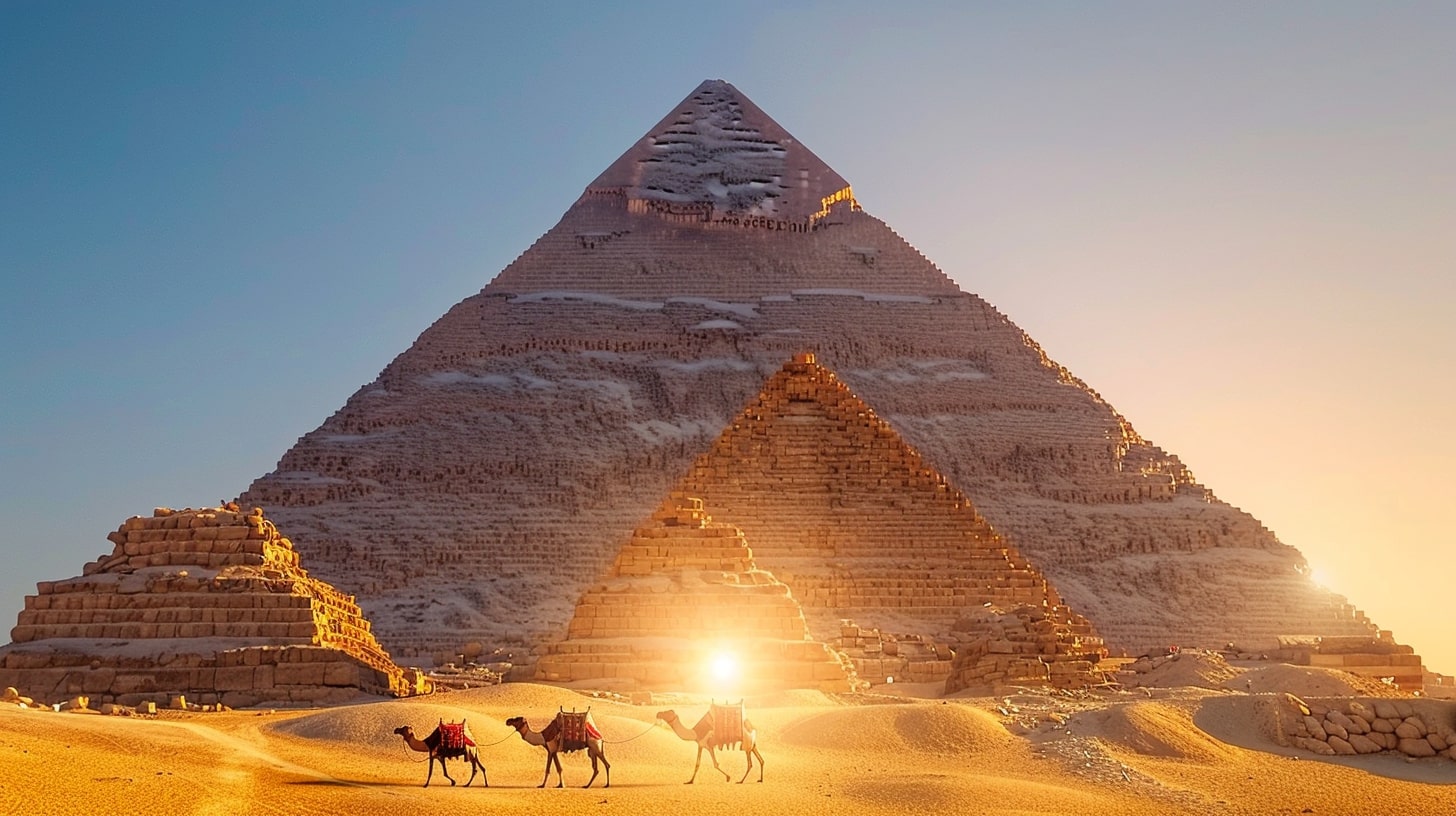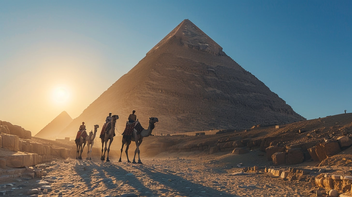 Great Pyramid of Giza, the largest pyramid towering under a clear blue sky, a camel caravan passing by in the foreground, golden sunset casting long shadows, realistic photography, captured with a Canon EOS 5D Mark IV, DSLR camera with a 24mm lens --ar 16:9