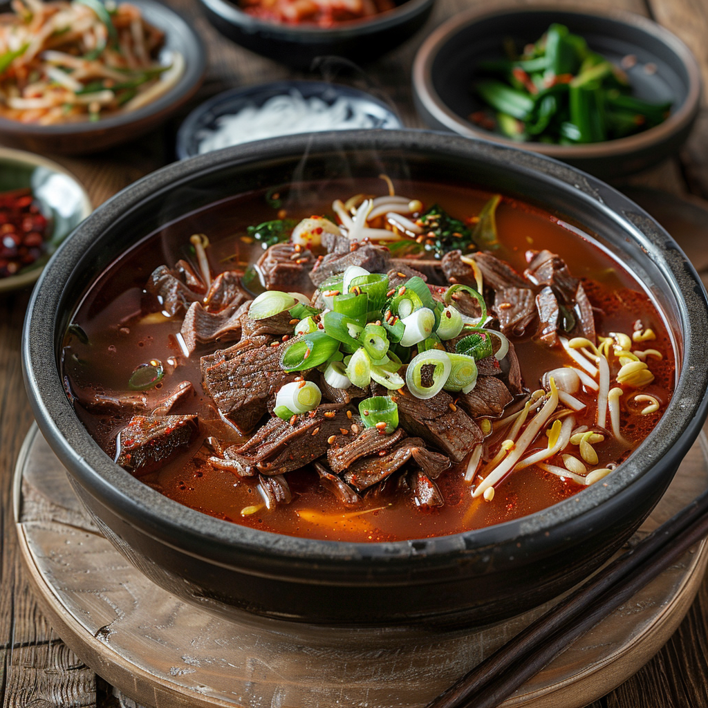 육개장은 매콤하고 영양 가득한 한국 전통 국물 요리로, 특히 여름철 보양식으로 자주 찾게 되지만, 추운 겨울에도 몸을 따뜻하게 해주는 음식입니다. 쇠고기 양지머리나 사태를 사용하여 진하고 풍부한 맛을 내며, 다양한 채소와 함께 끓여 내면 그 맛이 일품입니다.