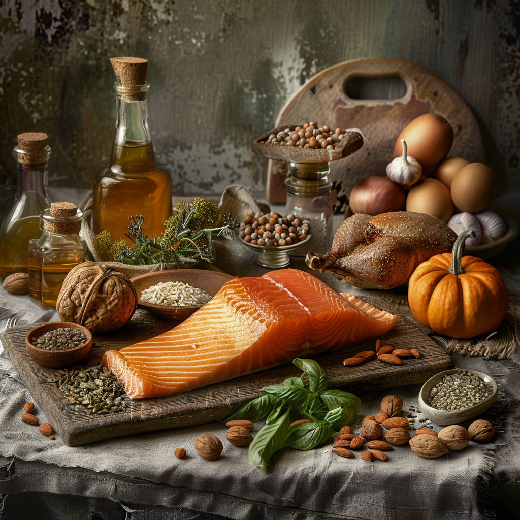 오메가-3 지방산은 염증을 감소시키는 데 도움이 됩니다. 연어, 참치와 같은 기름진 생선, 아마씨, 호두 등을 섭취하면 좋습니다.