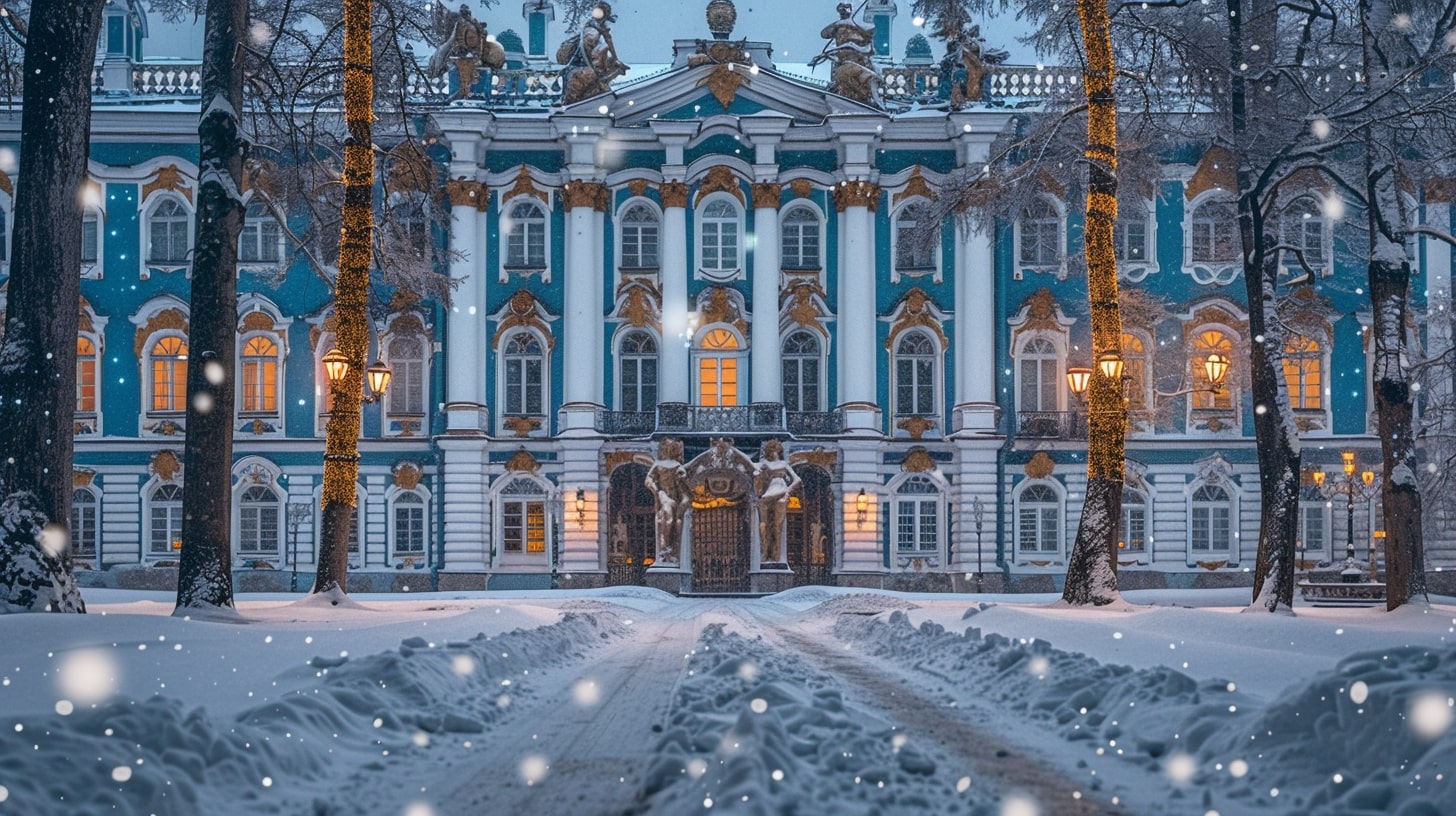 상트 페테르부르크의 겨울 궁전의 모습은 겨울 저녁에 더욱 몽환적이고 아름답습니다. 이 궁전은 화려한 바로크 양식으로 지어져 있으며, 눈이 내리는 저녁에는 더욱 독특한 분위기를 자아냅니다. 궁전의 외관과 장식은 세밀하고 정교한 디테일로 가득 차 있으며, 눈이 내릴 때는 이 장식들이 눈에 반사되는 반짝이는 빛으로 인해 더욱 빛나 보입니다.