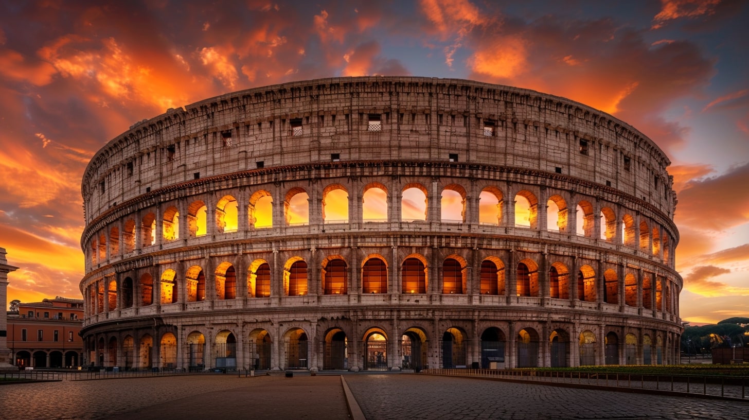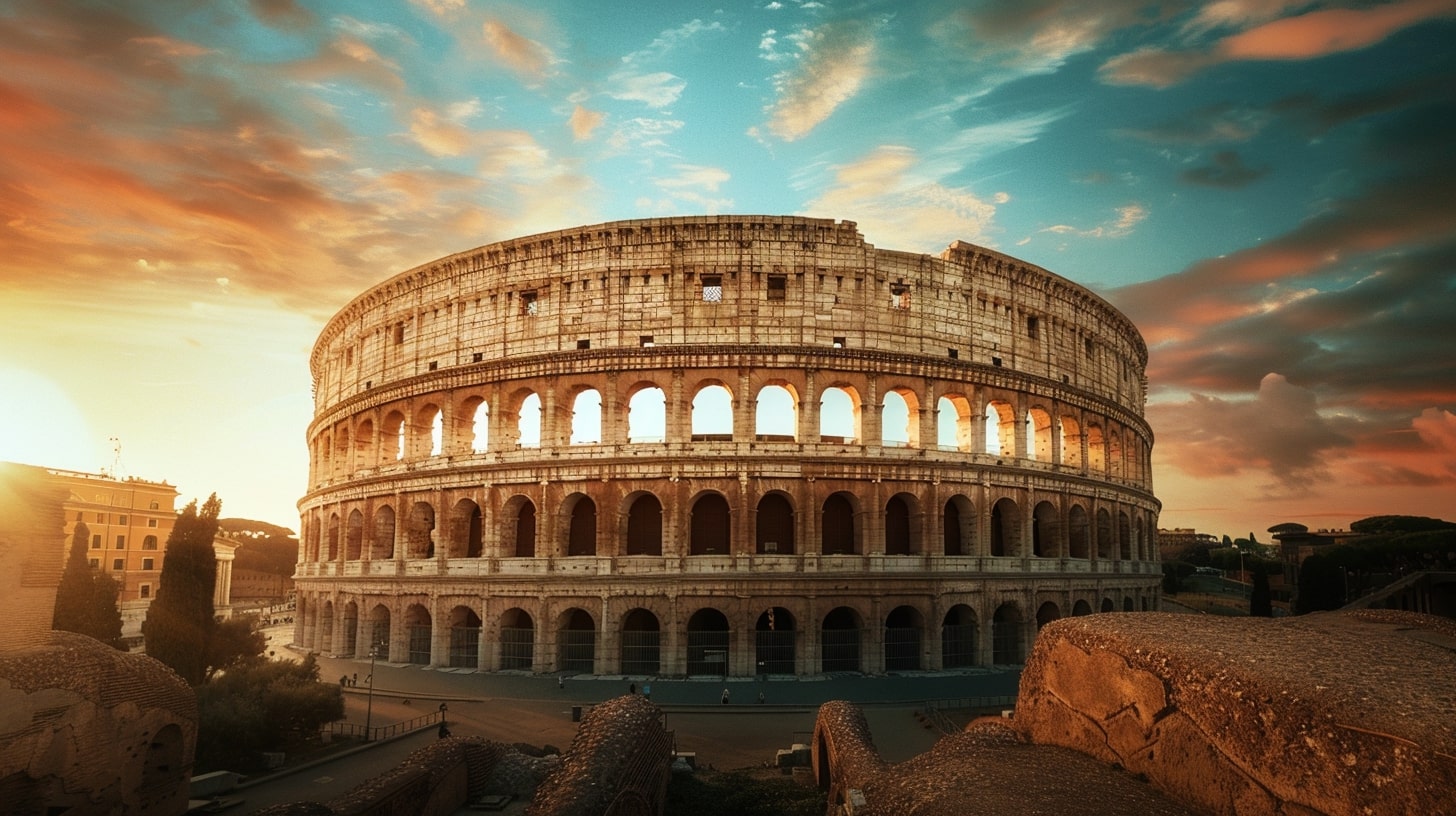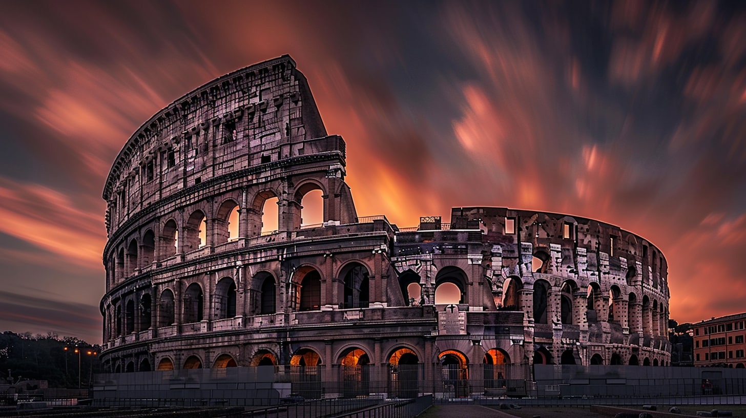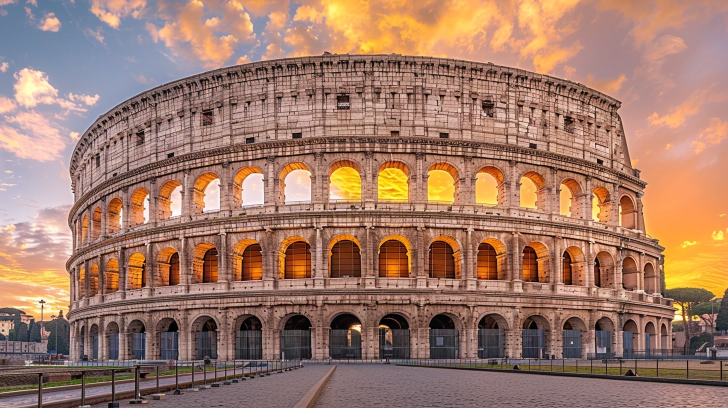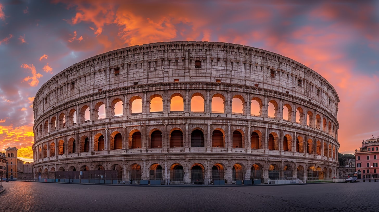 이탈리아 로마의 유명한 콜로세움을 해질녘에 배경으로 삼고 있습니다. 이 장면은 고대 건축의 웅장함과 역사적인 분위기를 강조하는데, 콜로세움의 상징적인 아치들이 오렌지색과 분홍색으로 물든 하늘을 배경으로 장엄하게 서 있습니다. 이러한 색감은 하늘이 저물어가는 순간의 평화롭고 고요한 느낌을 더욱 부각시킵니다. 사진은 고해상도로 촬영되어 건축물의 세밀한 부분까지 생생하게 포착할 수 있으며, 광각 렌즈의 DSLR 설정을 사용하여 넓은 시야를 제공하는 16:9 비율로 구성되어 있습니다. 이로 인해 관람자는 마치 그 현장에 있는 것처럼 콜로세움의 웅장함을 느낄 수 있습니다.