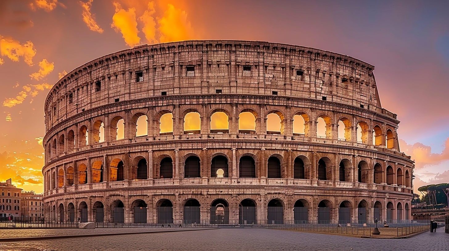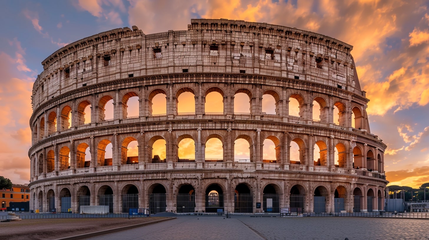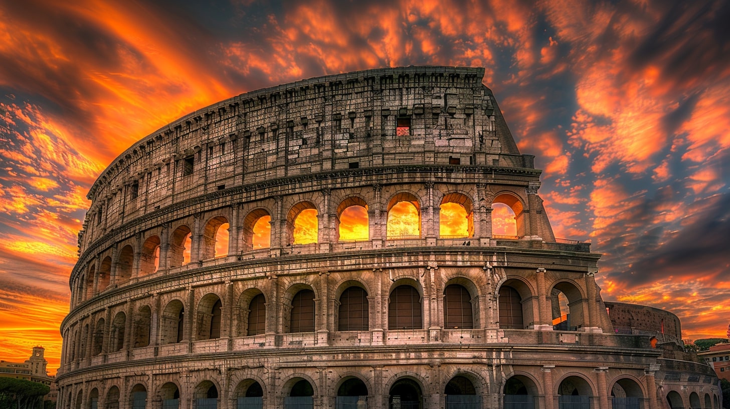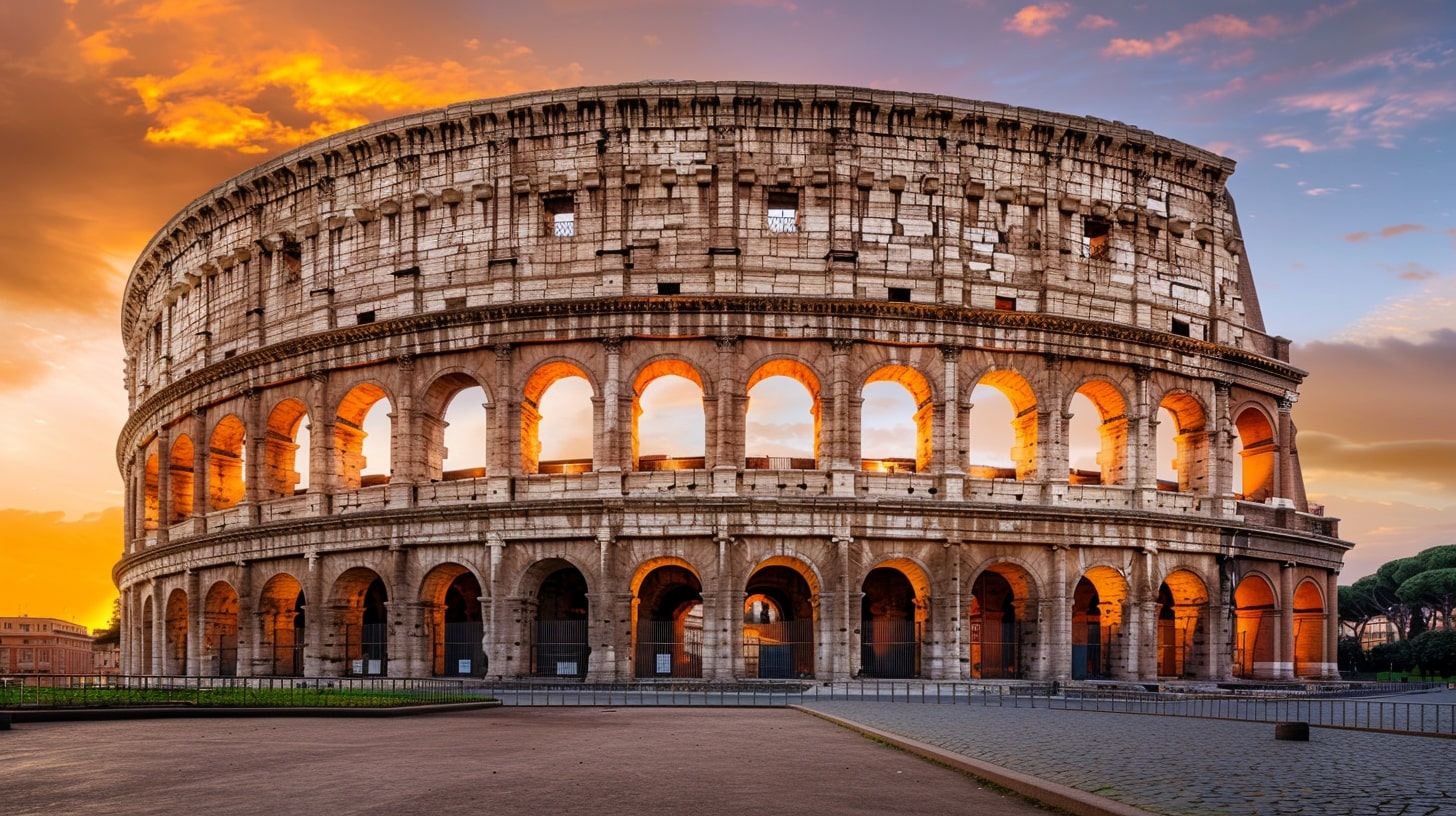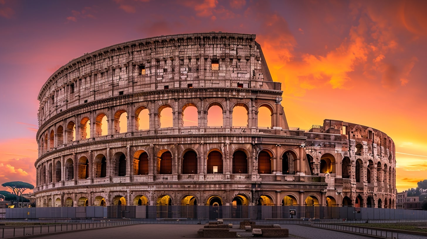 이탈리아 로마의 유명한 콜로세움을 해질녘에 배경으로 삼고 있습니다. 이 장면은 고대 건축의 웅장함과 역사적인 분위기를 강조하는데, 콜로세움의 상징적인 아치들이 오렌지색과 분홍색으로 물든 하늘을 배경으로 장엄하게 서 있습니다. 이러한 색감은 하늘이 저물어가는 순간의 평화롭고 고요한 느낌을 더욱 부각시킵니다. 사진은 고해상도로 촬영되어 건축물의 세밀한 부분까지 생생하게 포착할 수 있으며, 광각 렌즈의 DSLR 설정을 사용하여 넓은 시야를 제공하는 16:9 비율로 구성되어 있습니다. 이로 인해 관람자는 마치 그 현장에 있는 것처럼 콜로세움의 웅장함을 느낄 수 있습니다.
