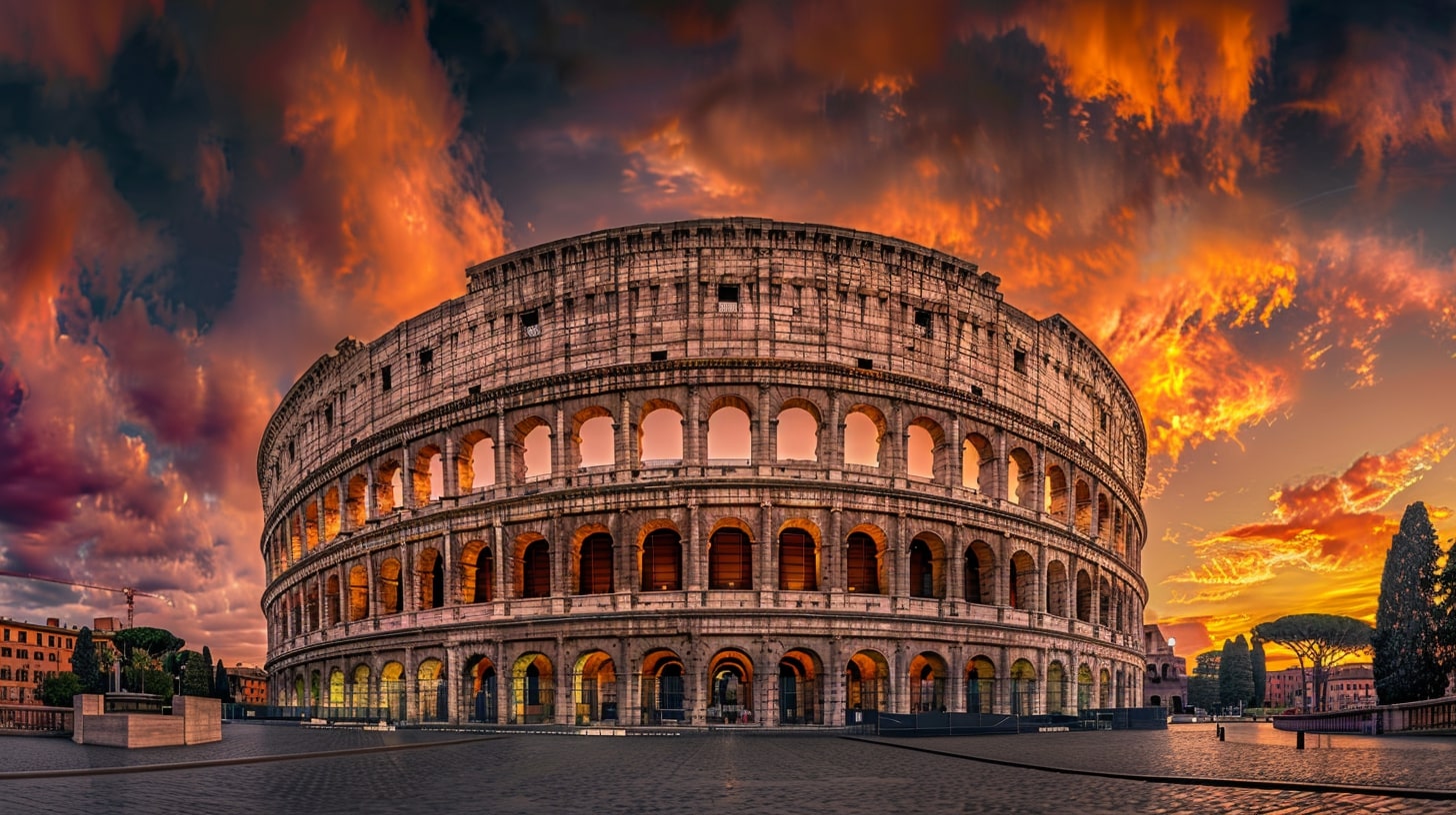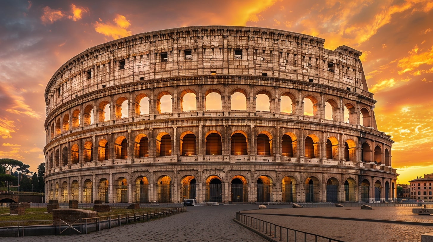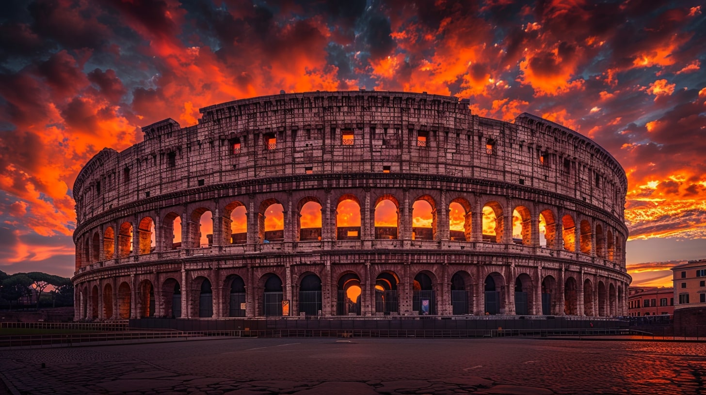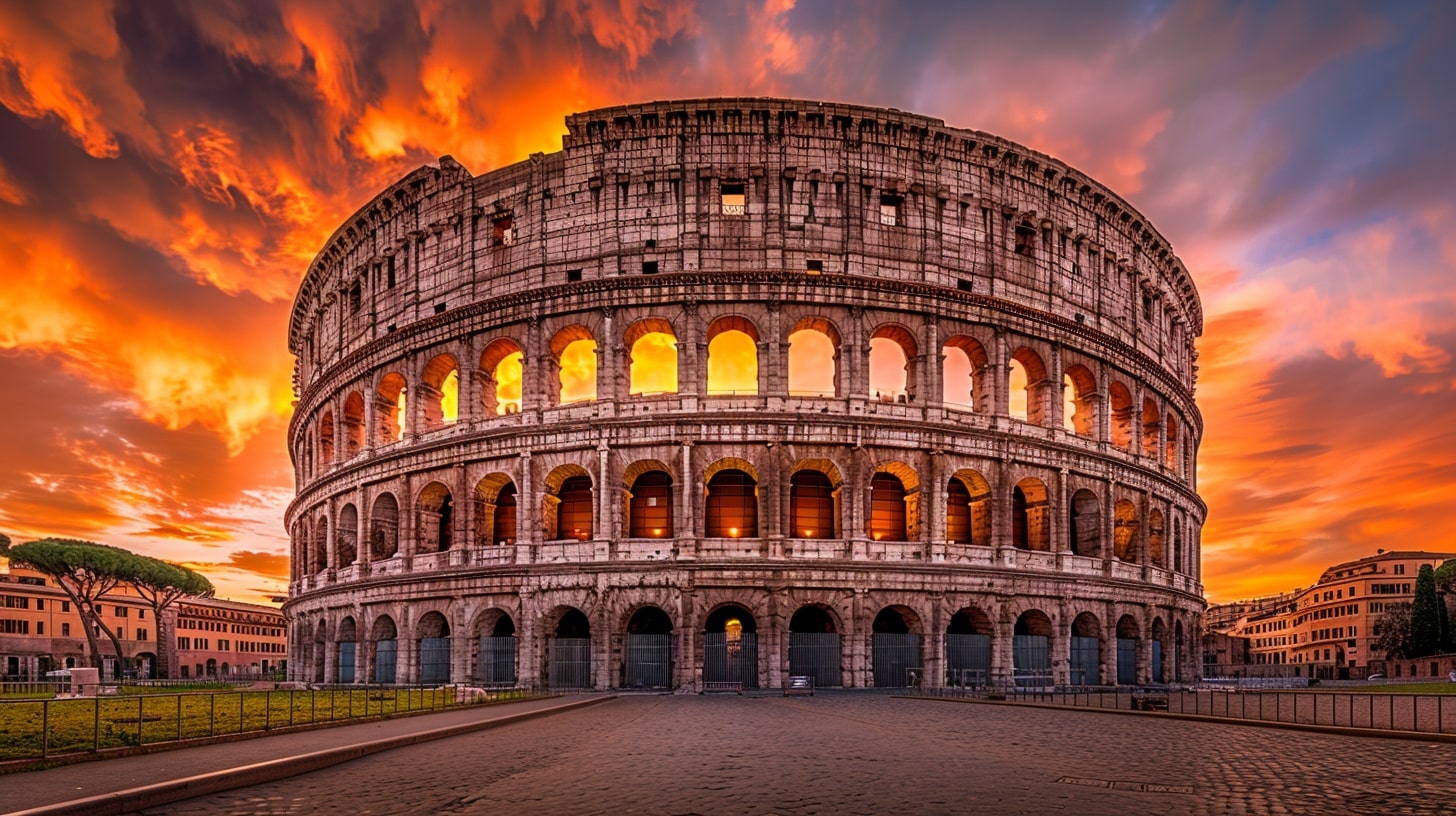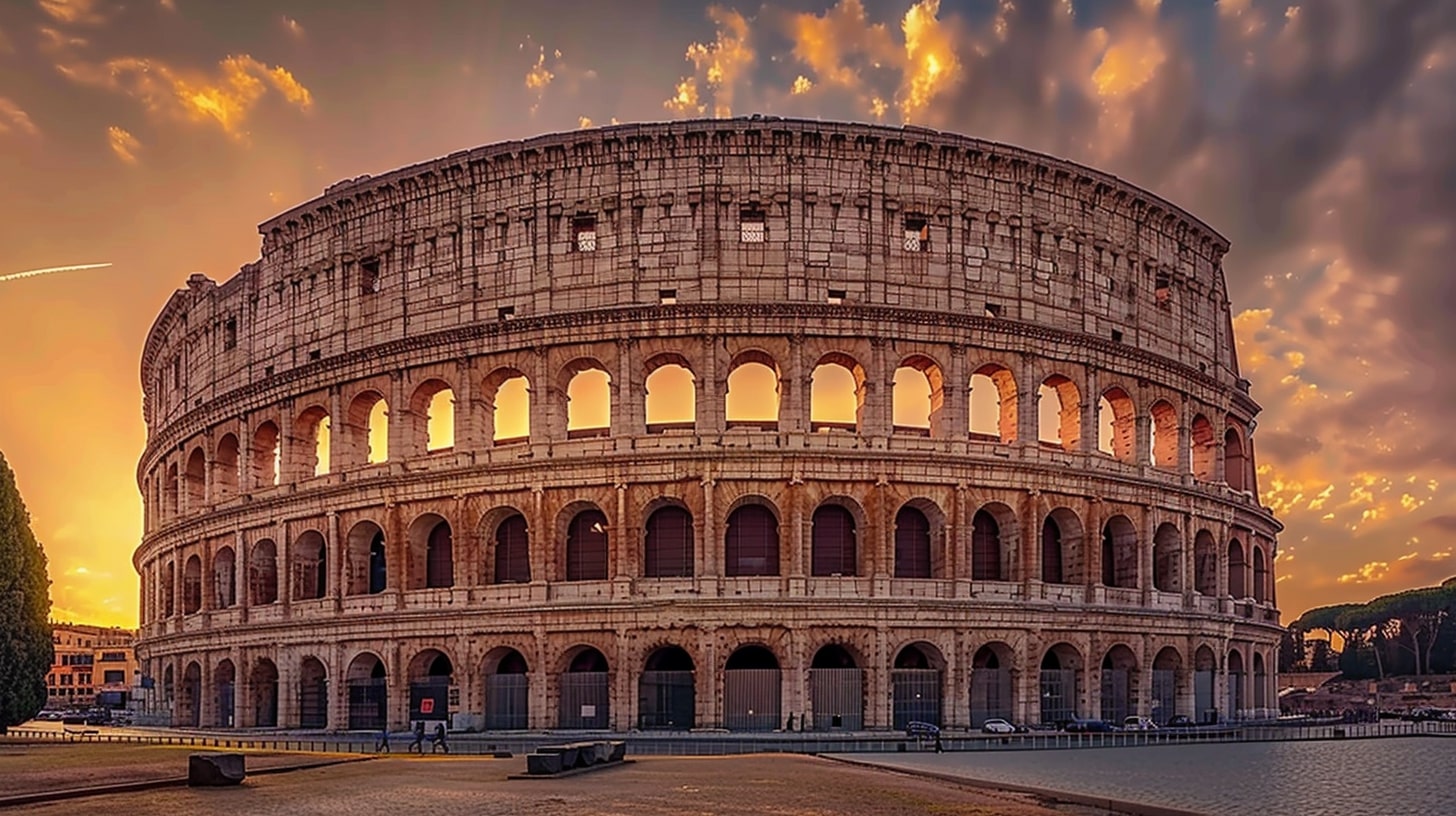 이탈리아 로마의 유명한 콜로세움을 해질녘에 배경으로 삼고 있습니다. 이 장면은 고대 건축의 웅장함과 역사적인 분위기를 강조하는데, 콜로세움의 상징적인 아치들이 오렌지색과 분홍색으로 물든 하늘을 배경으로 장엄하게 서 있습니다. 이러한 색감은 하늘이 저물어가는 순간의 평화롭고 고요한 느낌을 더욱 부각시킵니다. 사진은 고해상도로 촬영되어 건축물의 세밀한 부분까지 생생하게 포착할 수 있으며, 광각 렌즈의 DSLR 설정을 사용하여 넓은 시야를 제공하는 16:9 비율로 구성되어 있습니다. 이로 인해 관람자는 마치 그 현장에 있는 것처럼 콜로세움의 웅장함을 느낄 수 있습니다.