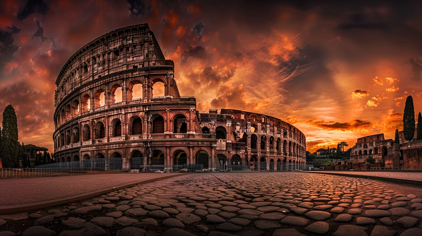 The image you describe is set against the backdrop of the famous Colosseum in Rome, Italy, at sunset. The scene emphasizes the grandeur of the ancient architecture and the historical atmosphere, with the iconic arches of the Colosseum standing majestically against a sky tinted with orange and pink. These colors add to the sense of peace and tranquility of the moment as the sky sets. The photo is shot in high resolution to capture every detail of the architecture, and is composed in a 16:9 ratio that uses a DSLR setting with a wide-angle lens to provide a wide field of view. This allows the viewer to feel the grandeur of the Colosseum as if they were there.