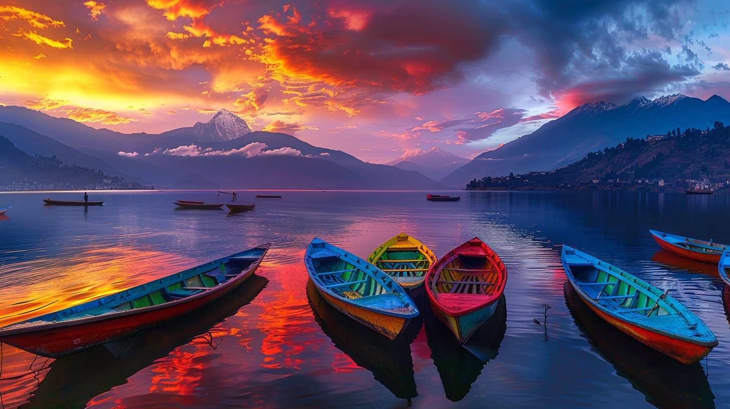Scenic Nepali landmark, panoramic view of Phewa Lake with the Annapurna range in the background at sunset, colorful boats floating on calm waters, peaceful lakeside setting with reflections of the mountains, tranquil and picturesque, realistic photography, DSLR photography with a high dynamic range setting to enhance the sunset colors and landscape details --ar 16:9