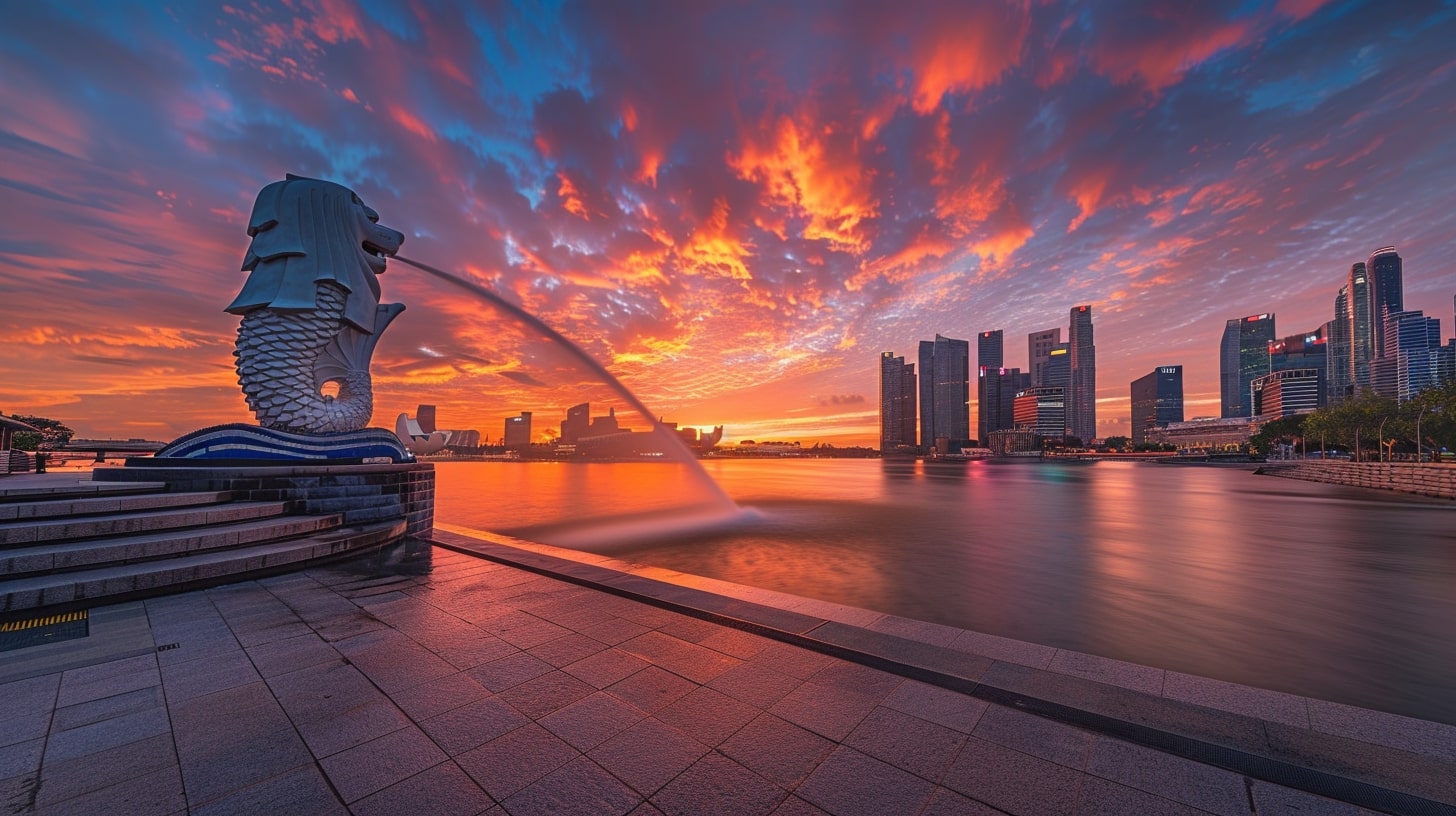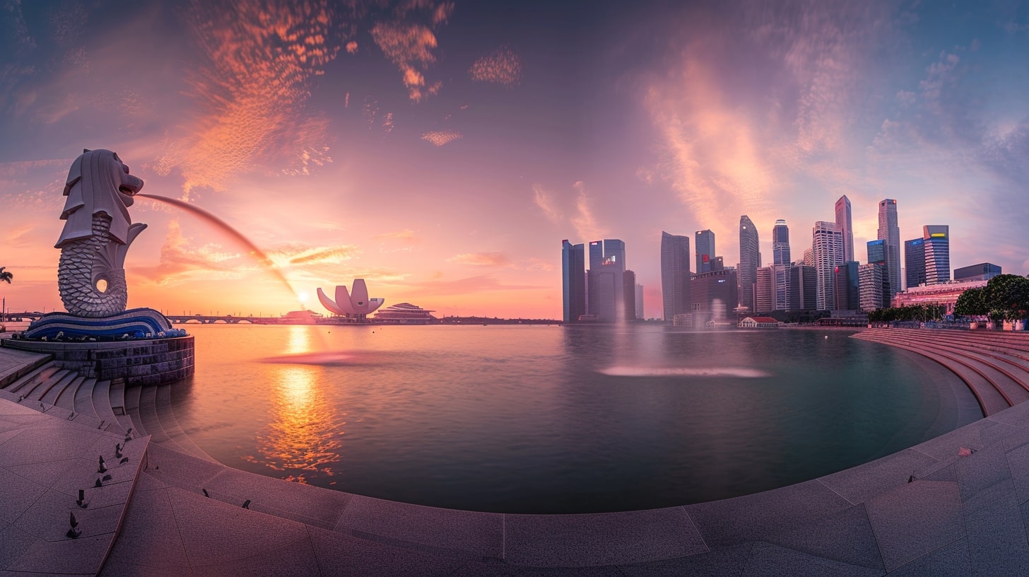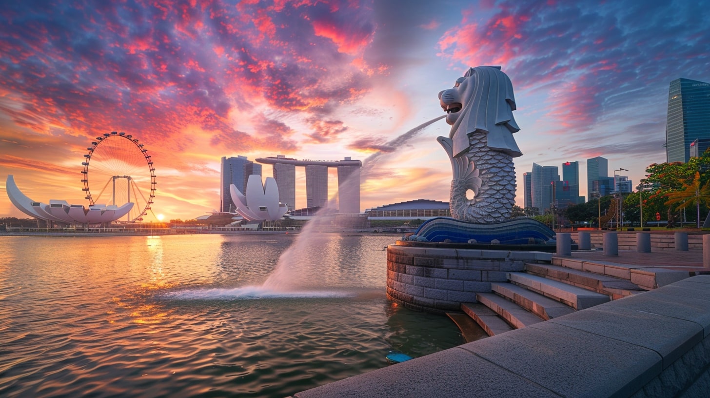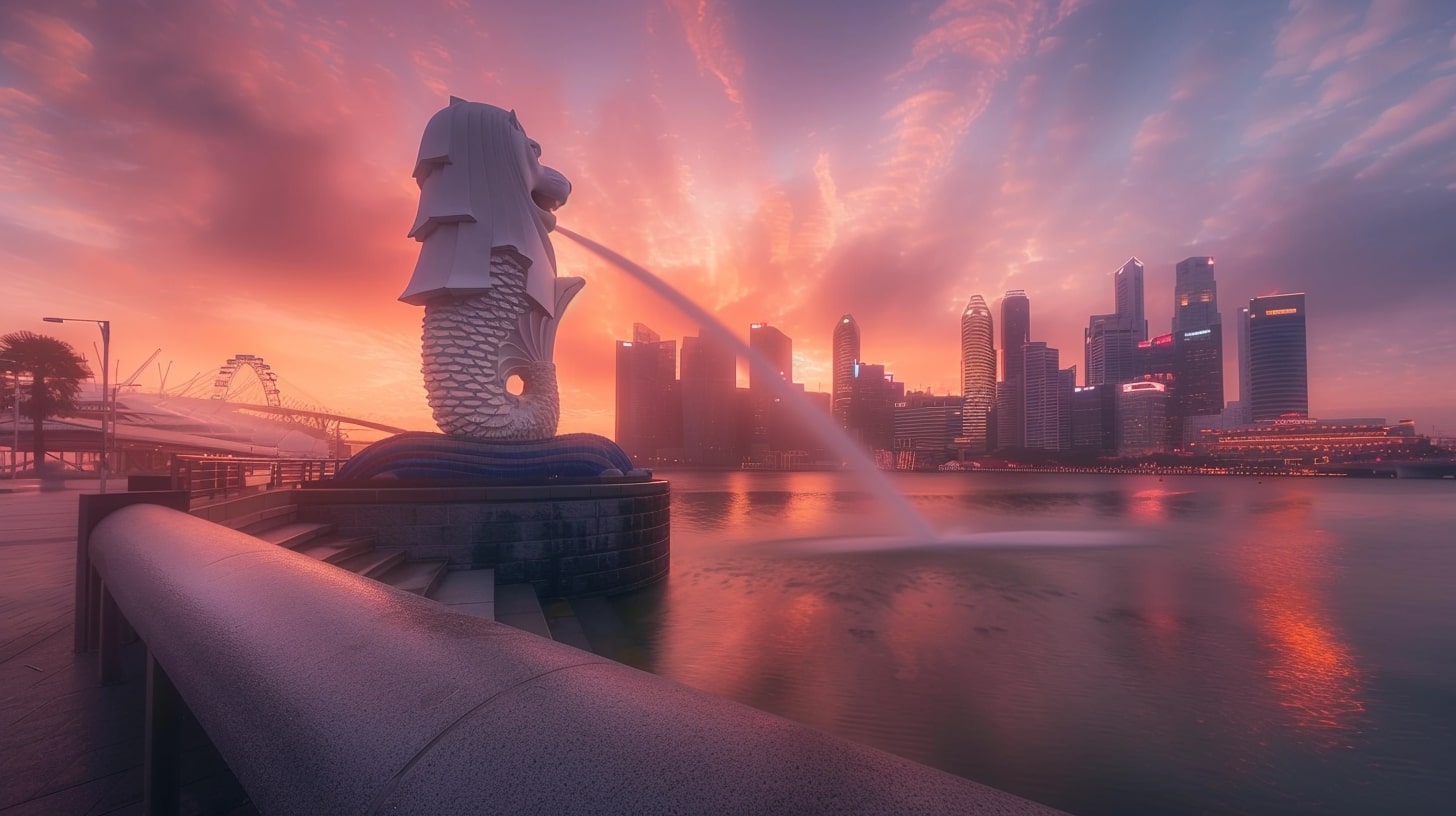 Merlion Park in the early morning, the iconic Merlion statue with water spouting from its mouth, Singapore skyline in the background, vibrant colors of the sunrise, captured with exceptional detail --ar 16:9