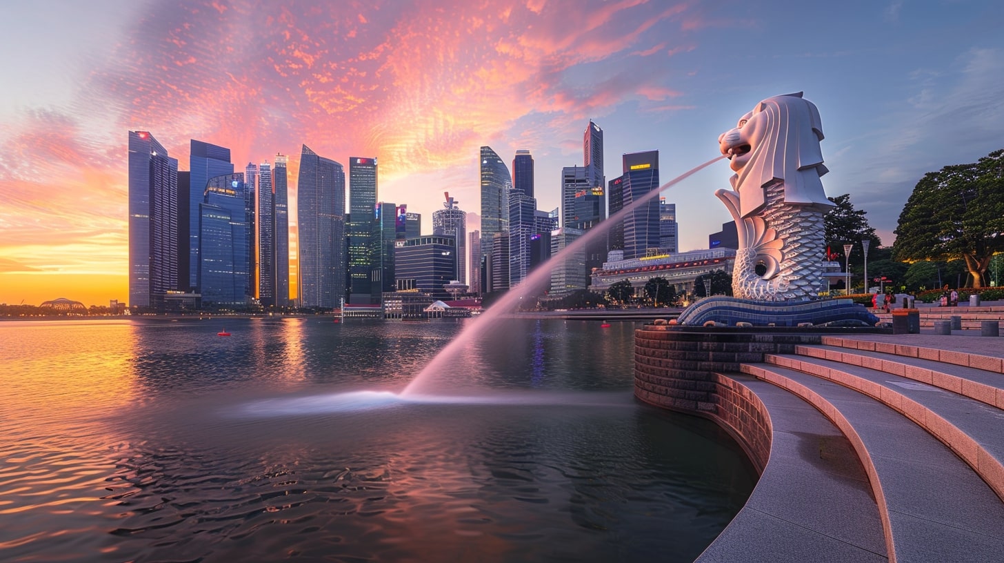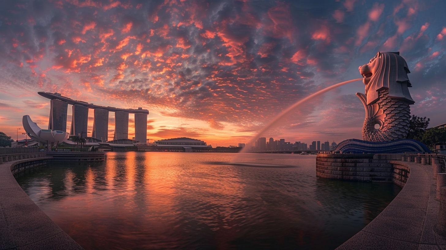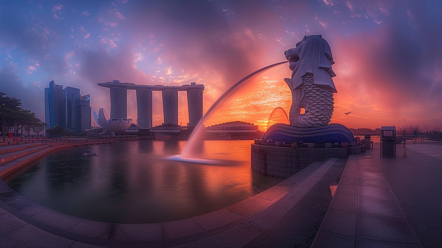 Merlion Park in the early morning, the iconic Merlion statue with water spouting from its mouth, Singapore skyline in the background, vibrant colors of the sunrise, captured with exceptional detail --ar 16:9