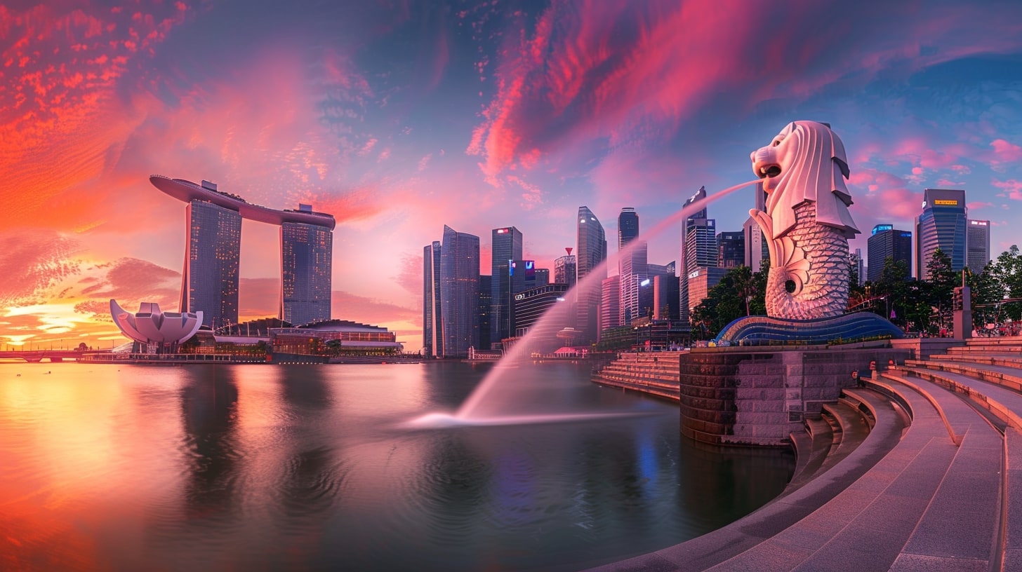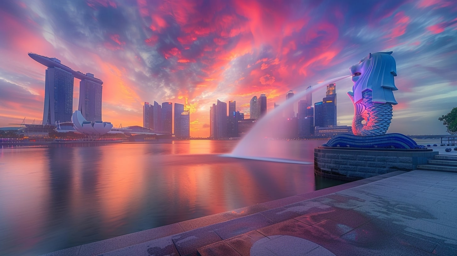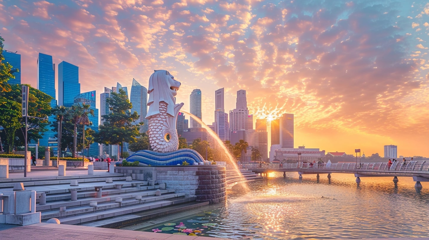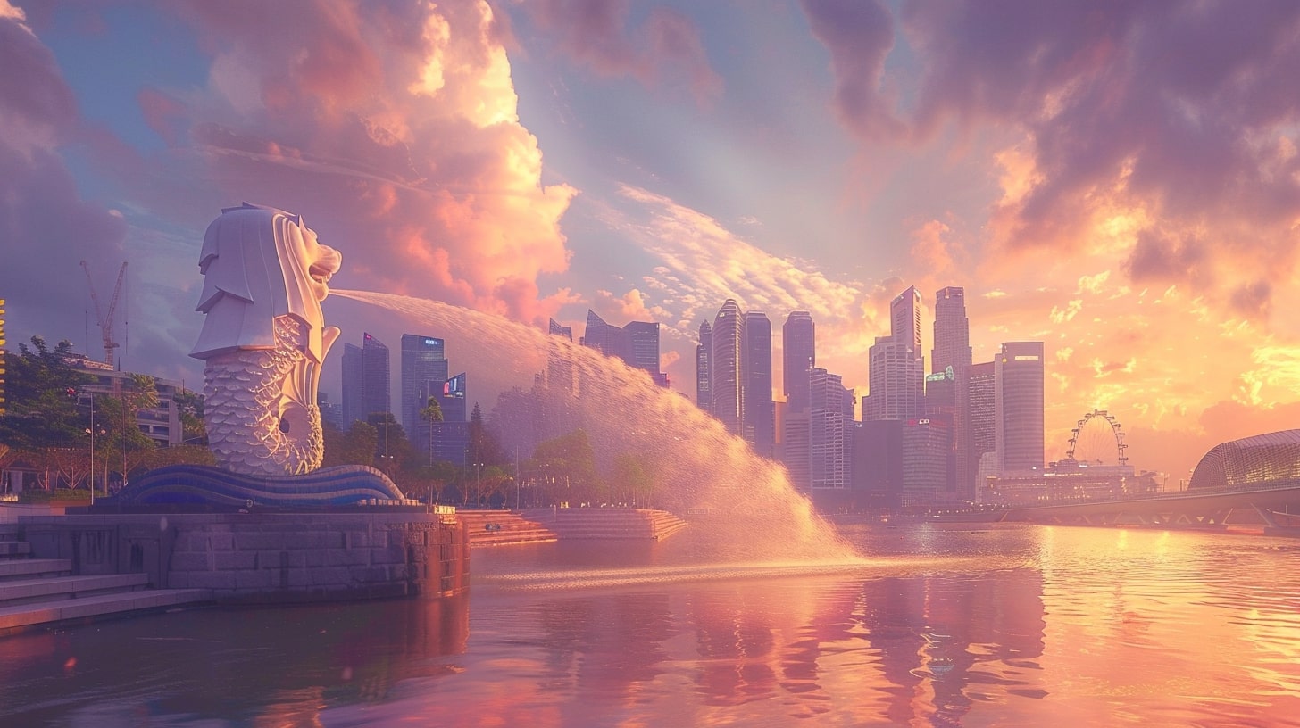 Merlion Park in the early morning, the iconic Merlion statue with water spouting from its mouth, Singapore skyline in the background, vibrant colors of the sunrise, captured with exceptional detail --ar 16:9
