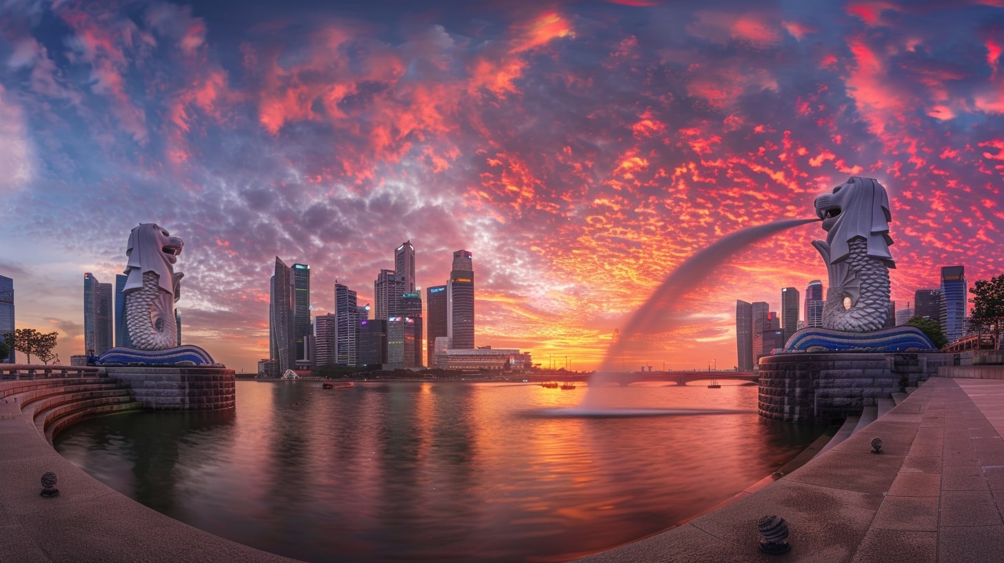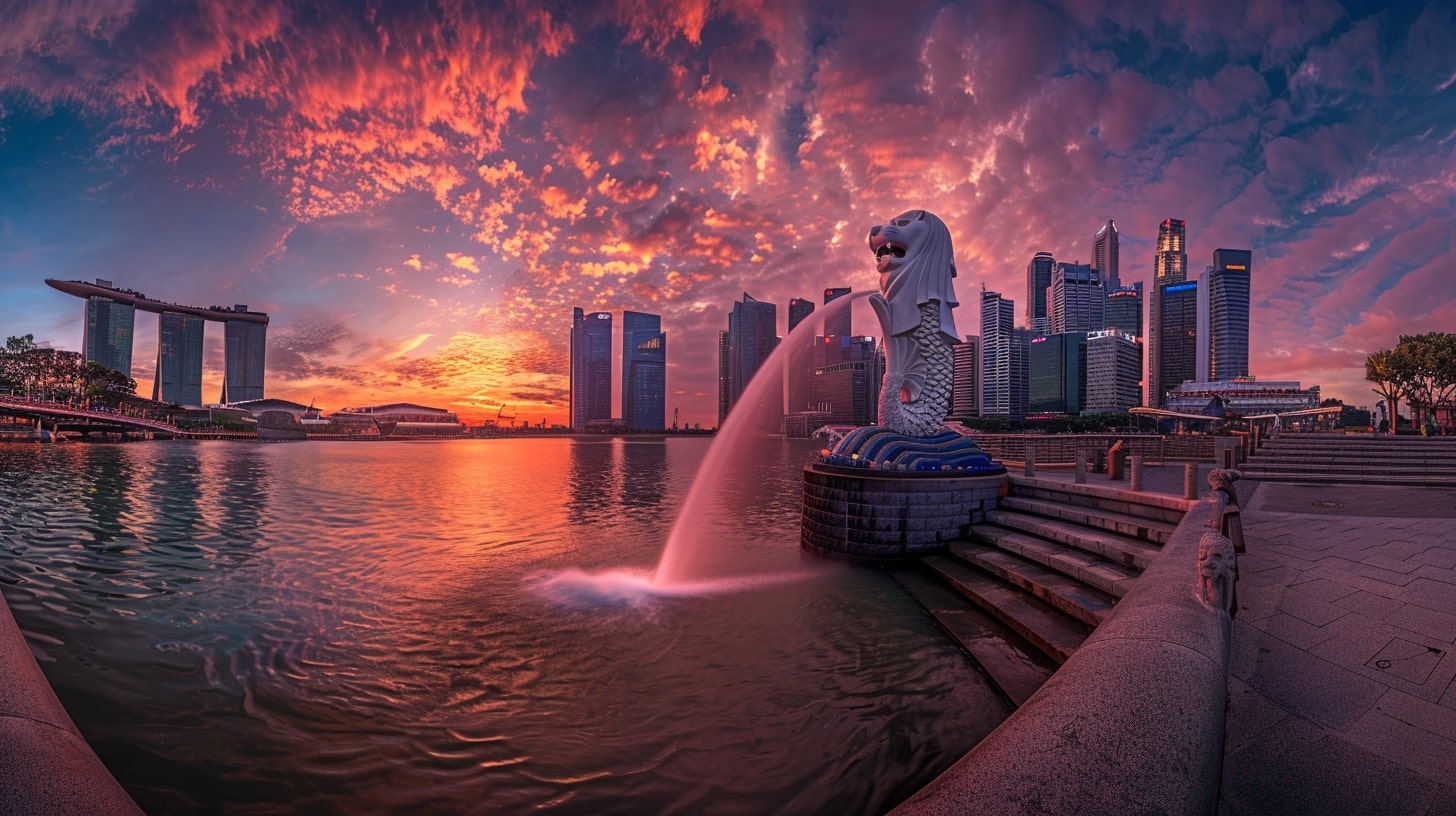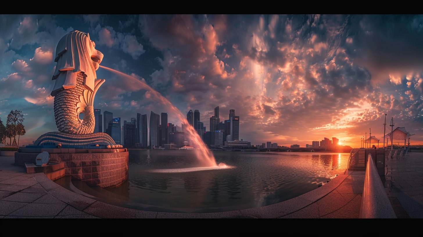 전체적으로 이 장면은 싱가포르의 역동성과 자연의 아름다움을 조화롭게 보여주며, 머라이언 동상이 도시와 자연을 연결하는 상징으로서의 역할을 강조합니다.