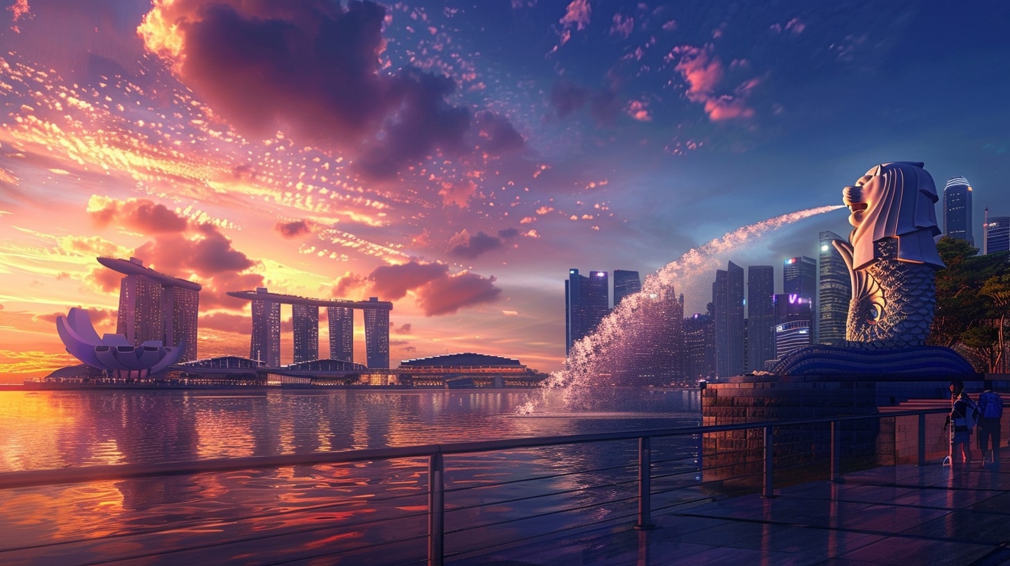 Overall, the scene blends the dynamism of Singapore with the beauty of nature, emphasizing the role of the Merlion statue as a symbol connecting the city and nature.