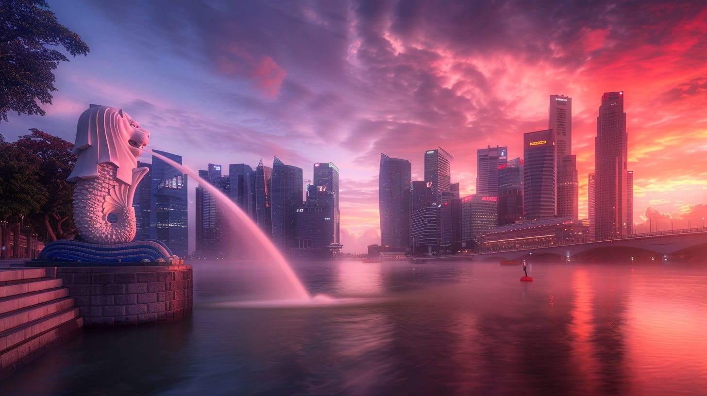 Merlion Park in the early morning, the iconic Merlion statue with water spouting from its mouth, Singapore skyline in the background, vibrant colors of the sunrise, captured with exceptional detail --ar 16:9