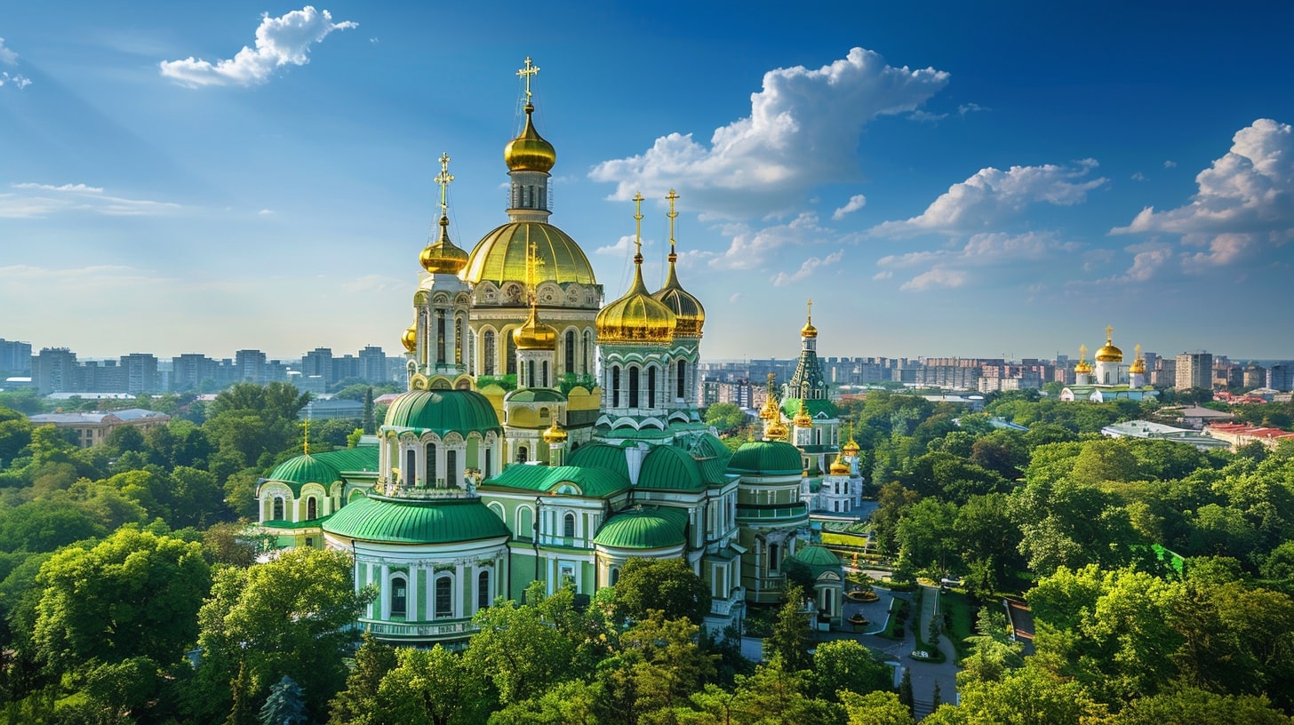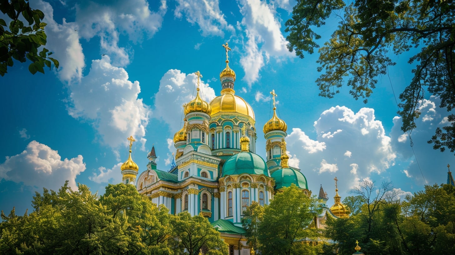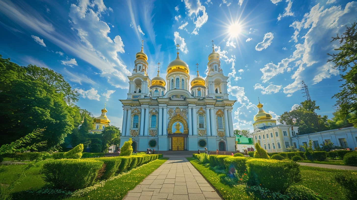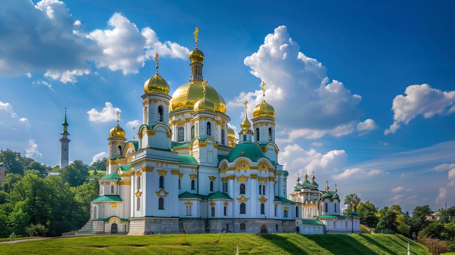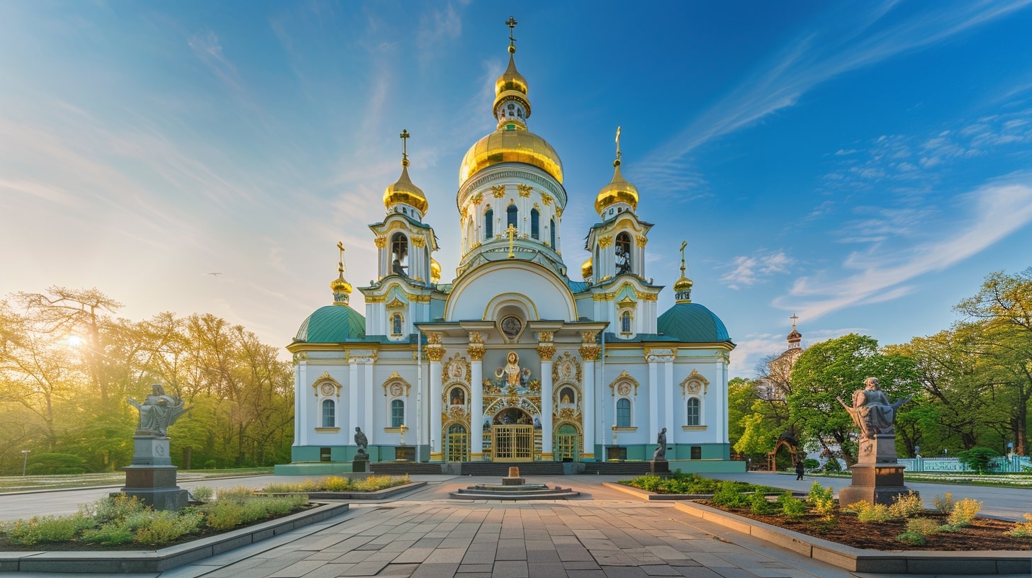 사진은 전문 풍경 사진가가 DSLR 카메라로 촬영한 것으로, 햇빛에 반사되어 빛나는 황금빛 돔이 중심을 이루고 있습니다. 성 소피아 대성당은 키예프의 상징적인 역사적 랜드마크로, 건물의 정교한 건축 디테일이 선명하게 드러납니다. 대성당 주변에는 생생한 푸른 하늘과 함께 무성한 녹색 식물들이 조화를 이루며, 전체적인 장면에 평화롭고 자연스러운 분위기를 더합니다. 이 모든 요소가 어우러져 16:9 비율의 넓은 화면에서 웅장하면서도 아름다운 풍경을 완성합니다.