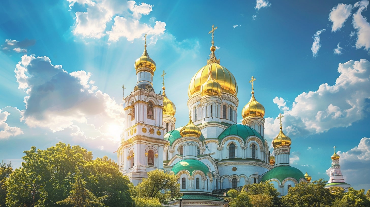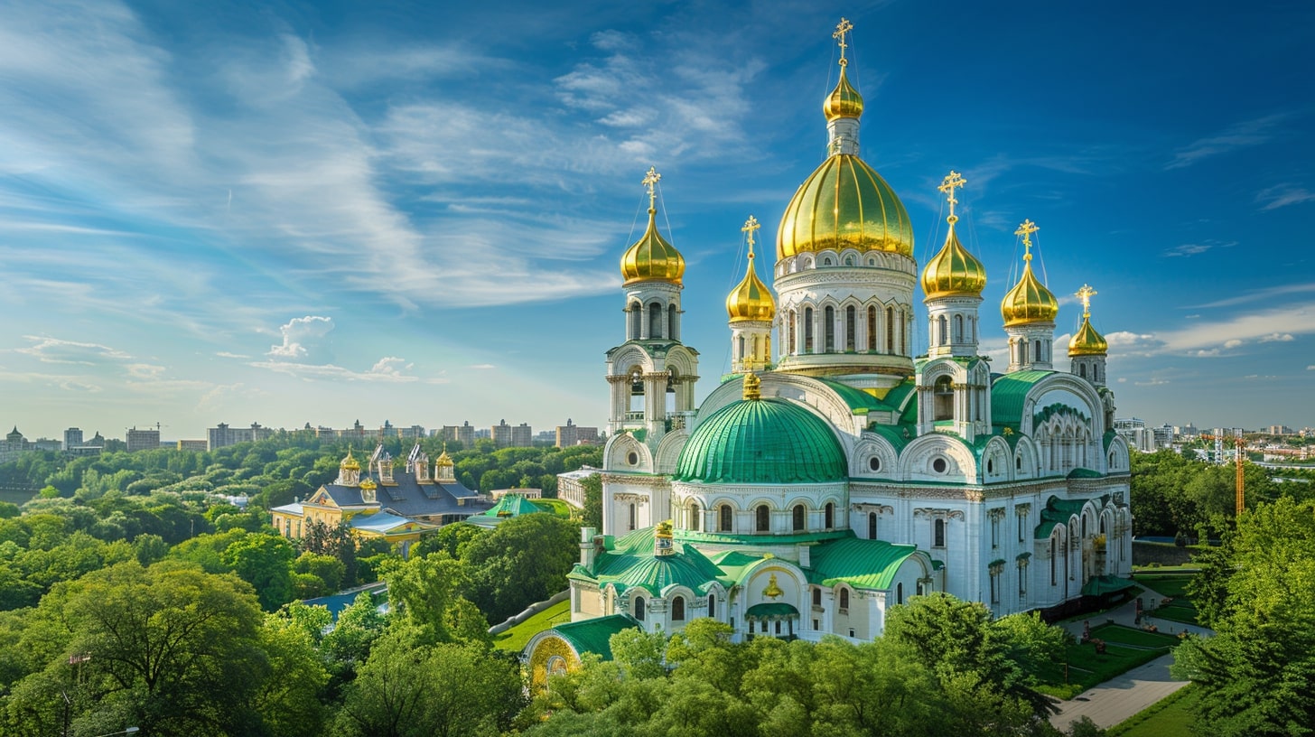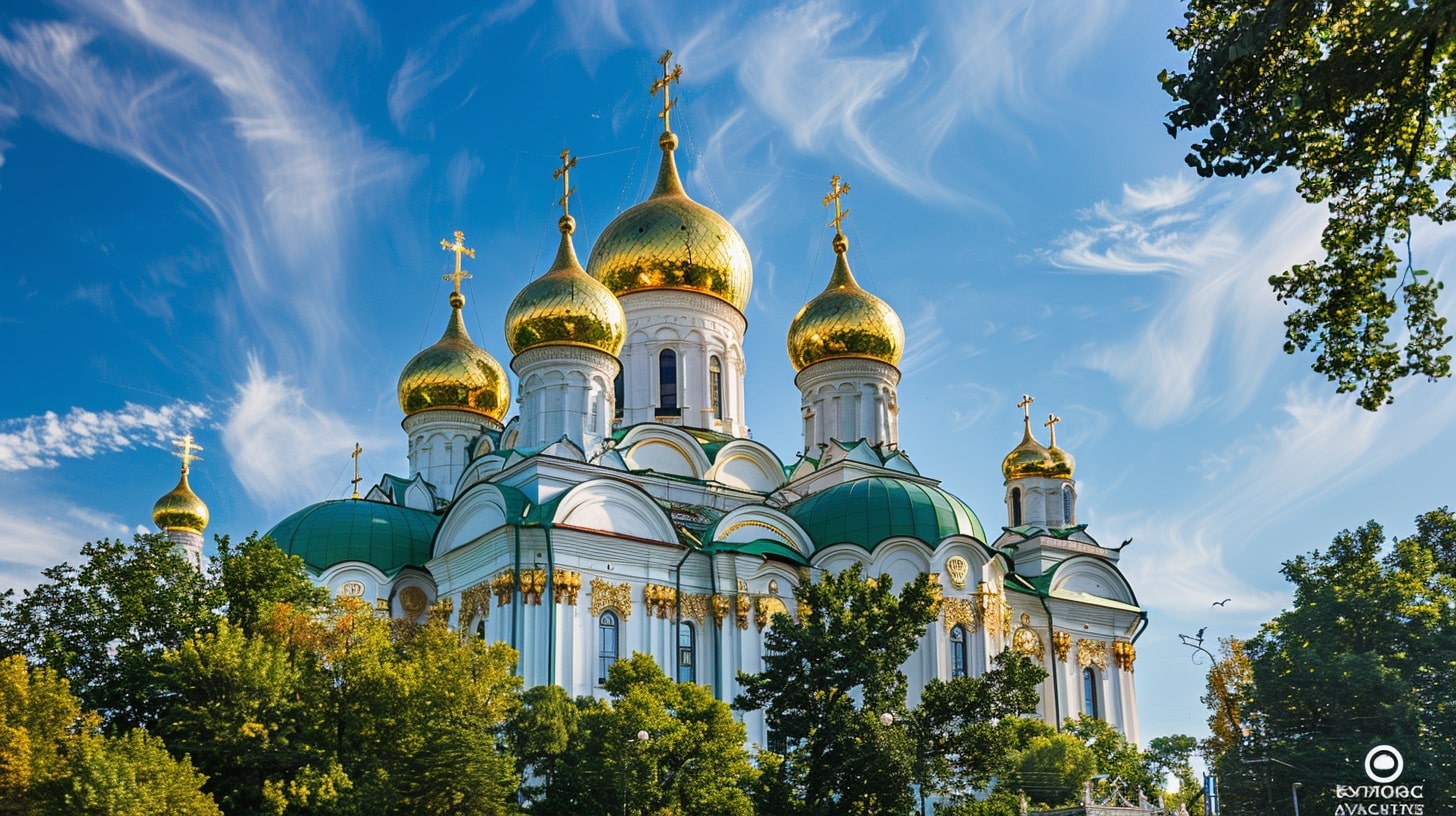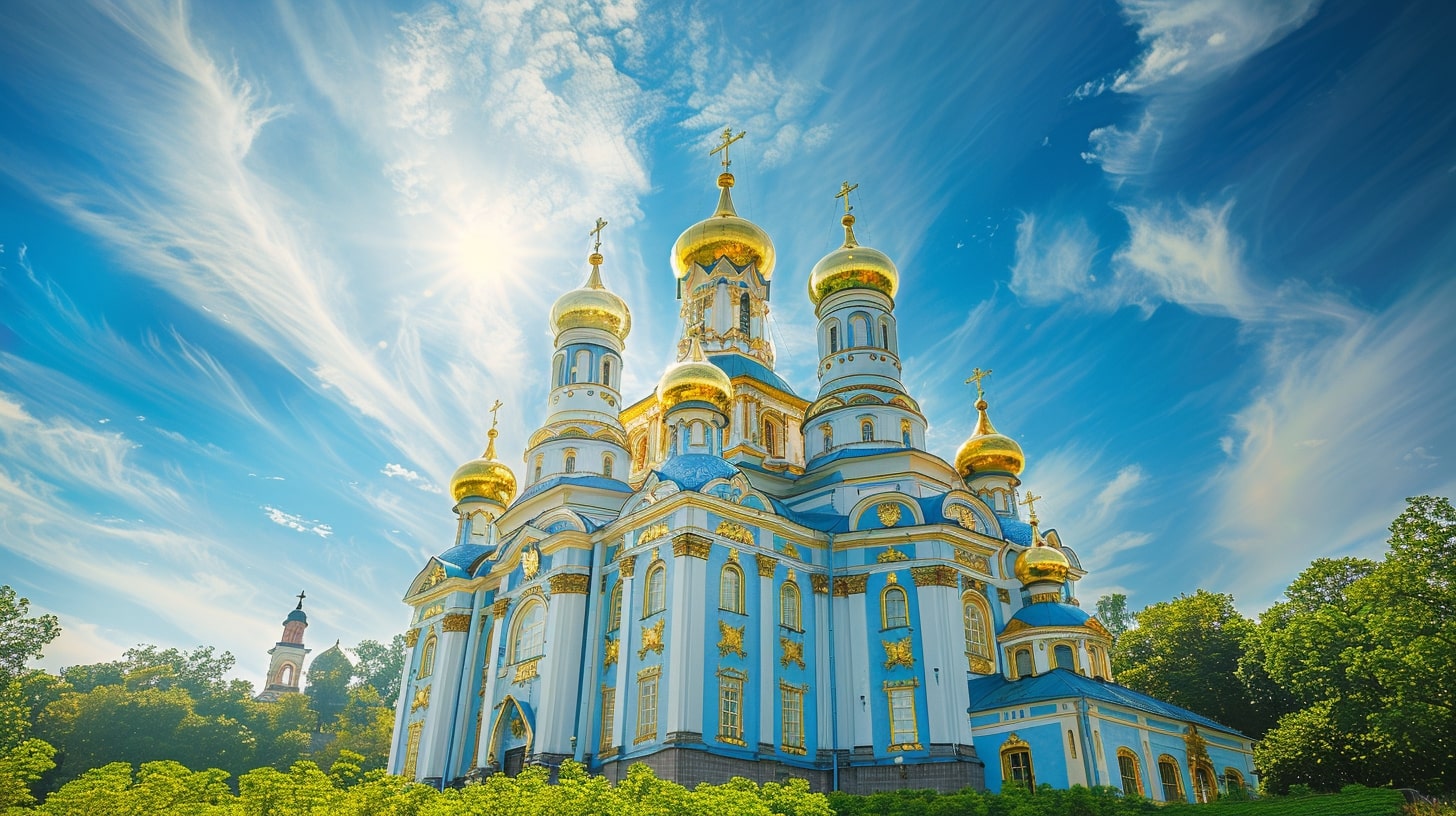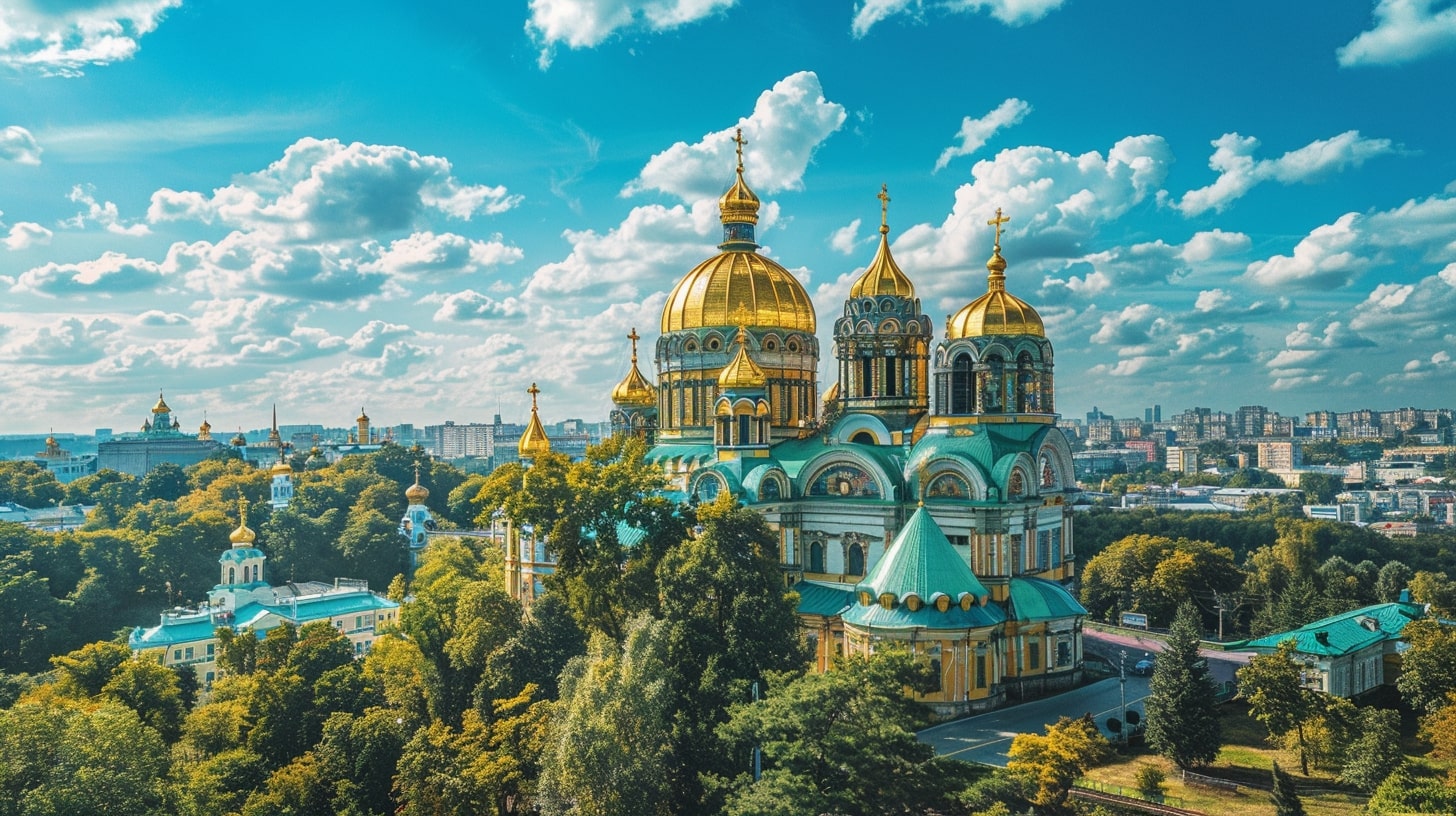 사진은 전문 풍경 사진가가 DSLR 카메라로 촬영한 것으로, 햇빛에 반사되어 빛나는 황금빛 돔이 중심을 이루고 있습니다. 성 소피아 대성당은 키예프의 상징적인 역사적 랜드마크로, 건물의 정교한 건축 디테일이 선명하게 드러납니다. 대성당 주변에는 생생한 푸른 하늘과 함께 무성한 녹색 식물들이 조화를 이루며, 전체적인 장면에 평화롭고 자연스러운 분위기를 더합니다. 이 모든 요소가 어우러져 16:9 비율의 넓은 화면에서 웅장하면서도 아름다운 풍경을 완성합니다.