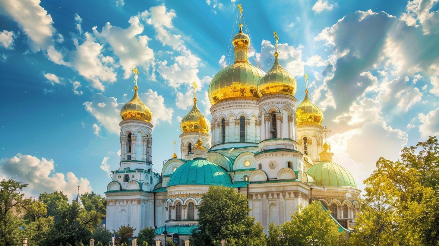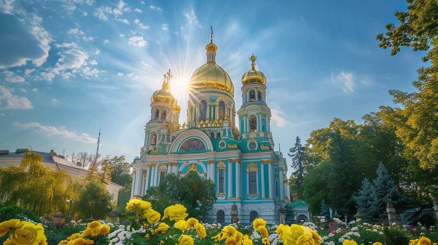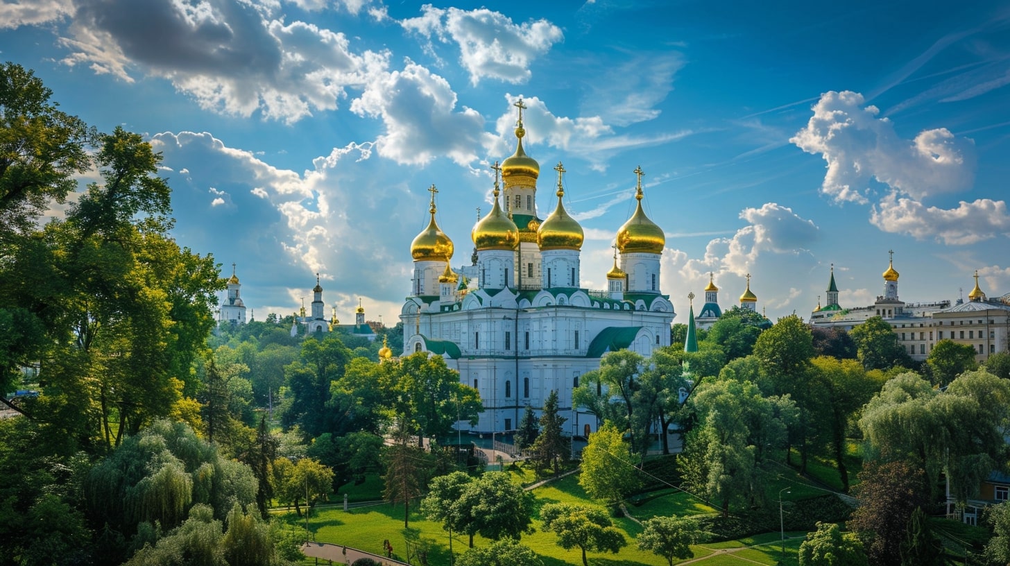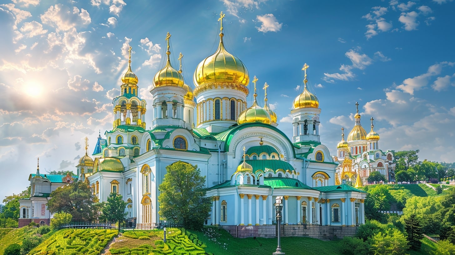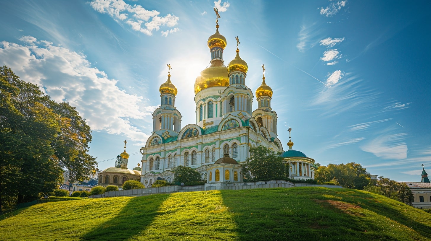 사진은 전문 풍경 사진가가 DSLR 카메라로 촬영한 것으로, 햇빛에 반사되어 빛나는 황금빛 돔이 중심을 이루고 있습니다. 성 소피아 대성당은 키예프의 상징적인 역사적 랜드마크로, 건물의 정교한 건축 디테일이 선명하게 드러납니다. 대성당 주변에는 생생한 푸른 하늘과 함께 무성한 녹색 식물들이 조화를 이루며, 전체적인 장면에 평화롭고 자연스러운 분위기를 더합니다. 이 모든 요소가 어우러져 16:9 비율의 넓은 화면에서 웅장하면서도 아름다운 풍경을 완성합니다.