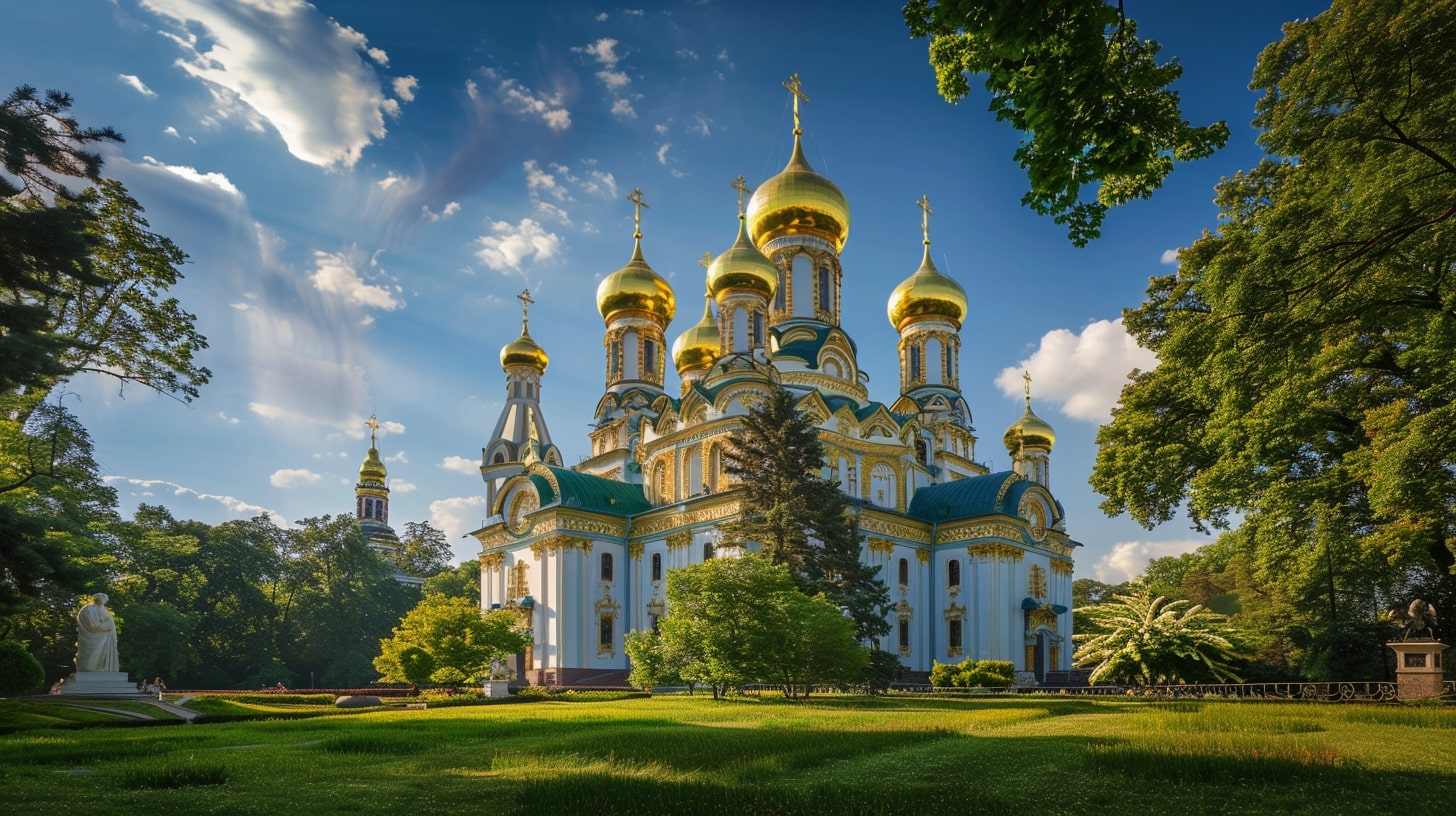 사진은 전문 풍경 사진가가 DSLR 카메라로 촬영한 것으로, 햇빛에 반사되어 빛나는 황금빛 돔이 중심을 이루고 있습니다. 성 소피아 대성당은 키예프의 상징적인 역사적 랜드마크로, 건물의 정교한 건축 디테일이 선명하게 드러납니다. 대성당 주변에는 생생한 푸른 하늘과 함께 무성한 녹색 식물들이 조화를 이루며, 전체적인 장면에 평화롭고 자연스러운 분위기를 더합니다. 이 모든 요소가 어우러져 16:9 비율의 넓은 화면에서 웅장하면서도 아름다운 풍경을 완성합니다.