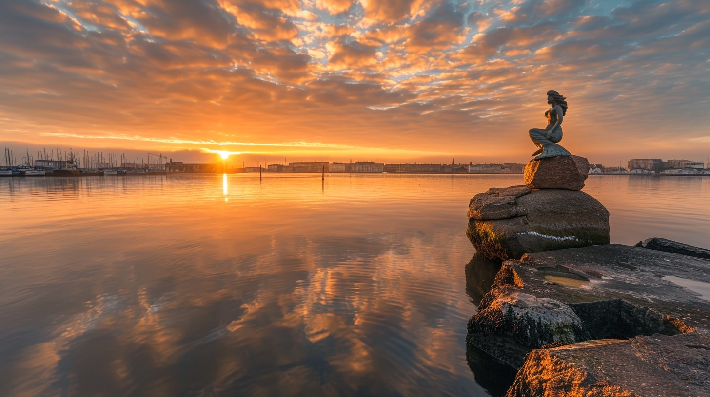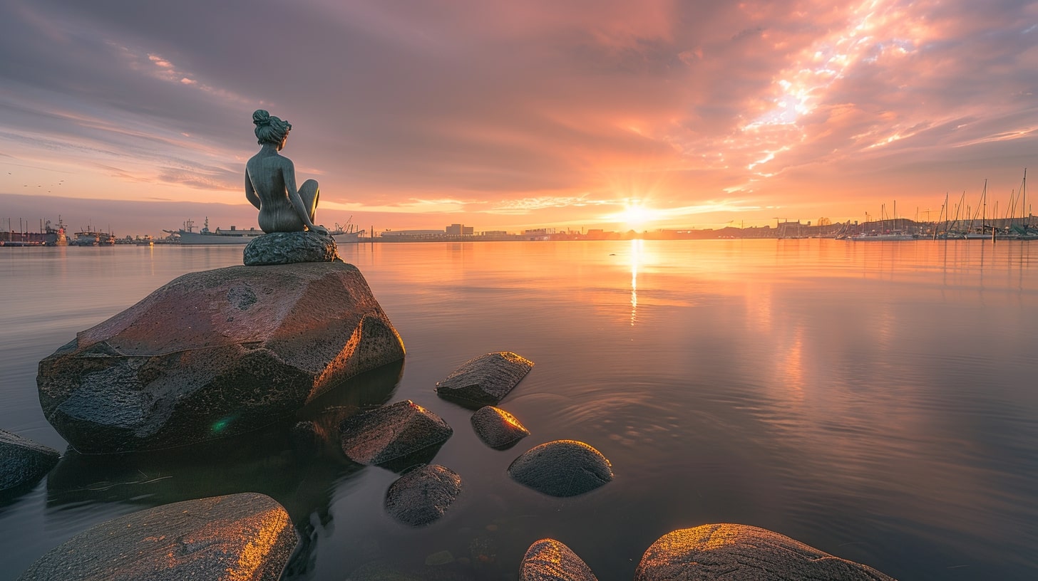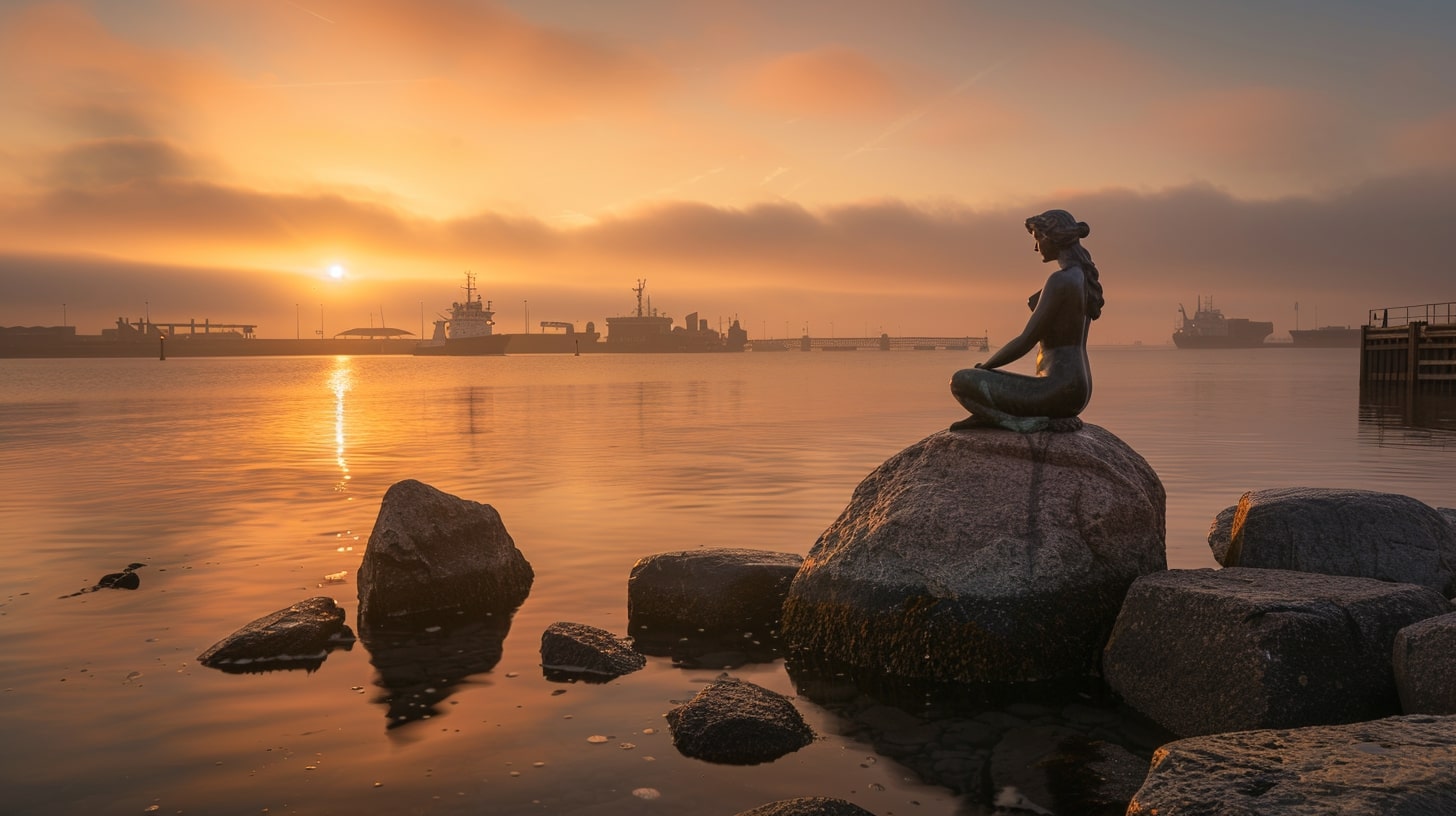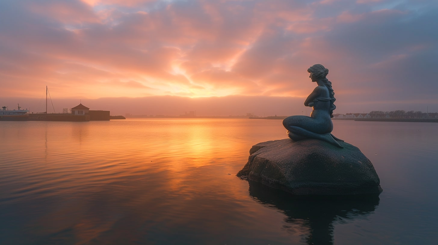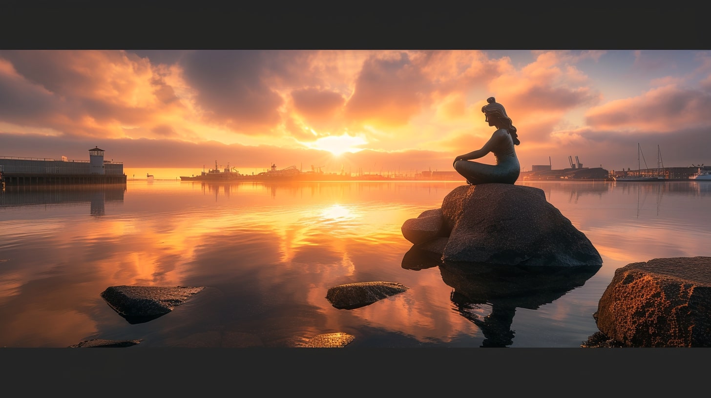 The Little Mermaid statue in Copenhagen, Denmark, captured at sunrise with a golden hue reflecting off the water, the statue sitting gracefully on a rock, surrounded by a calm harbor, professional landscape photography, Nikon D850, 24-70mm f/2.8 lens, ISO 100, f/8, 1/200s --ar 16:9