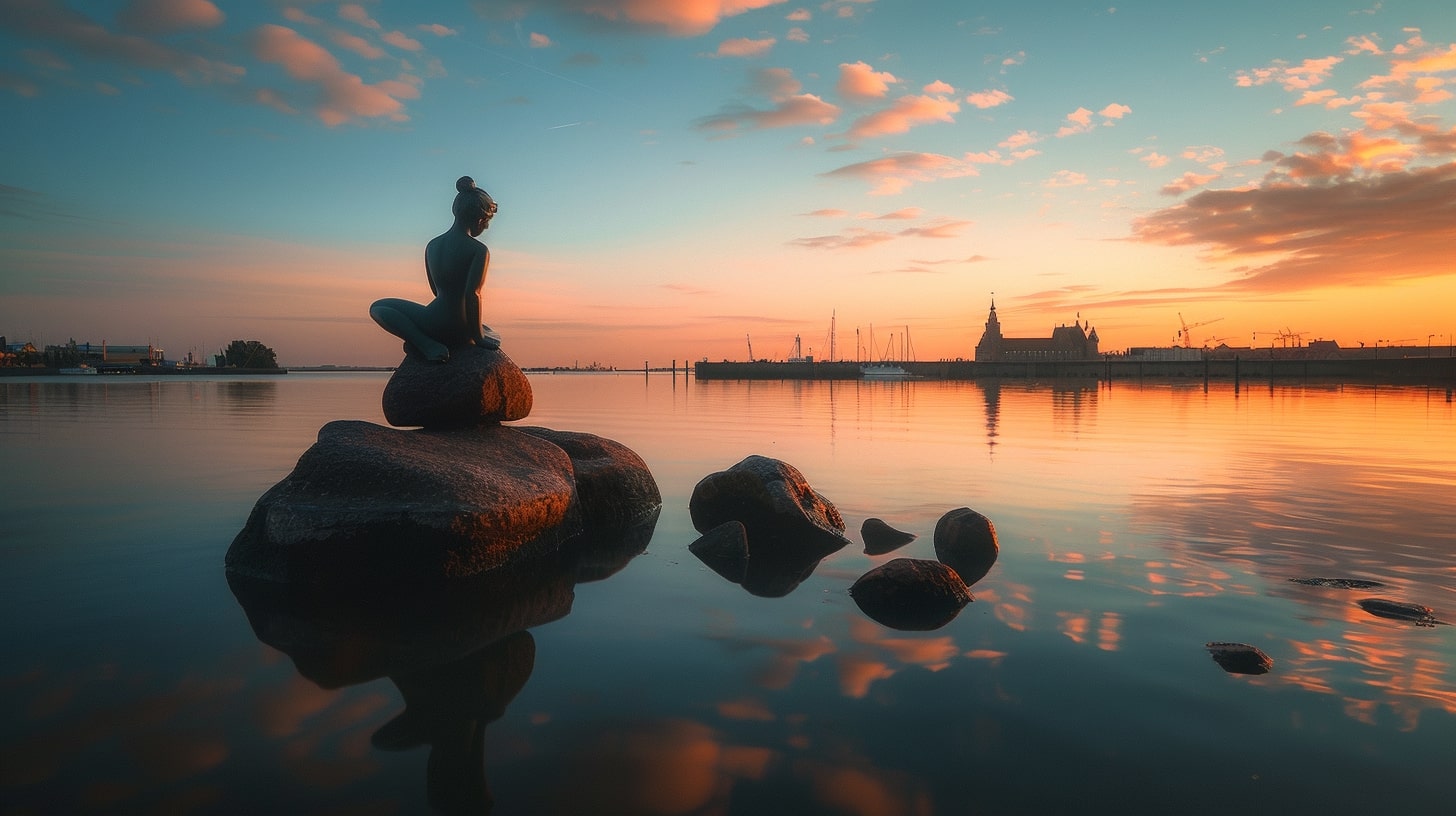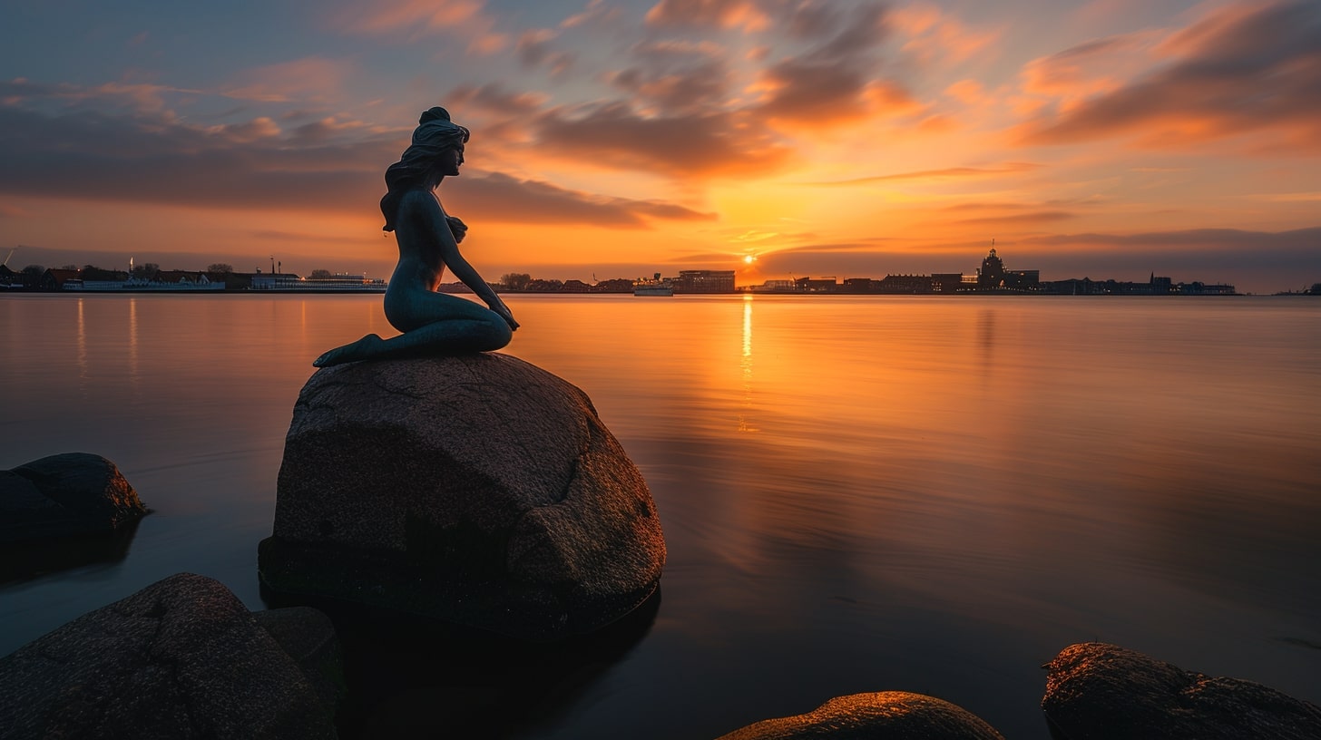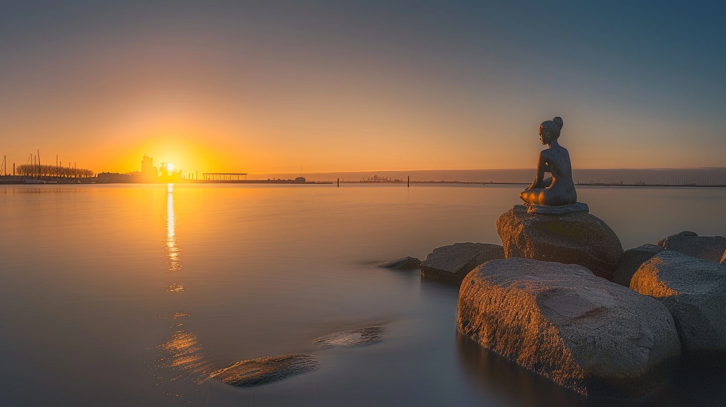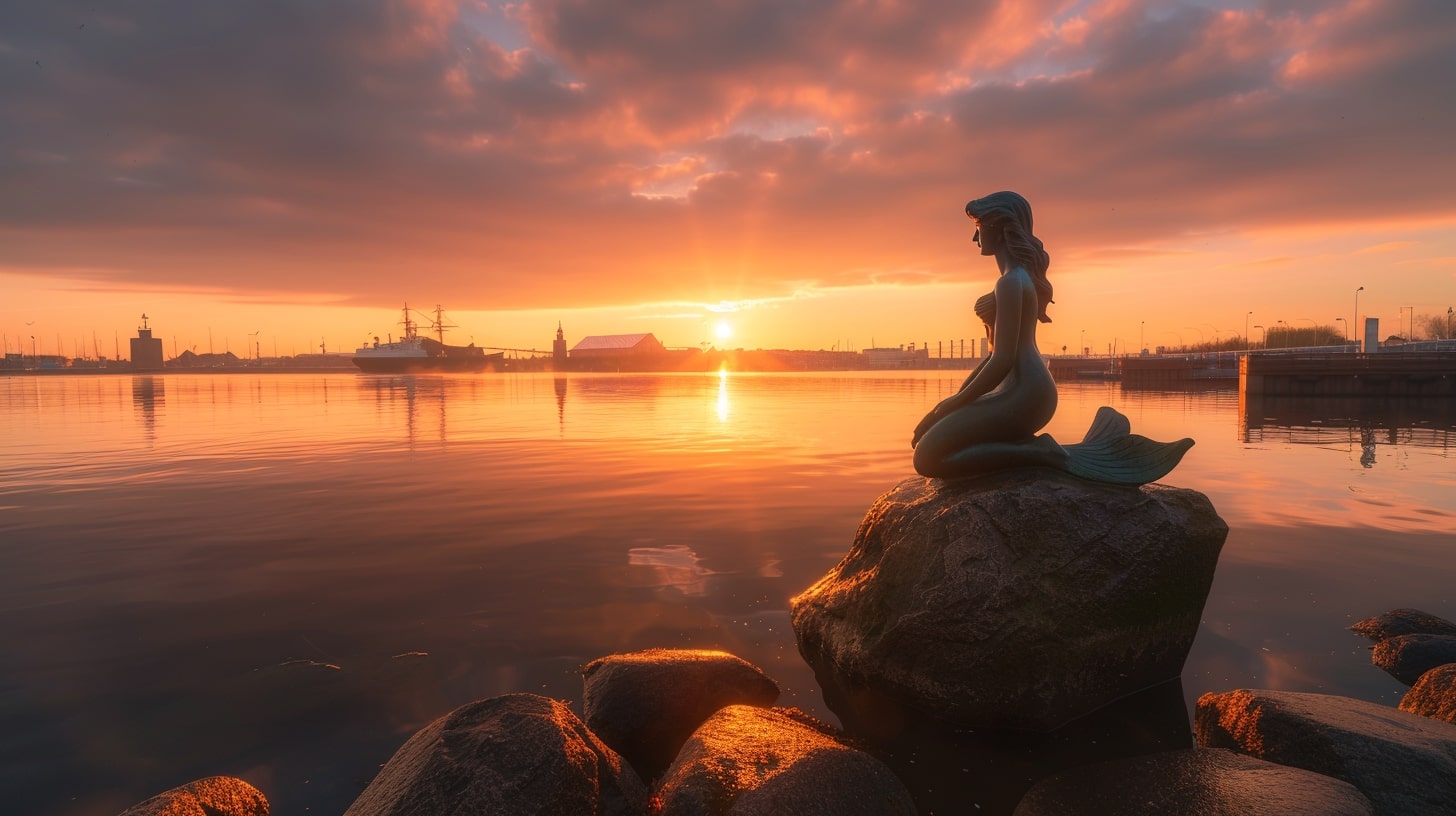 The Little Mermaid statue in Copenhagen, Denmark, captured at sunrise with a golden hue reflecting off the water, the statue sitting gracefully on a rock, surrounded by a calm harbor, professional landscape photography, Nikon D850, 24-70mm f/2.8 lens, ISO 100, f/8, 1/200s --ar 16:9